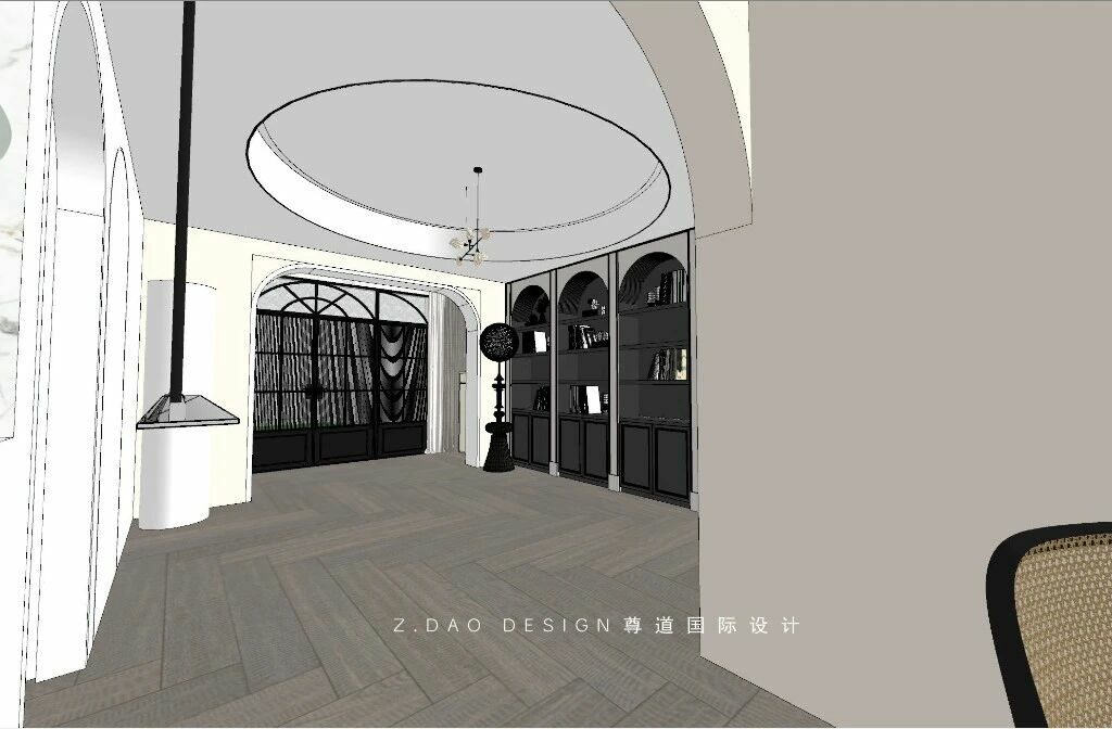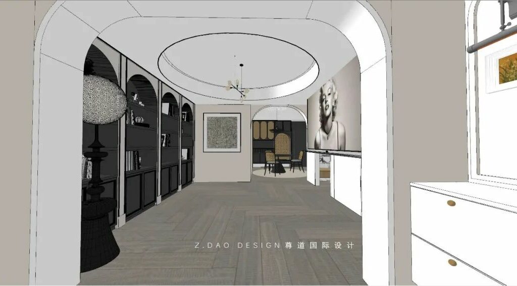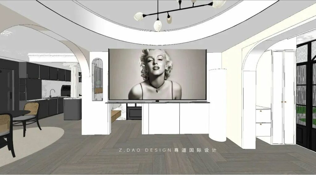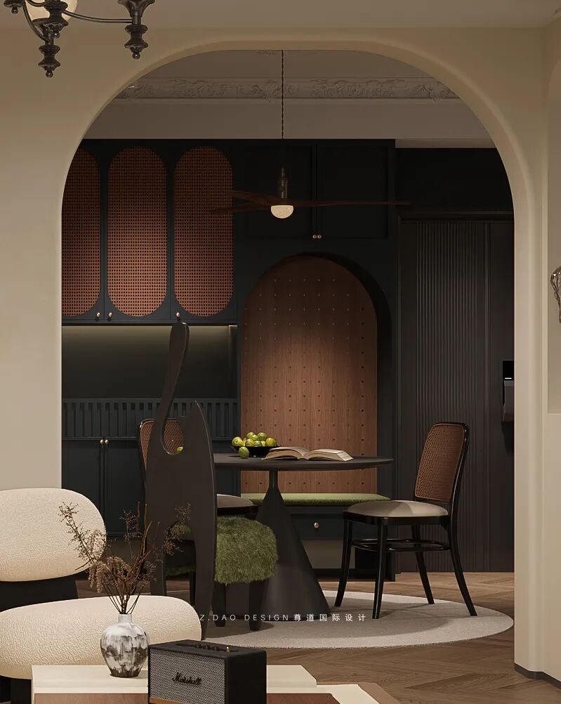 客厅、餐厅、厨房与走廊,构成流畅的生活动线,同时通过家具和建筑结构的巧妙布局分隔出不同功能区域。借用原有顶面梁体结构设计弧形垭口,弱化顶面梁的同时,与餐厅顶面弧形和立面垭口门洞交相呼应。