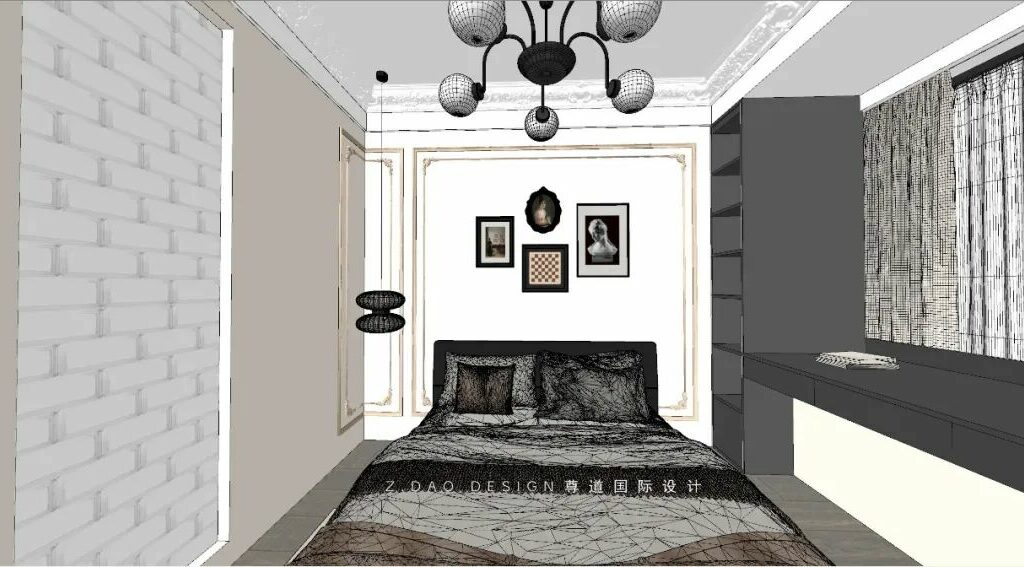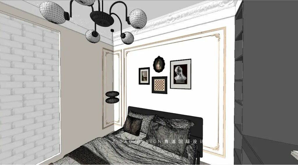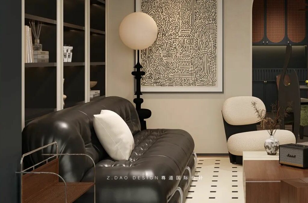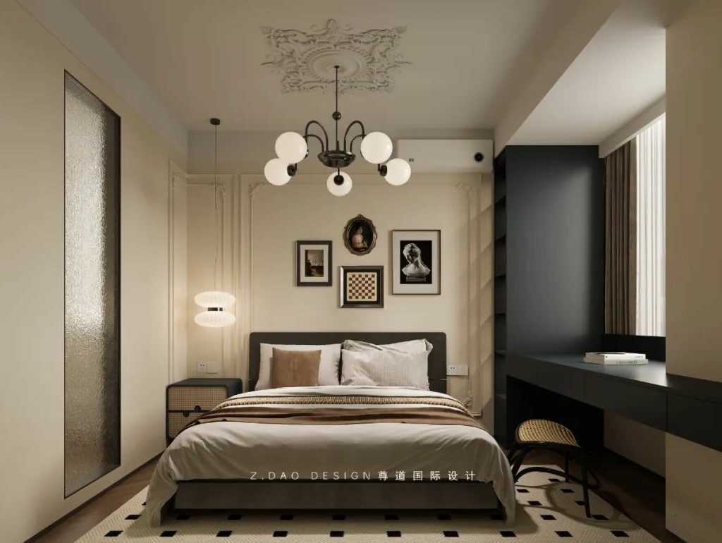 床头背景石膏线条的设计、挂画的精心挑选、黑白地毯的搭配与屋内线条形成对比,加强了空间的层次感,为空间增添了艺术气息。
