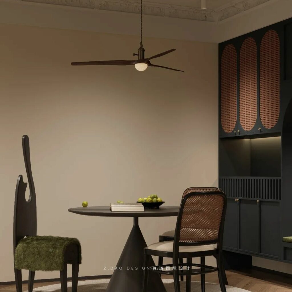 复古吊扇吊灯,成为空间的焦点,其有机形态结合柔和的光线为居室增添了艺术气息。辅以隐藏在横梁内的照明及墙壁上方向的筒灯,营造了平静且舒适的室内光环境。