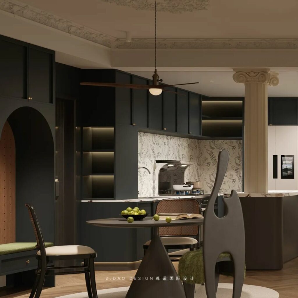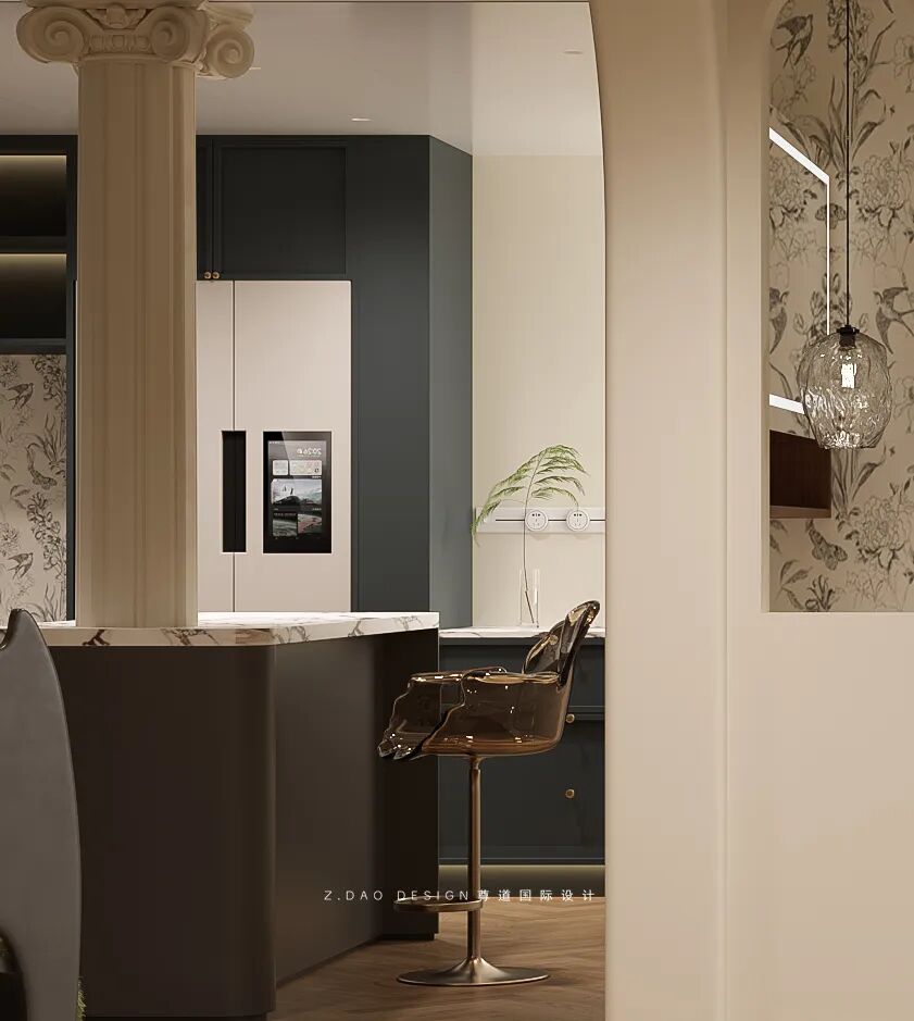 通过设计罗马柱将原有管道包裹,使得餐厅与厨房区域的风格和谐统一。
