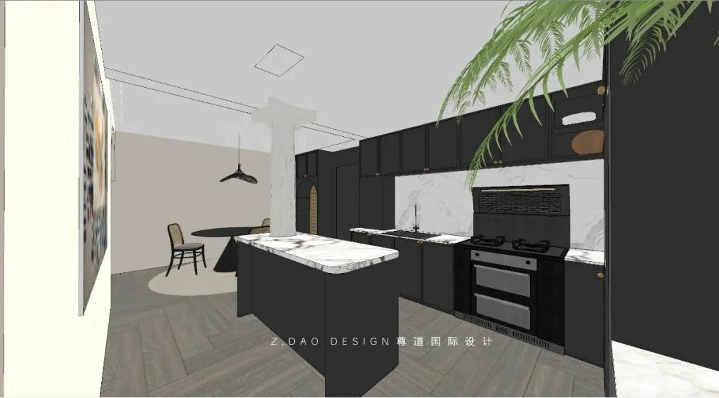 开放式厨房设置岛台,提供了额外的台面操作区域,拓展厨房的工作空间,让厨房与餐厅连接起来,提供了一个便于互动和交流的公共区域。