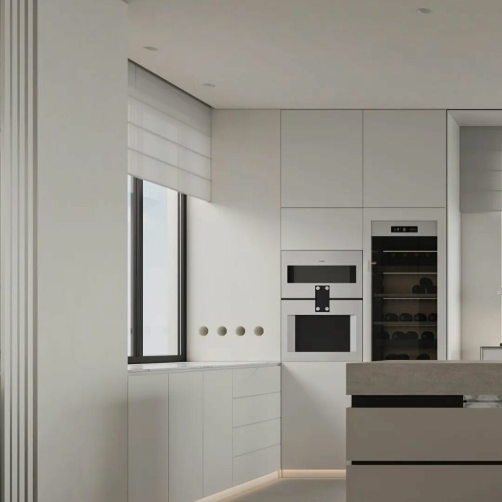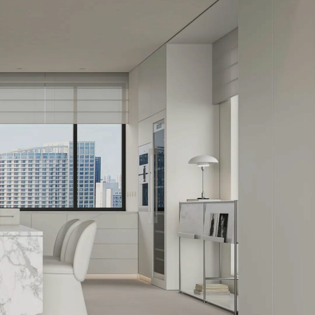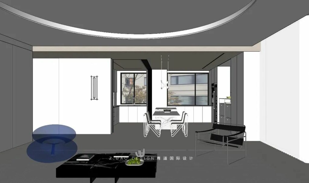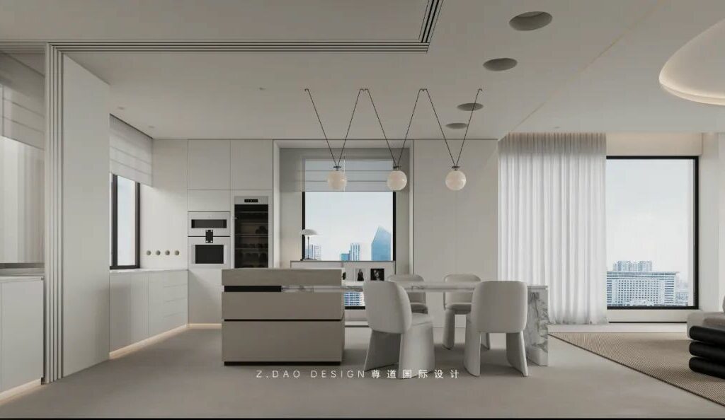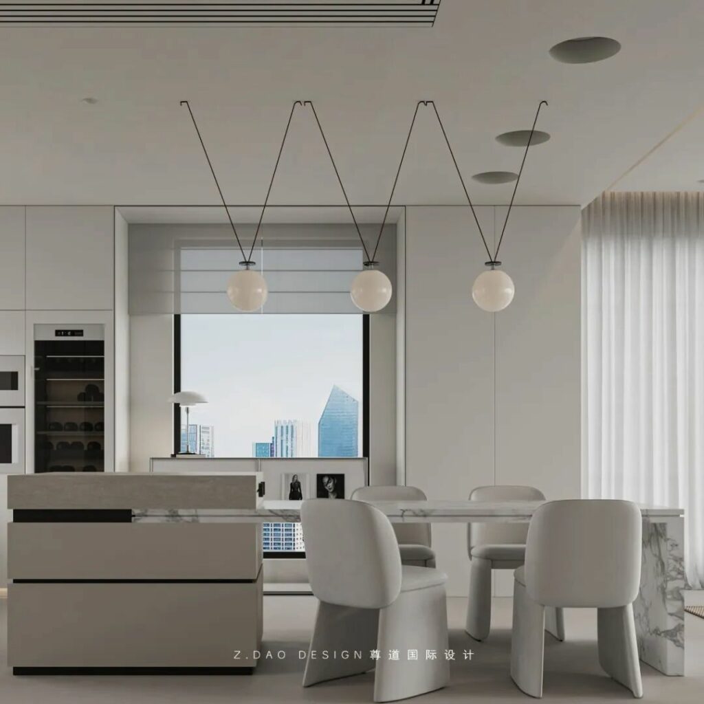 岛台餐桌与沙发相望并通过空间互相连结,既满足了中厨的爆炒需求同时也满足了西厨家庭中的社交属性,客厅的落地窗户所带来的光线给予空间更为开阔的视觉感受,包括智能家具的整合使得人居舒适度与效率大大提升,同样也使得家成为一个整体,一个情感的容器而不是一个功能分割的盒子。