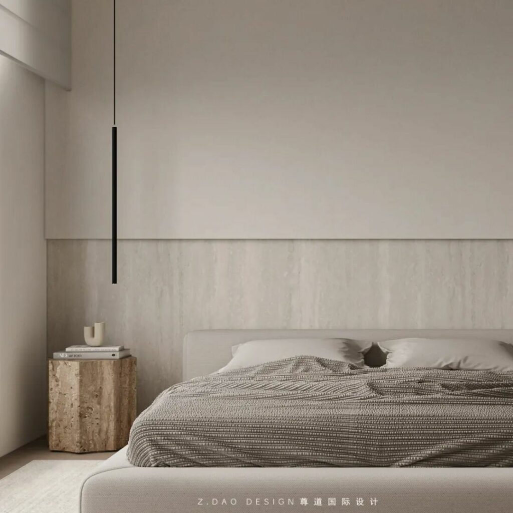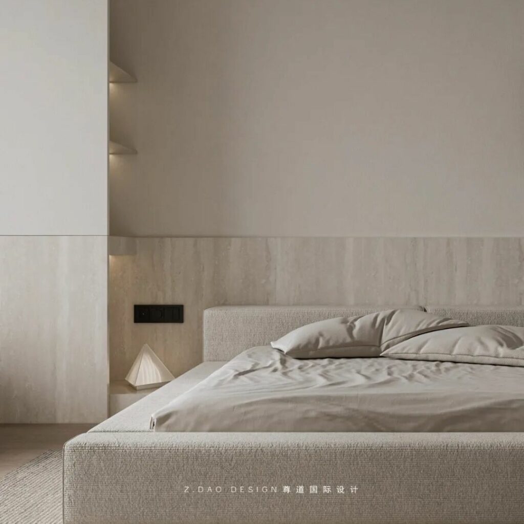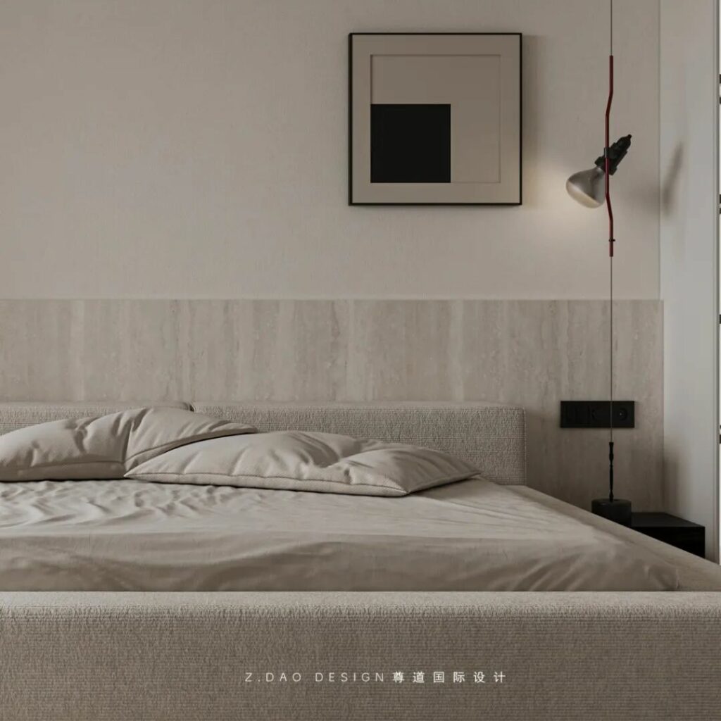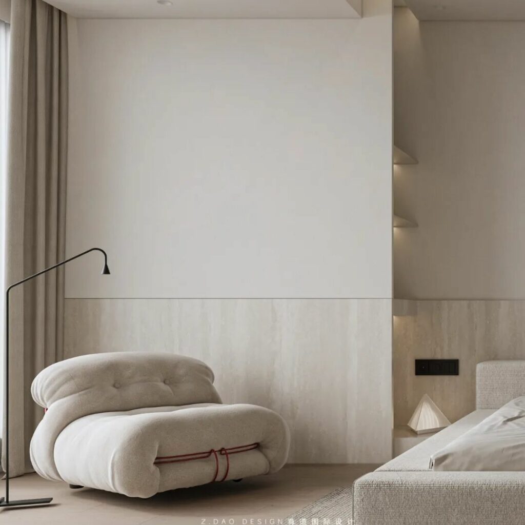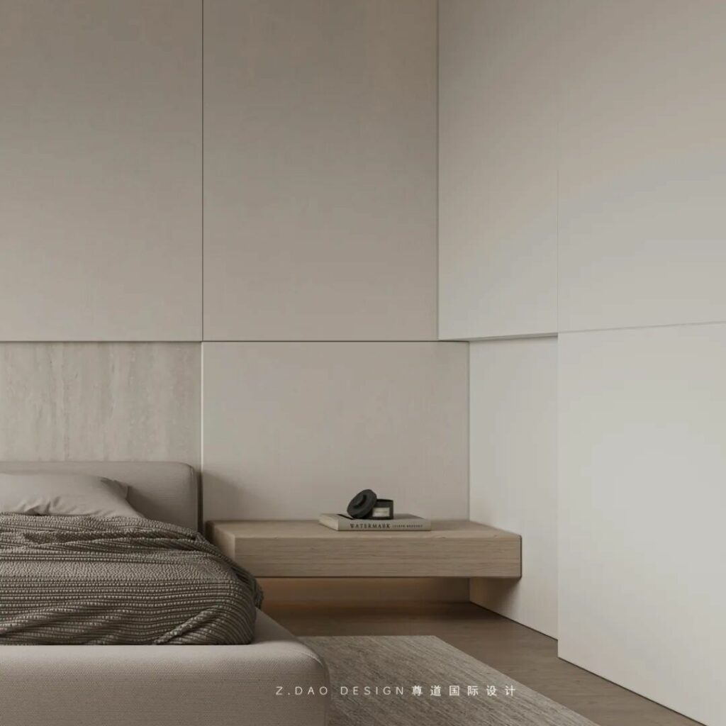 在这个命名为《余白》的主卧中,原木墙是墨,白沙发是砚,灰地毯则是半干的宣纸——那些未被填满的角落,正是生活自己提笔作画的地方。