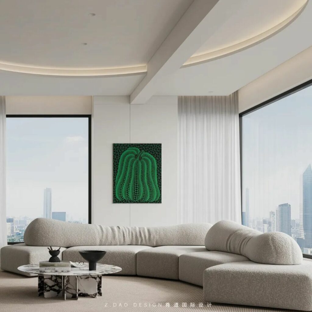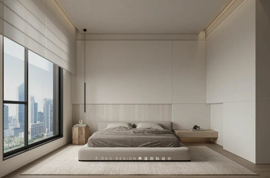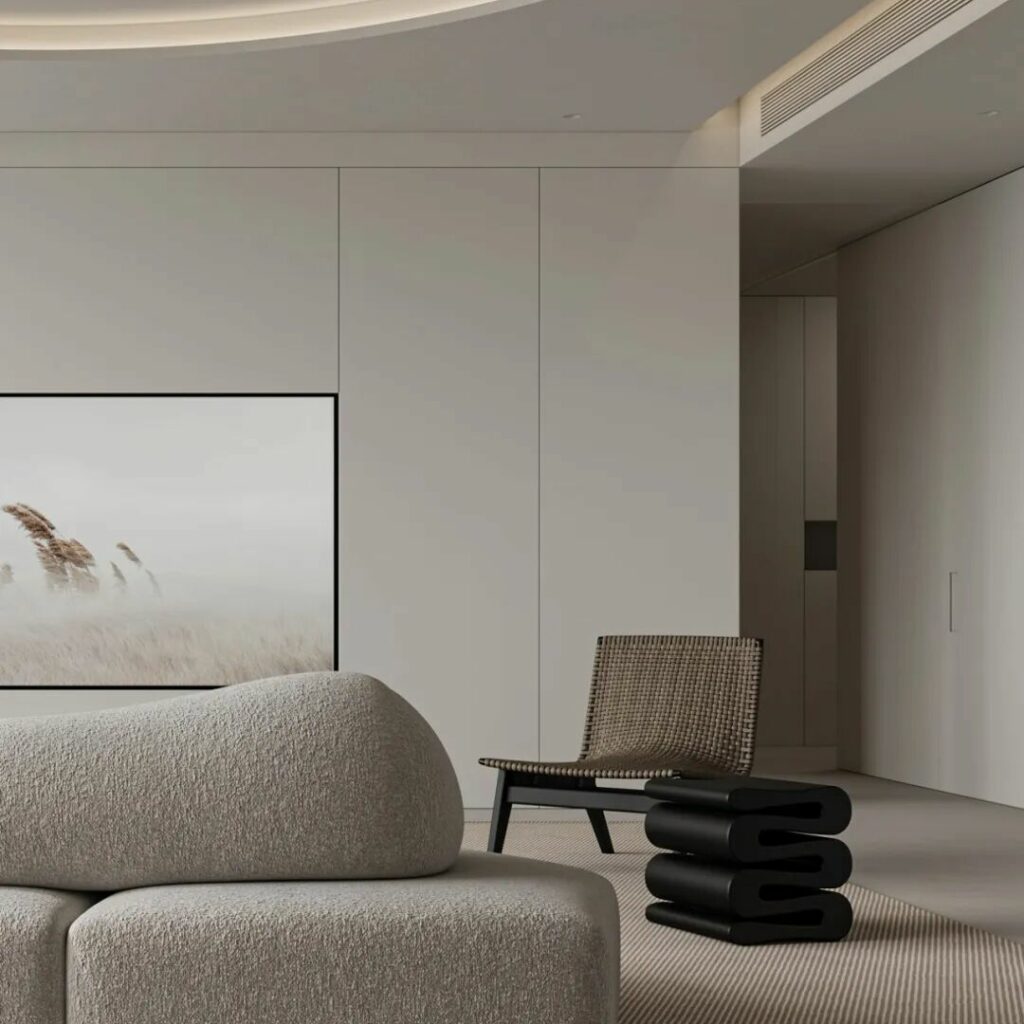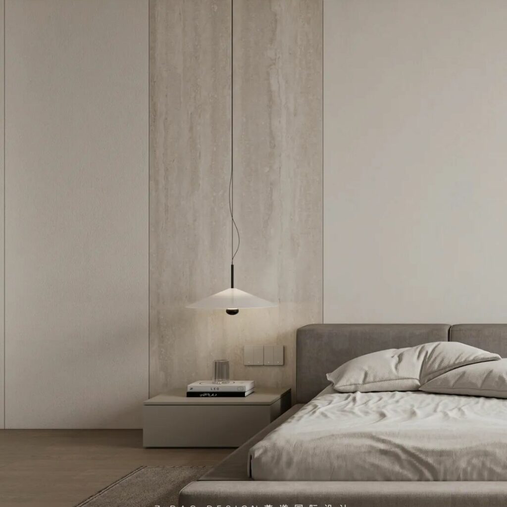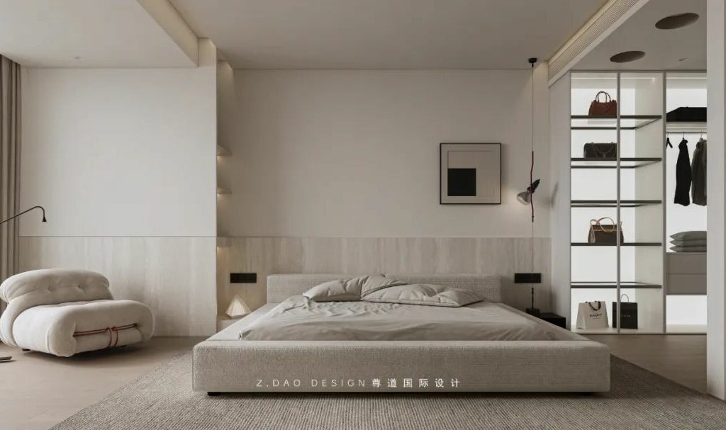 在这个命名为《余白》的主卧中,原木墙是墨,白沙发是砚,灰地毯则是半干的宣纸——那些未被填满的角落,正是生活自己提笔作画的地方。
