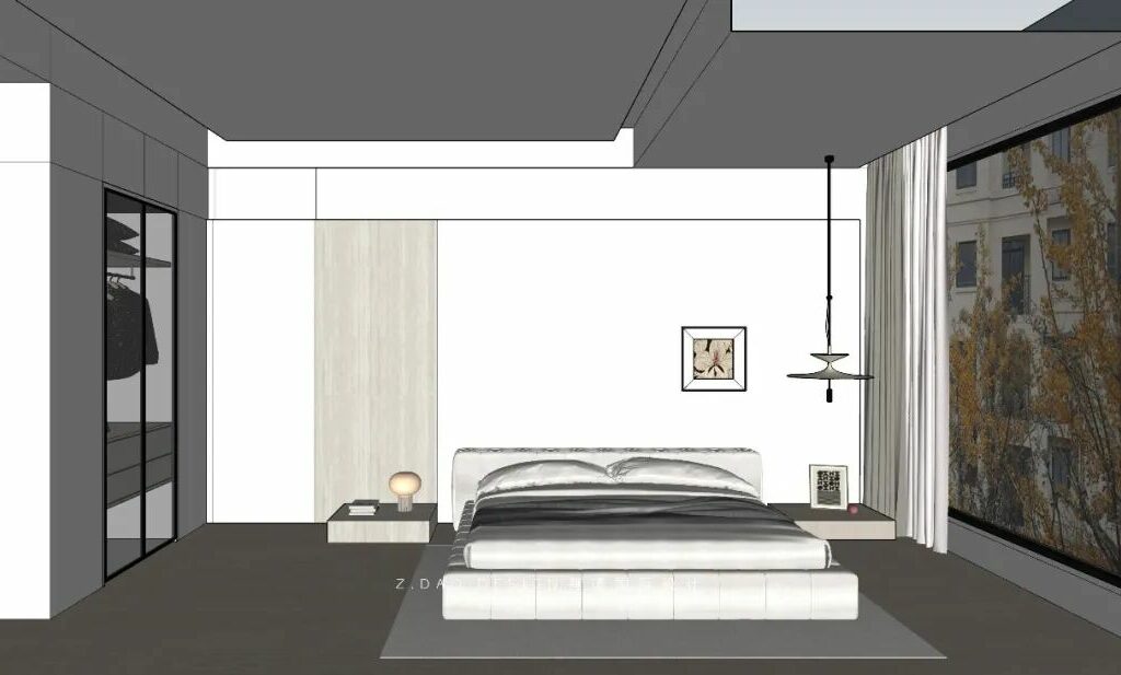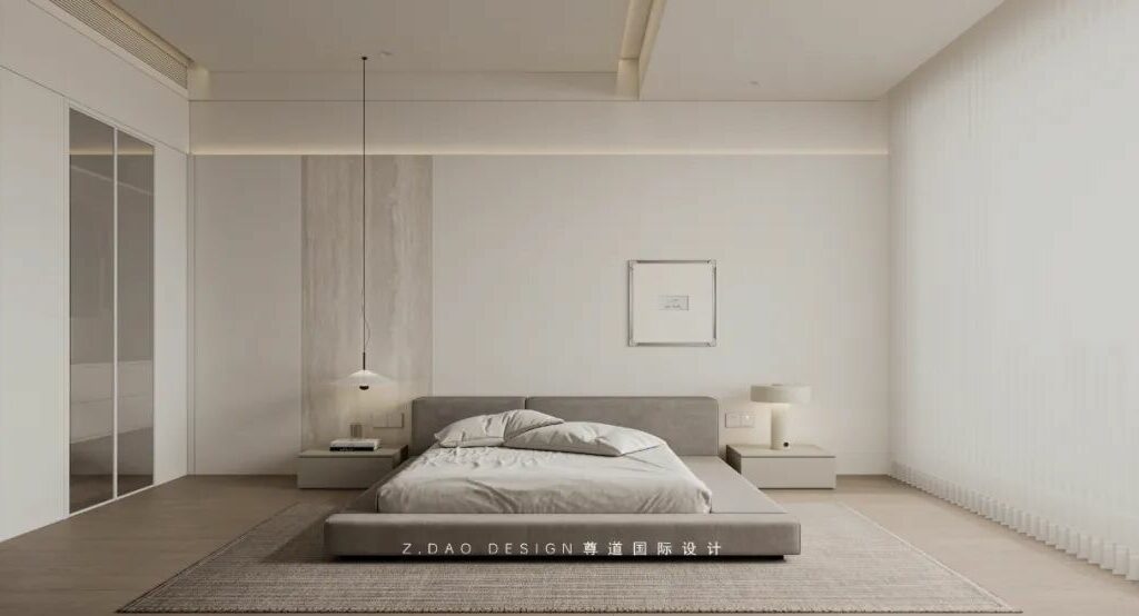 主卧室设计用灰、木、白构成的诗意场景,地毯比墙面深20%的灰度,所形成的稳定感受,局部的镂空书柜与空间形成松紧有序的节奏感,白色沙发承担着休憩闲暇的功能,在空间中也是起到过渡的作用。