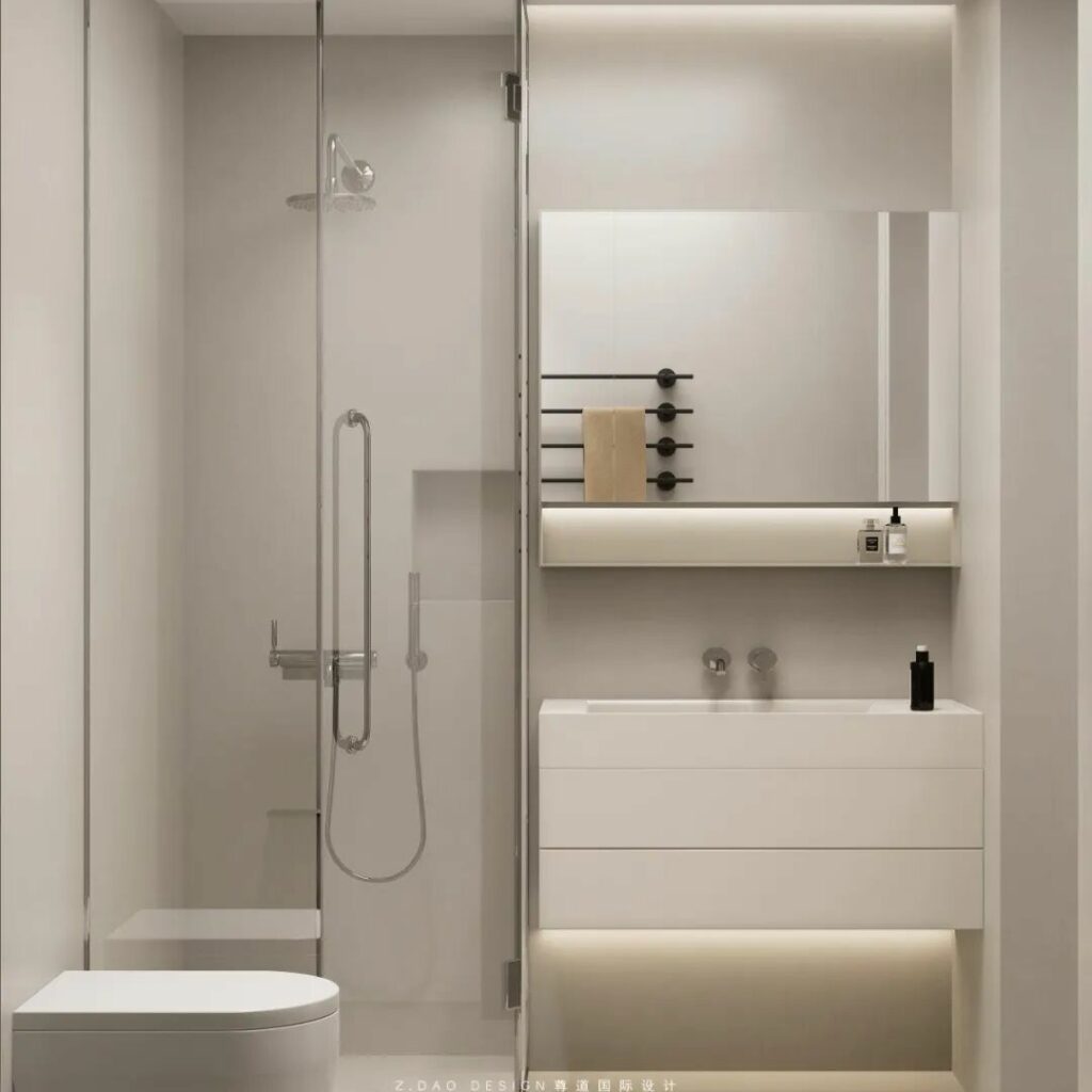 入户门的右侧卫生间,依旧延续着空间中统一的色调与氛围,贯彻题案余白所诉说的理念,简约的同时不失其本色,所带来的功能上的阐述皆无所缺。且不突兀不过分强调,无论是同色系的浴室柜亦或是洗烘干机都体现着其本质之味,恍若一体。同时也散发着现代人居生活空间的理性气息。