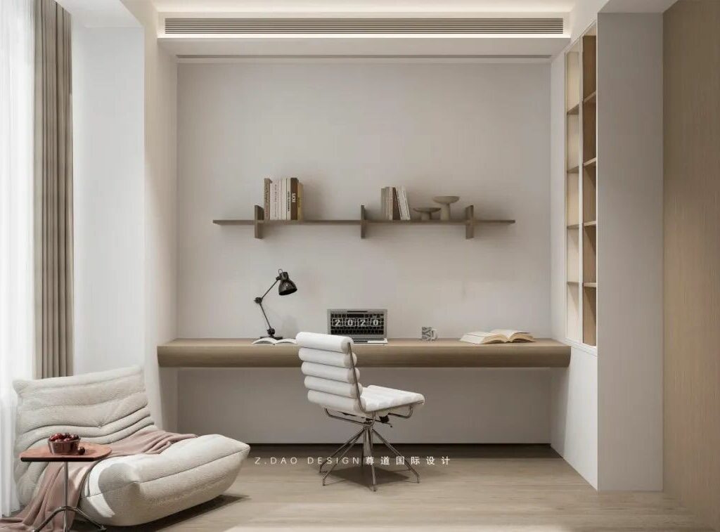 现代极简与自然疗愈的书房空间。让人身处其间能够体会到更为纯粹的阅读体验,纱帘滤入柔光,让整个空间成为一座文字温室。