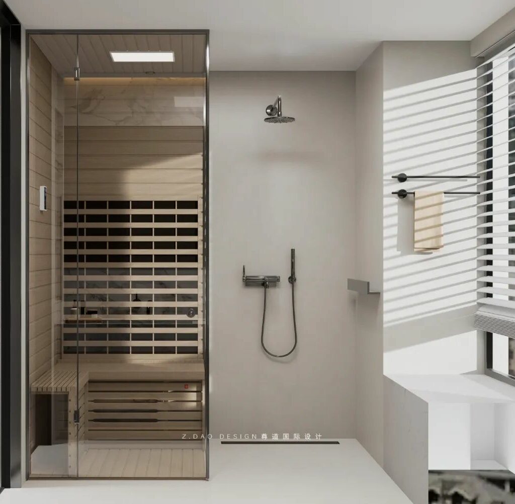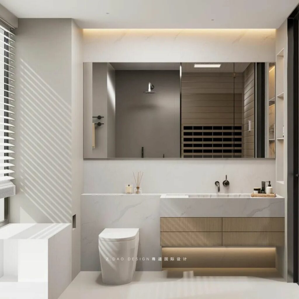 主卧卫生间兼具仪式感与功能性的私密SPA空间。两块方镜融入灰木白的空间中,与桑拿房的格栅木形成一种秩序美,镜子在其中起到了理性之眼与诗意之眼的作用,将功能构建转化为情感载体。