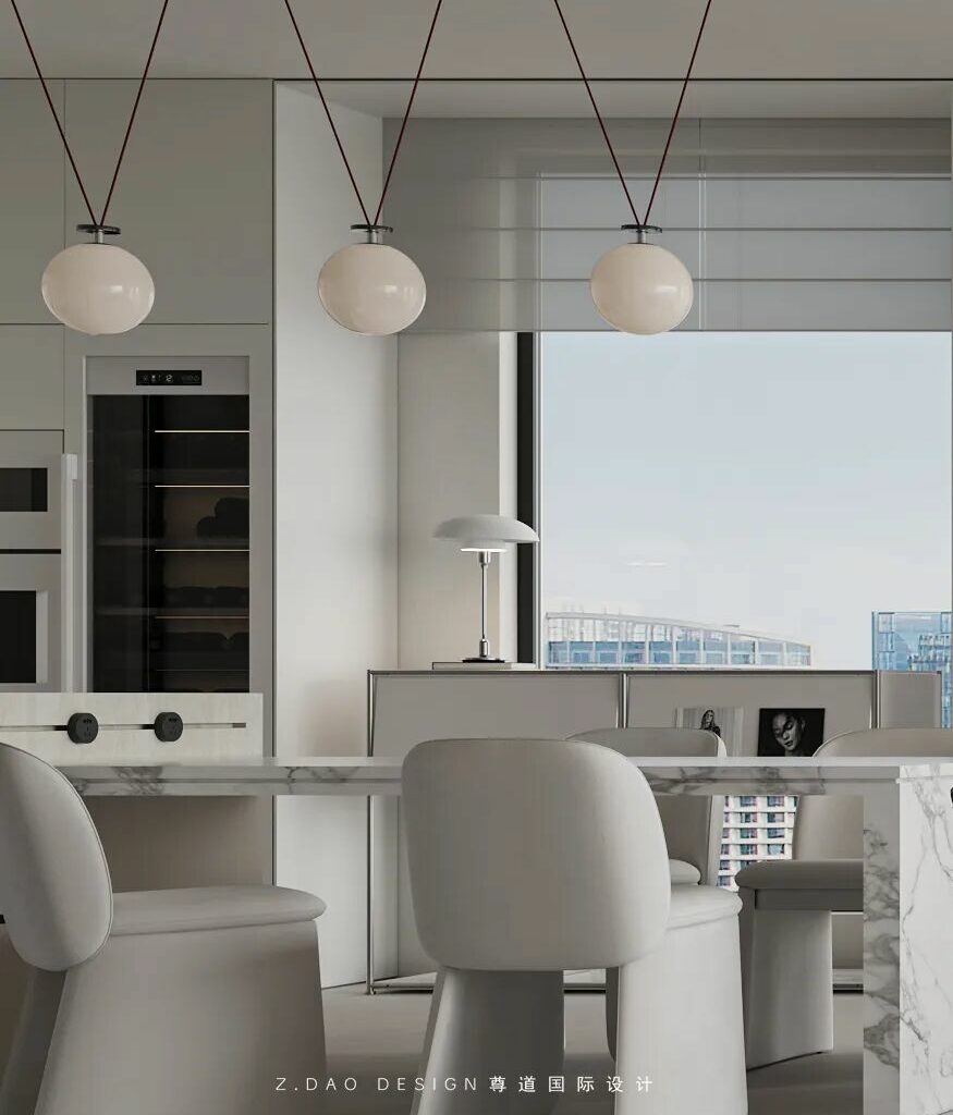 烹饪区采用稍冷的白色,以此来增添一定的清洁感,给人带来感官上更为适宜的体验,餐厅采用与客厅的同色系,造成视觉上的延伸感,静音移门使空间隔断,使得开放式的厨房具有合规性,让油烟与美学达成和解。促成功能分区的显性形成,餐岛一体的设计,简化步骤。