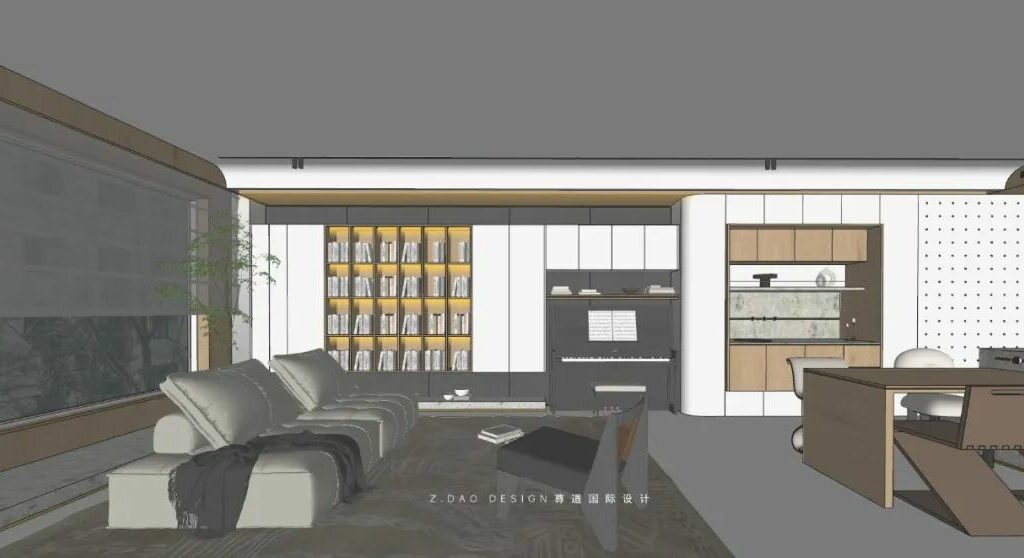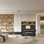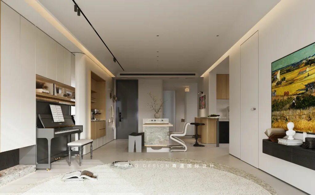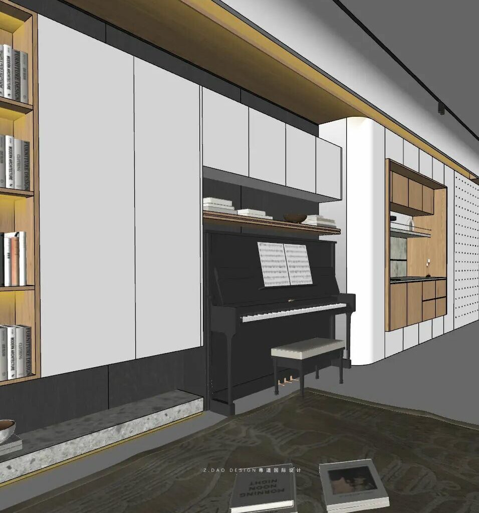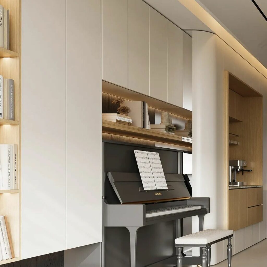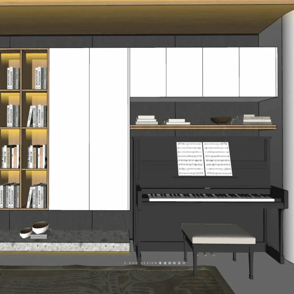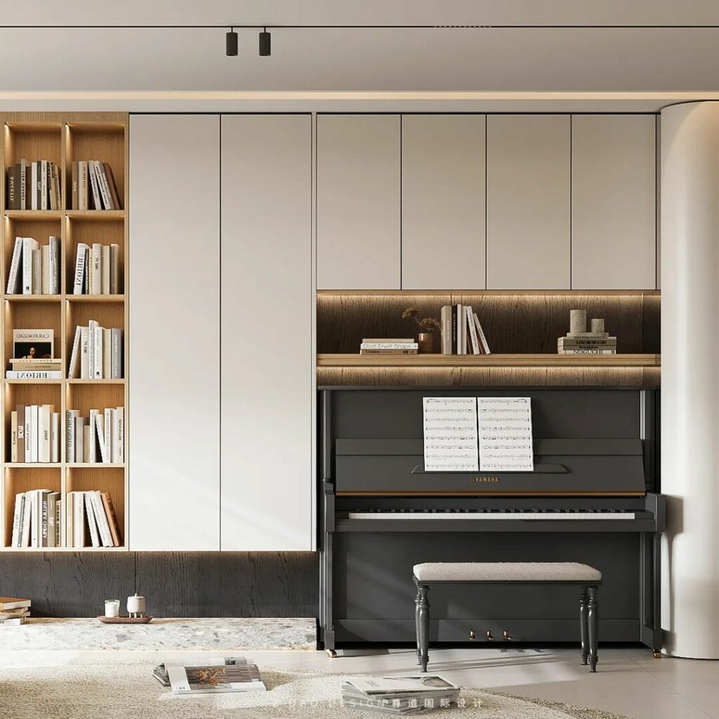 将钢琴嵌入柜体中,不会显得突兀且节省单独摆放的空间。琴房+客厅书房,既节省空间又能将艺术氛围和功能性拉满。
