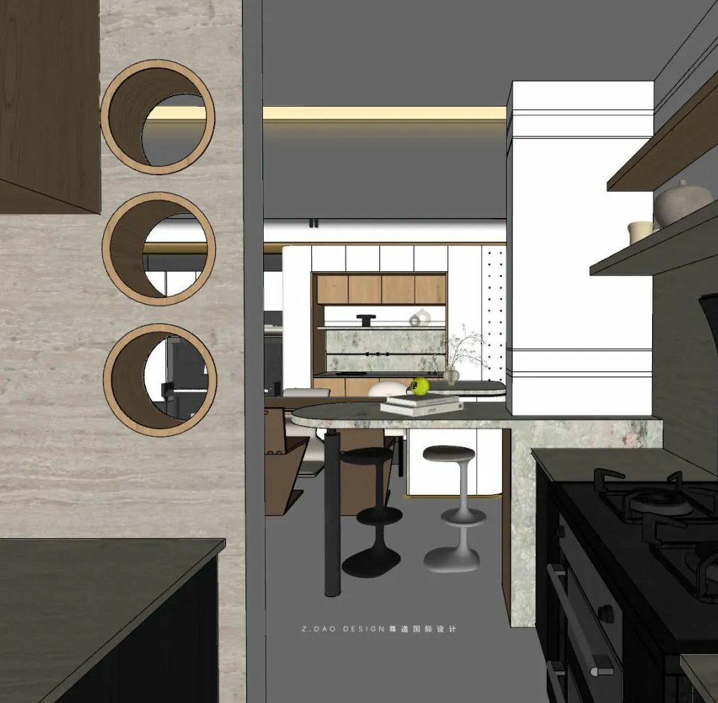 细节处理上我们在砌筑的墙体上开了三个洞,这是一个趣味性很足的设计,可以透光可以视线的透景。开放式厨房,东边的光线可以引入餐厅,餐厅厨房之间做了吧台,早上可以在这里吃个简餐,也可以作为传菜台,增强家庭成员之间的互动性。