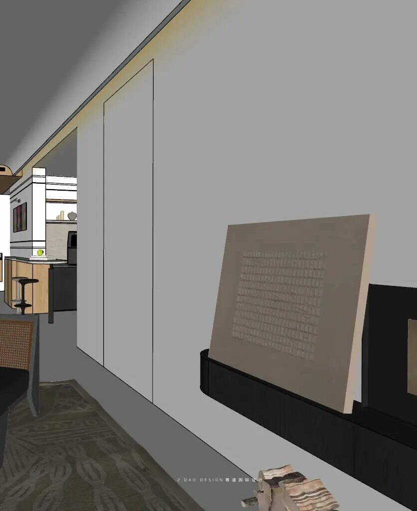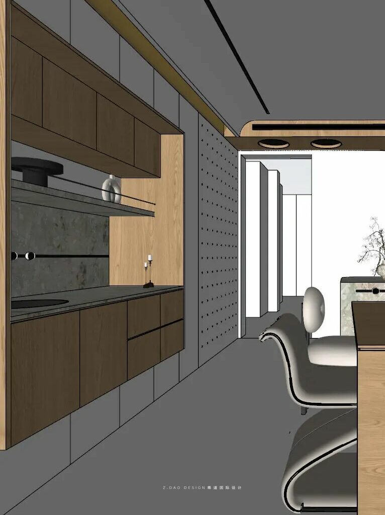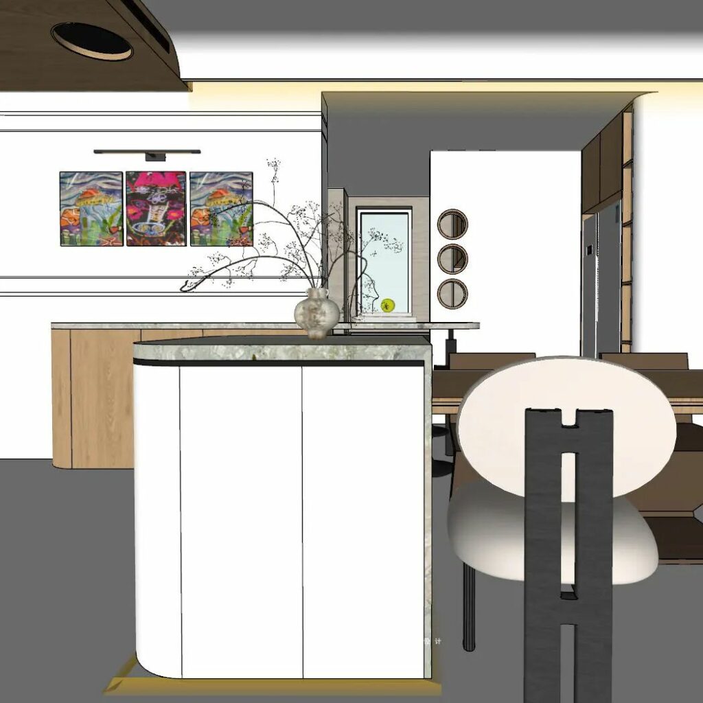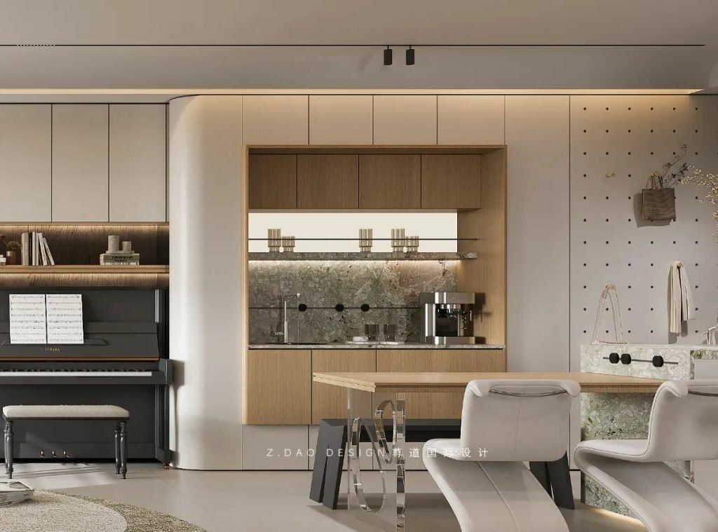餐厅空间我们设计有水吧台、零食柜、发光灯膜的置物架,作为中厨功能的一部分延伸。餐岛一体的设计,有效节省空间,悬浮的中岛,带有感应灯光,通过空间重构,将日常琐碎升华为仪式感体验。