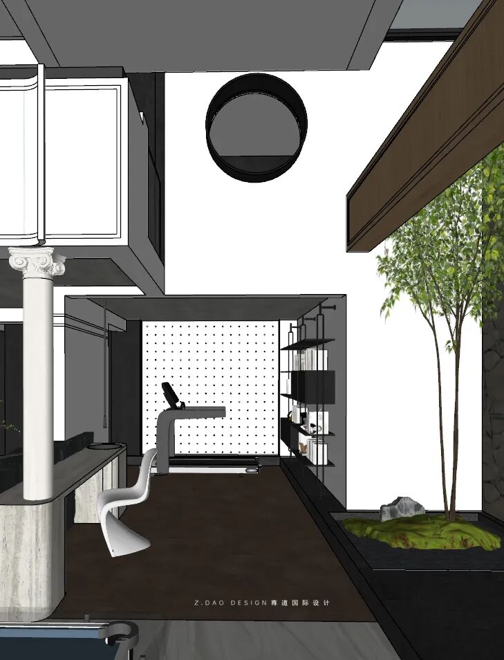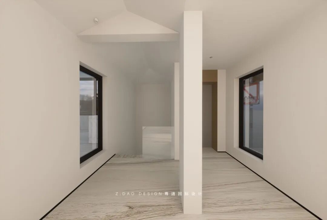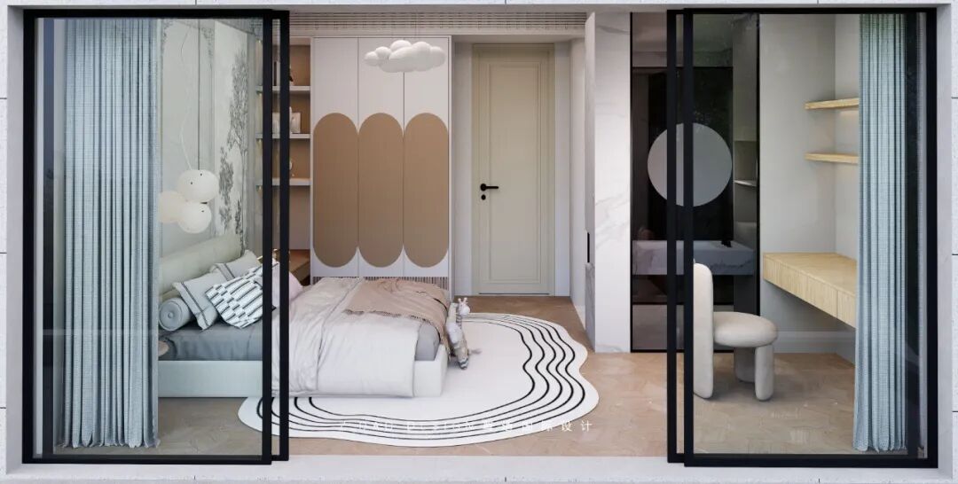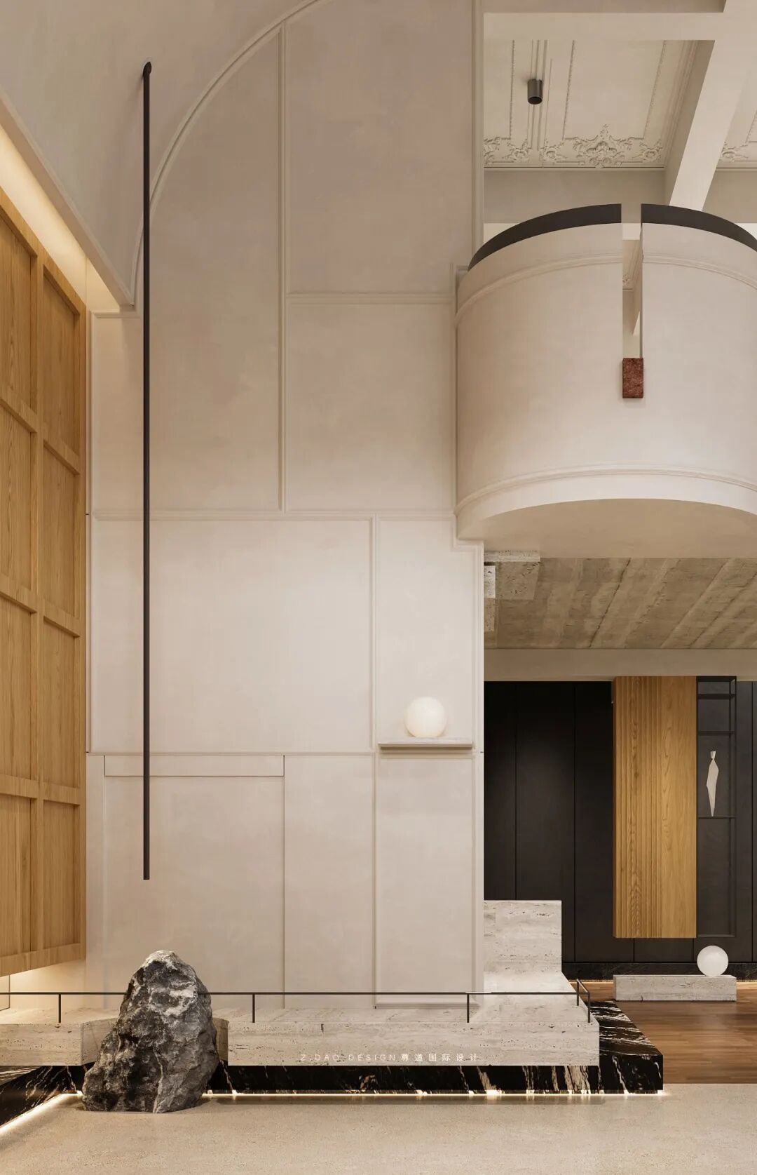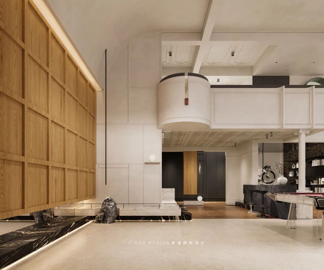 我们在相隔的挑空区域墙面,切开了一个圆洞,里面是负一层的卧室,让空间有了互动。