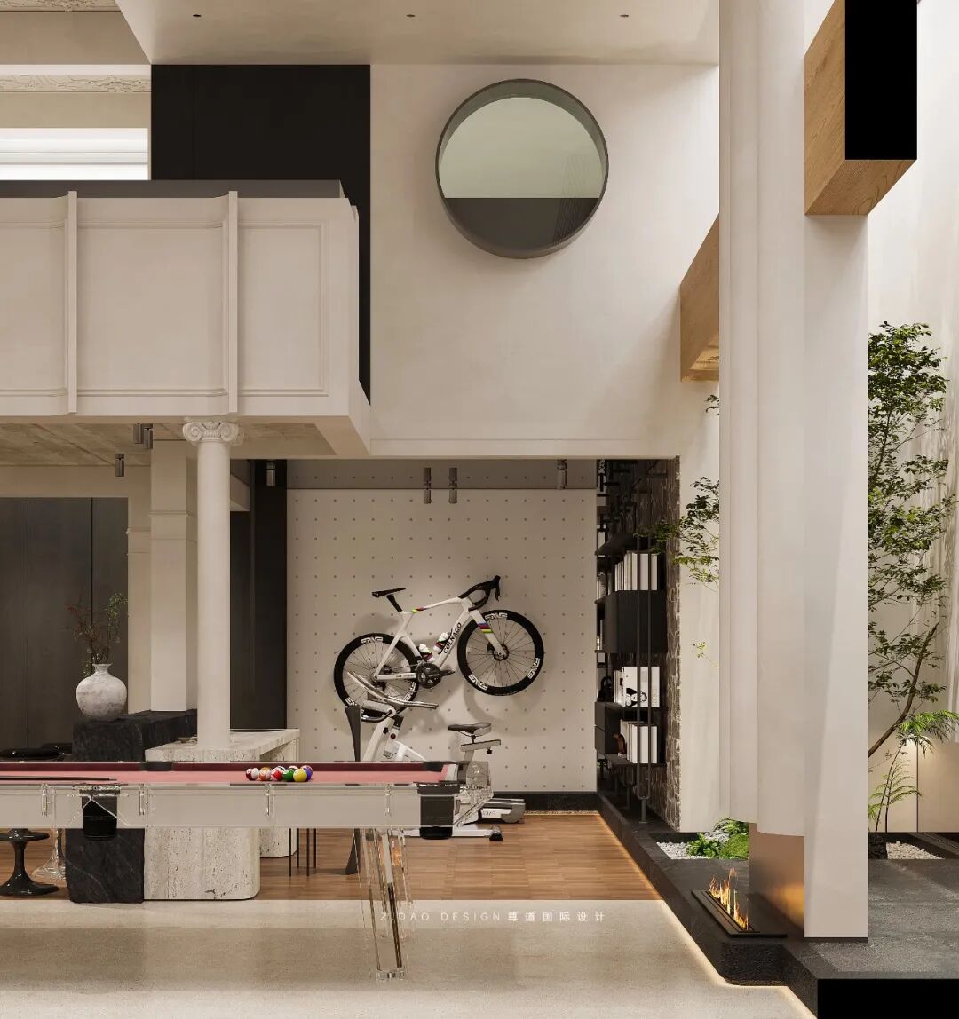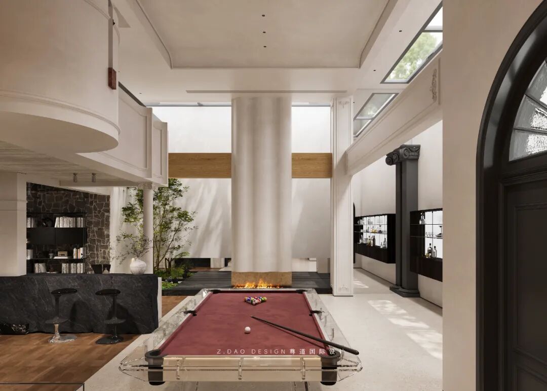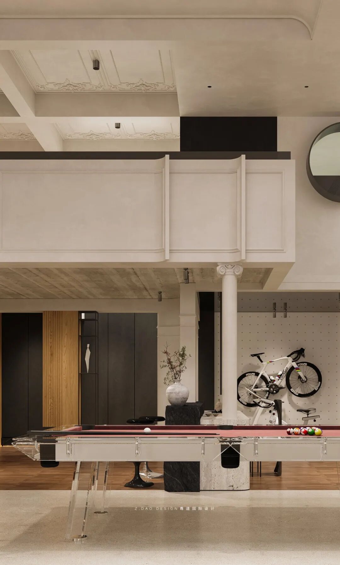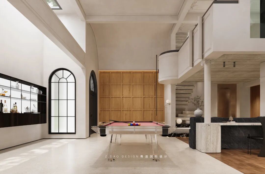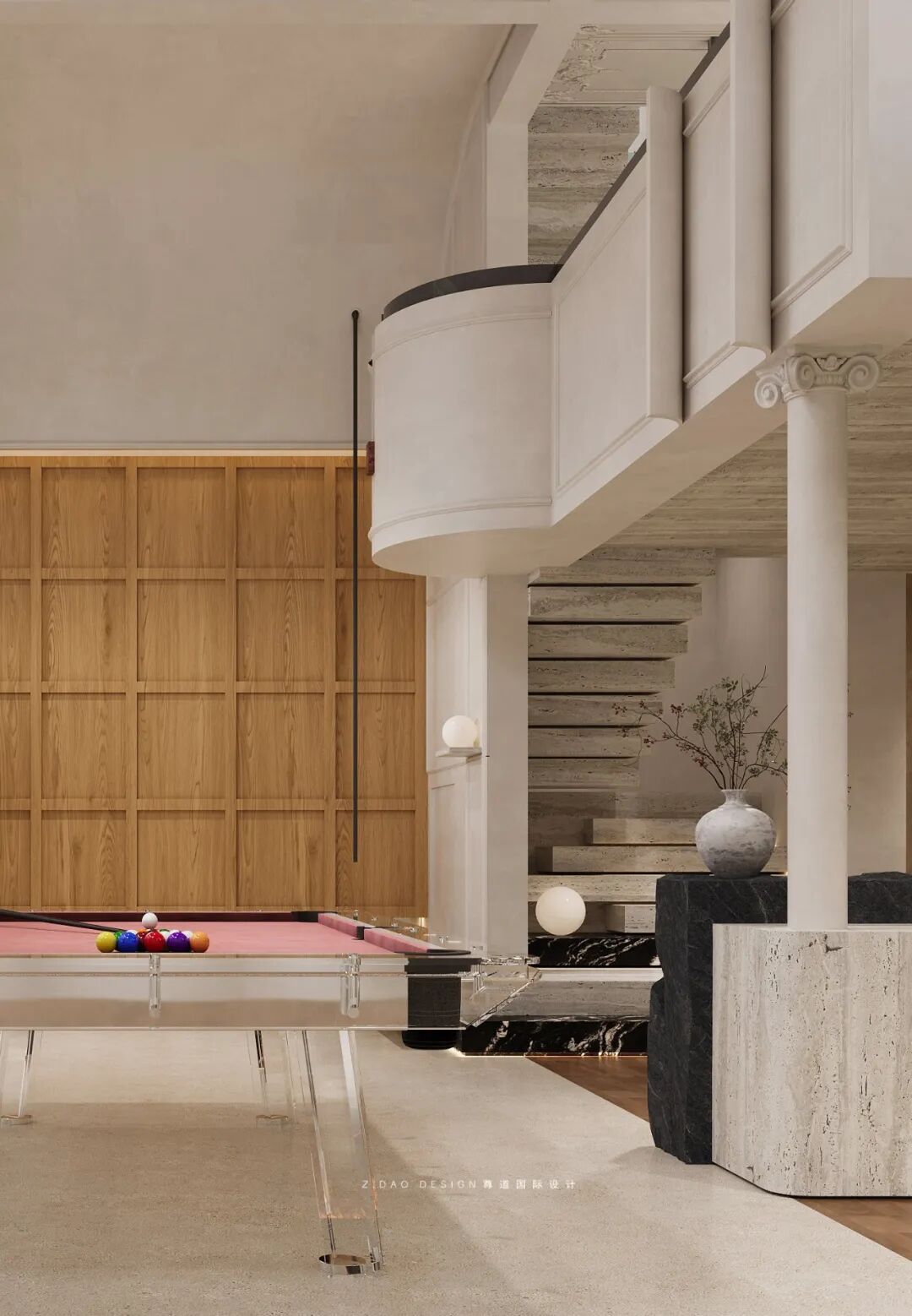 空间的功能根据业主的需要做个性化设计,挑空的台球区,是生活的延展,私人的乐园。在这里三五好友一起聊天一起打球,大宅生活所拥有的快乐触手可及。