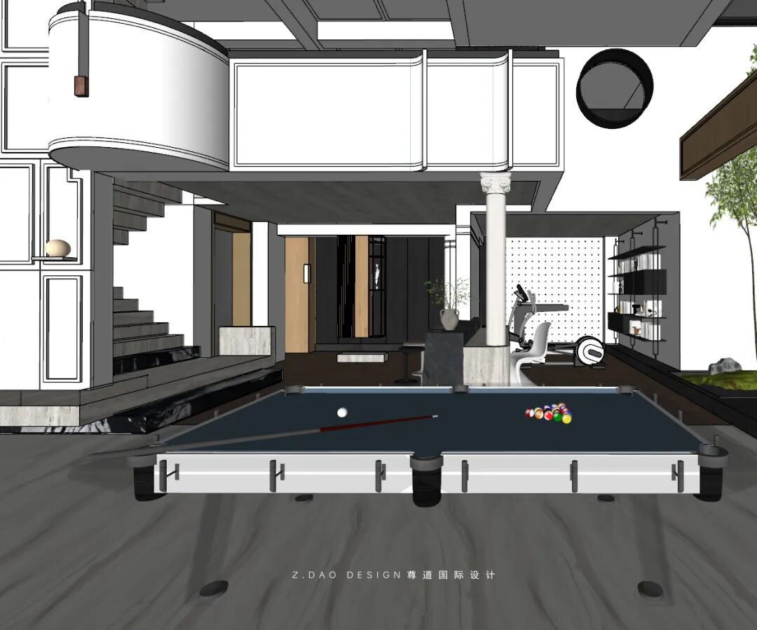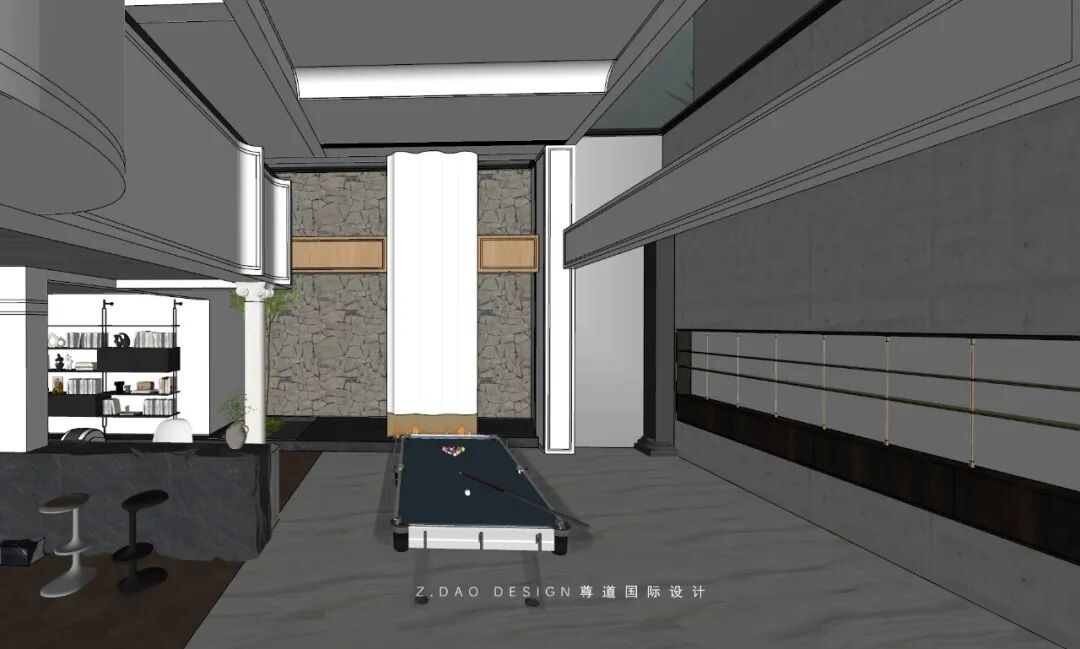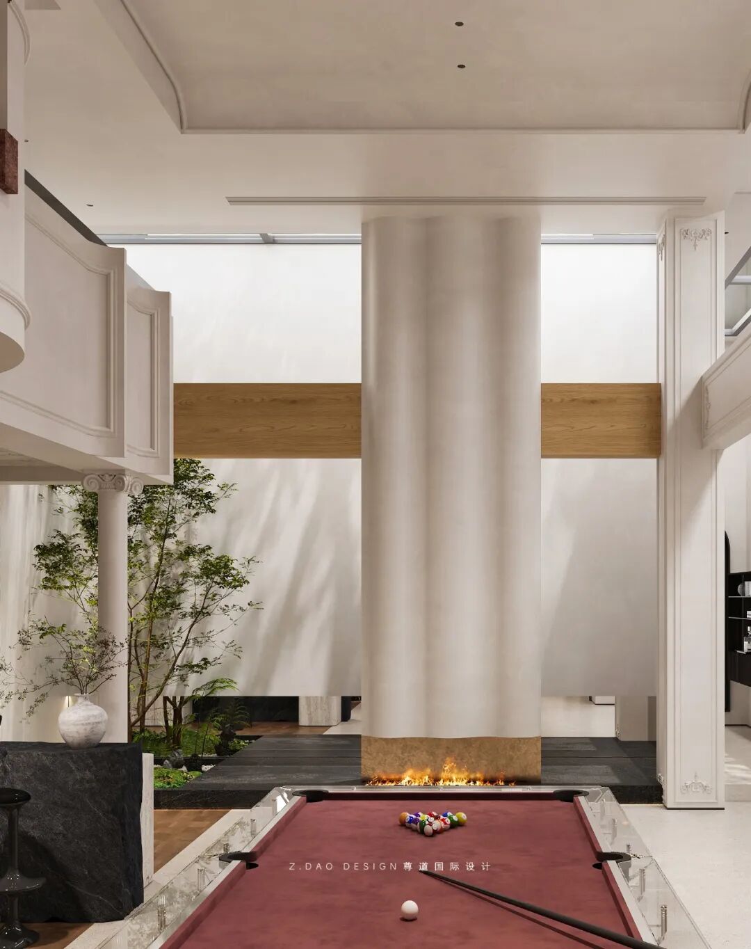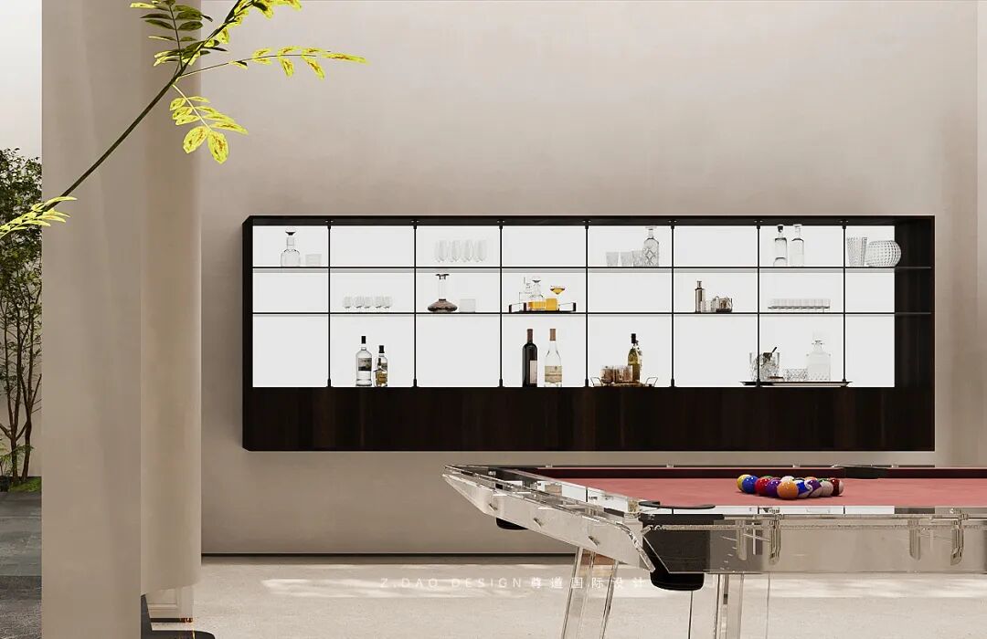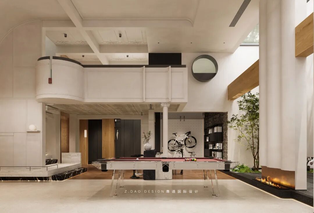空间的功能根据业主的需要做个性化设计,挑空的台球区,是生活的延展,私人的乐园。在这里三五好友一起聊天一起打球,大宅生活所拥有的快乐触手可及。