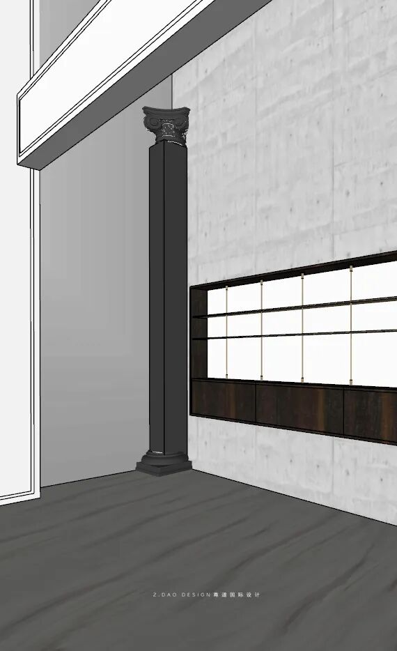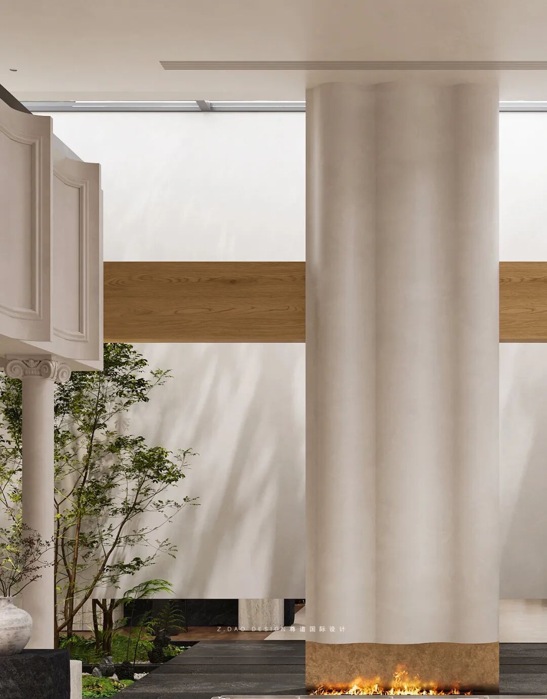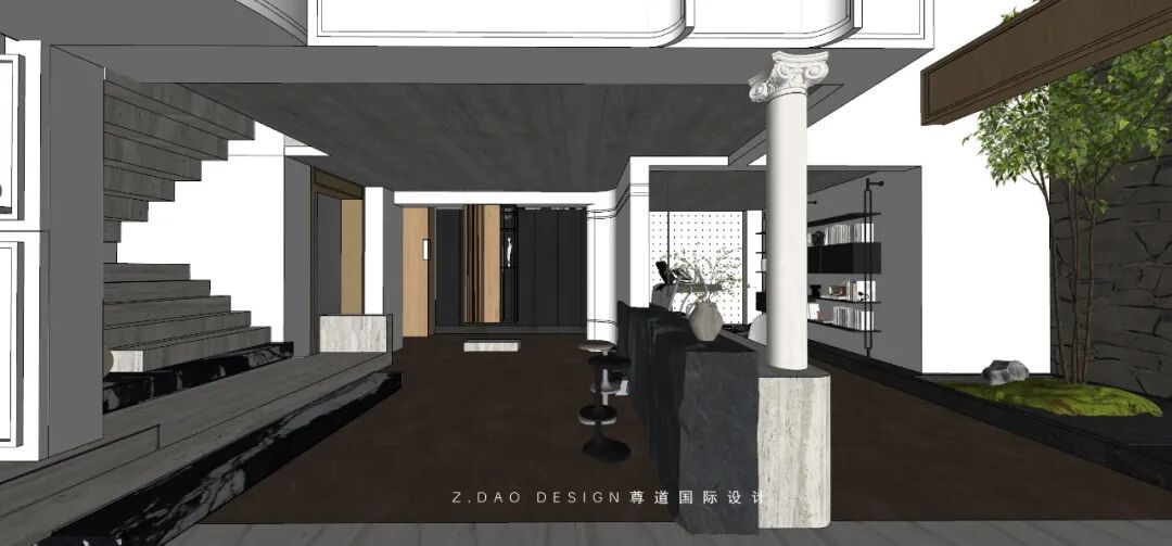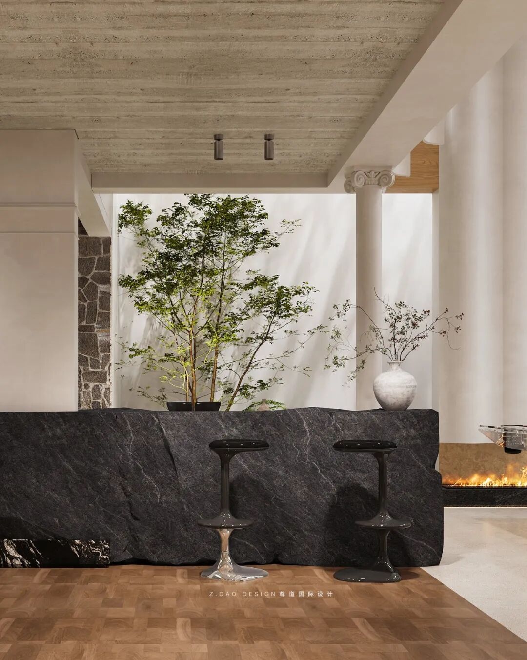 为了支撑隔层的整体空间,我们做了一个柱子,这个柱子我们用了罗马柱的柱头做了装饰,圆柱下方就是业主品茗区,我们用岩石做了茶桌,岩石表面的自然感和天然的纹理,给人一种置身大自然的空间的联想。