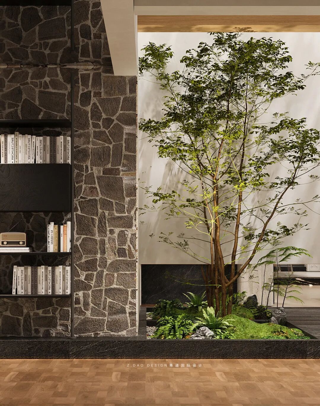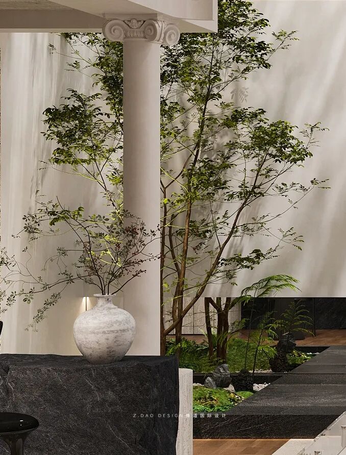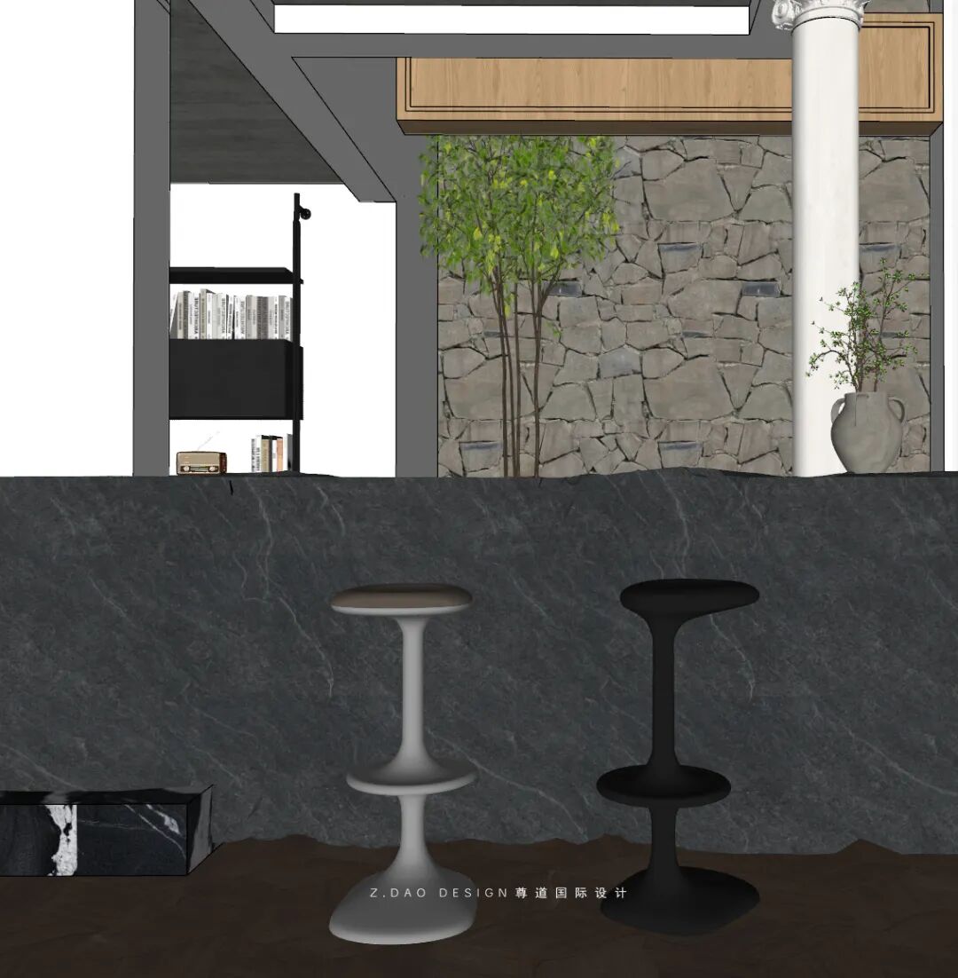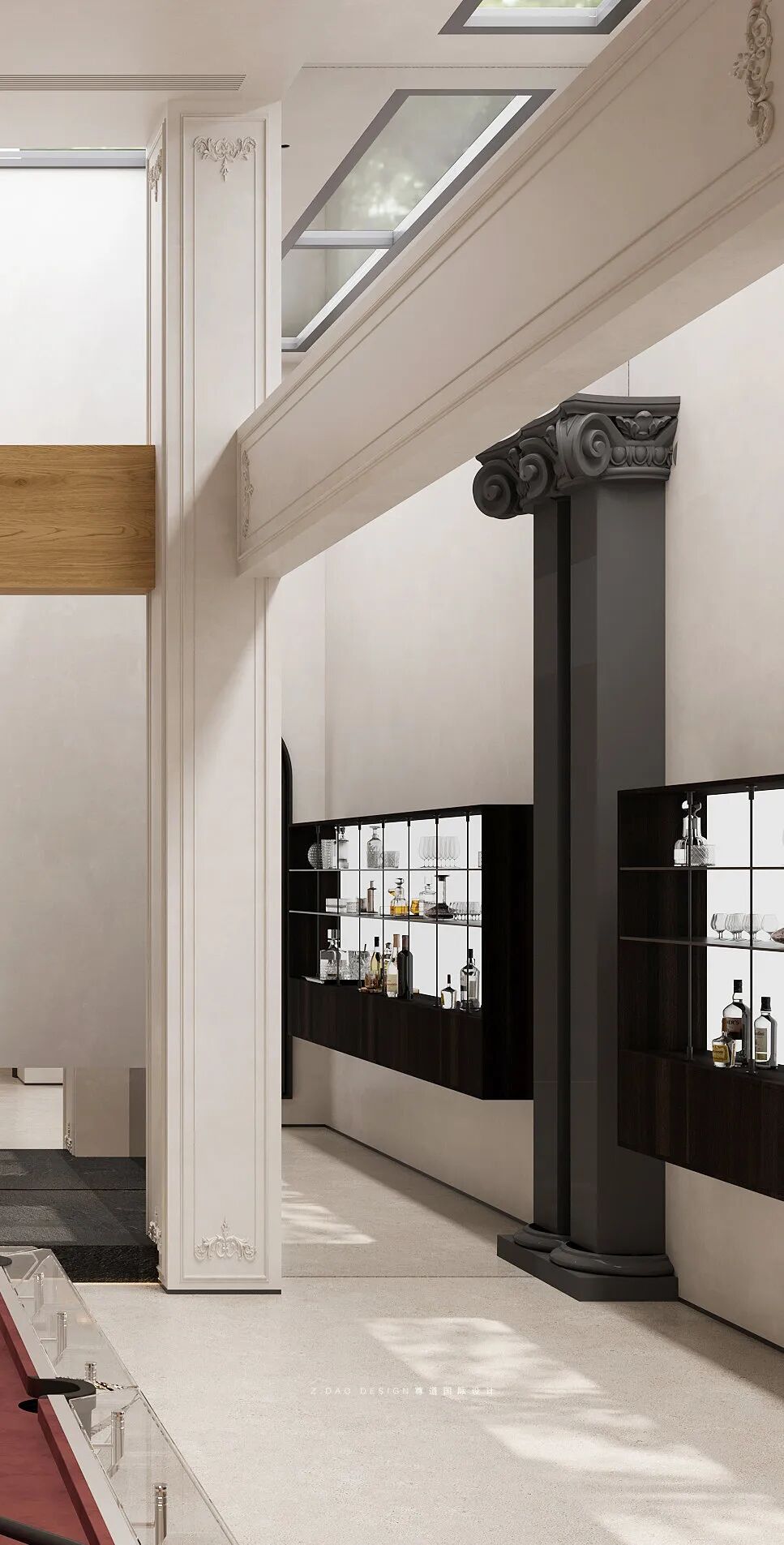 为了支撑隔层的整体空间,我们做了一个柱子,这个柱子我们用了罗马柱的柱头做了装饰,圆柱下方就是业主品茗区,我们用岩石做了茶桌,岩石表面的自然感和天然的纹理,给人一种置身大自然的空间的联想。