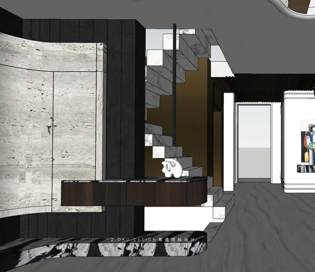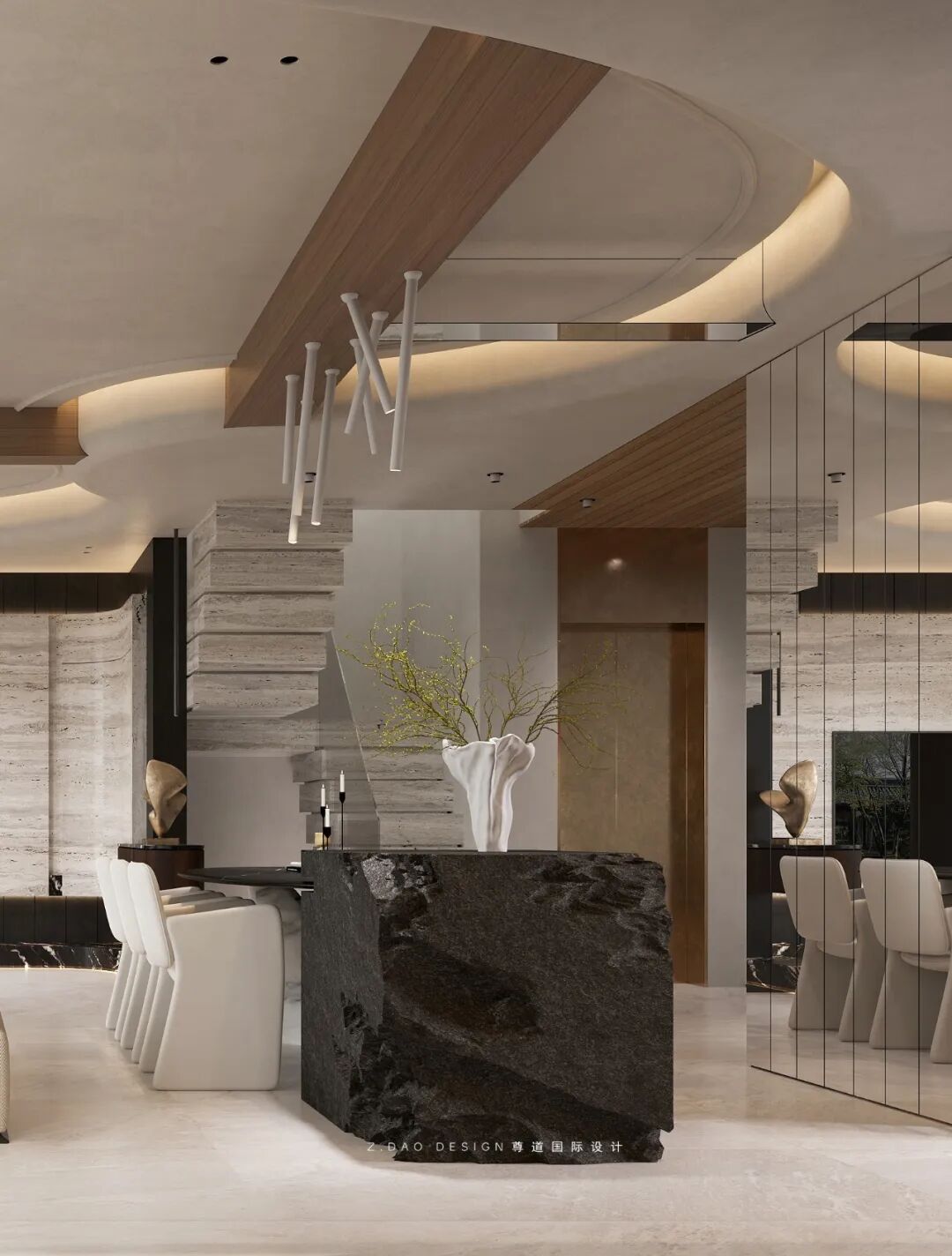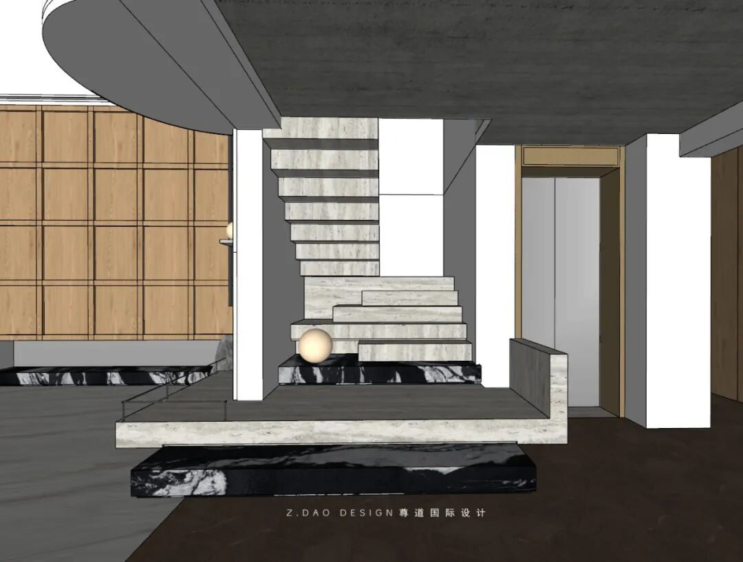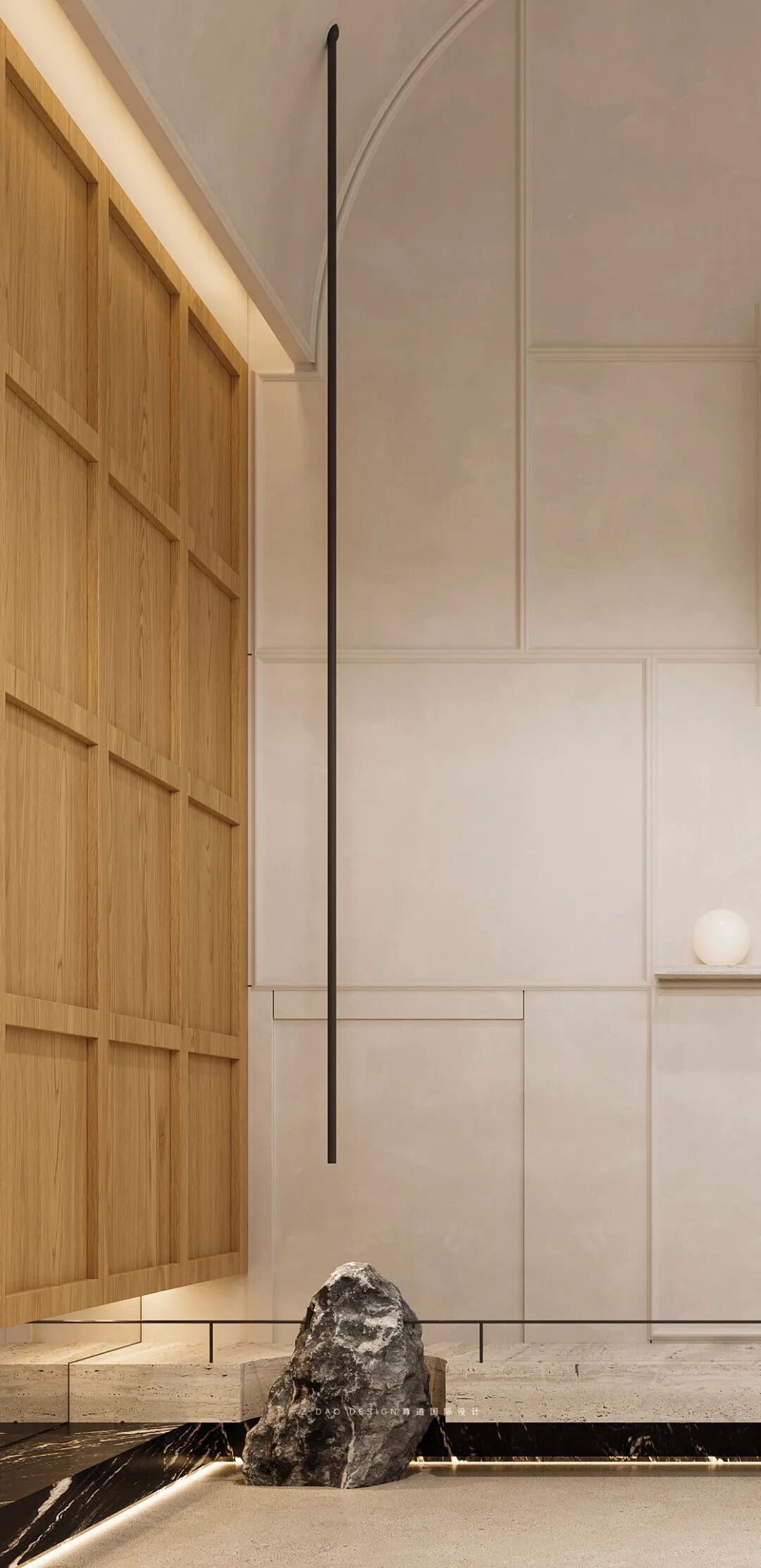 正对的玄关没有选用多么昂贵的材料,就是质感强的pu线条叠加,以及楼梯延伸的第二步台阶,在这里台阶有了层次感,他点缀了门厅的玄关,也让楼梯变成了一个艺术展示,进门的石头是寓意家宅平稳运势上升。一根长的定制灯管从顶面的弧形落下,点亮石头,这是一盏灯,留给晚归的家人。