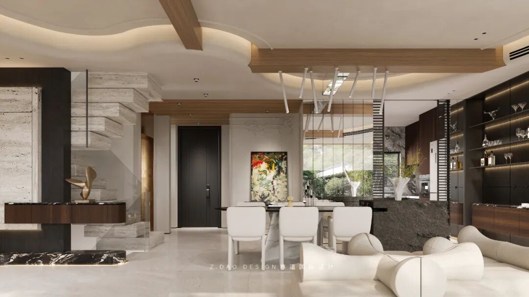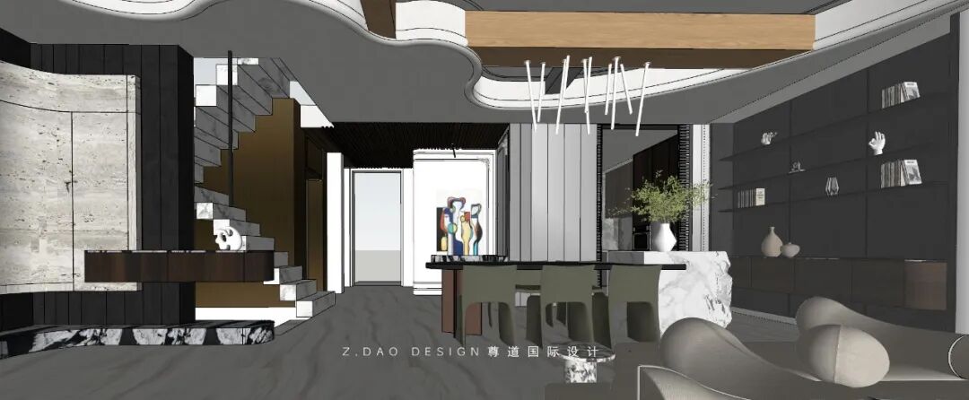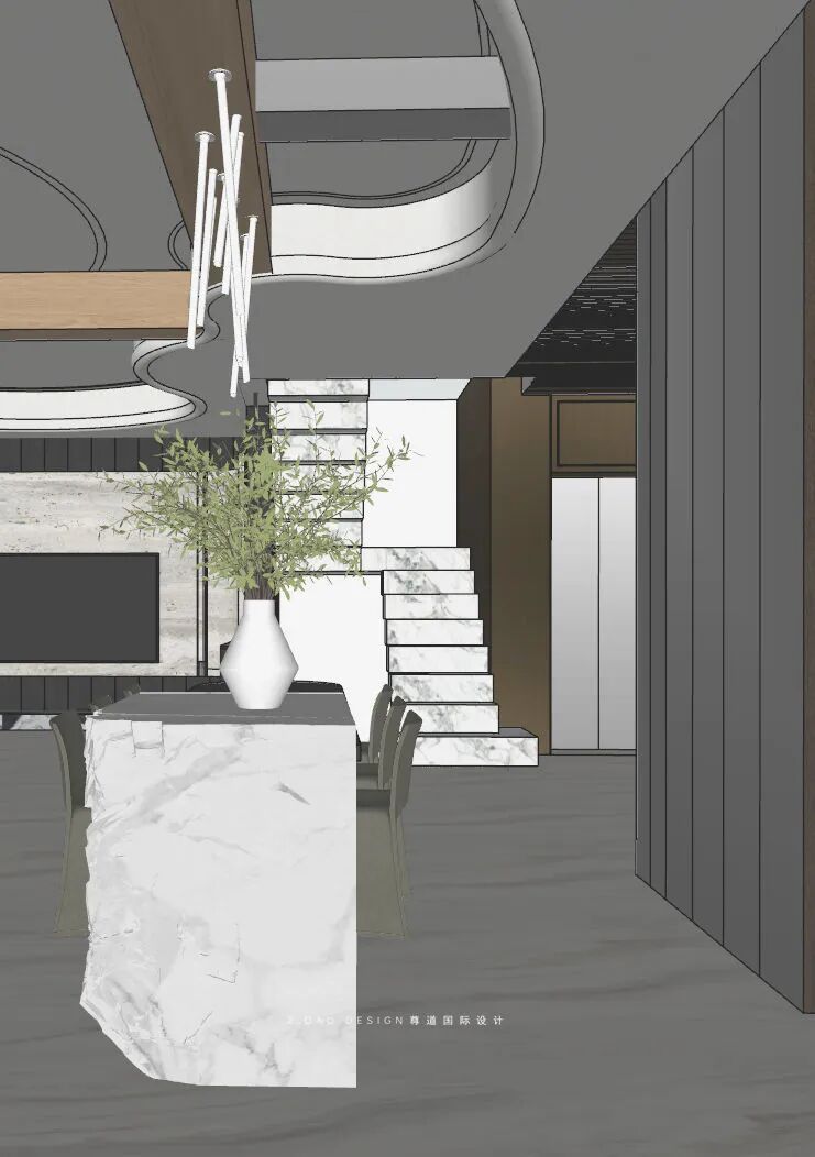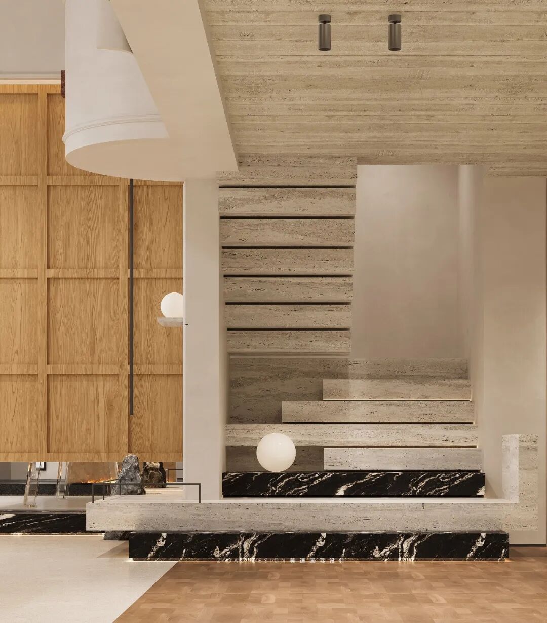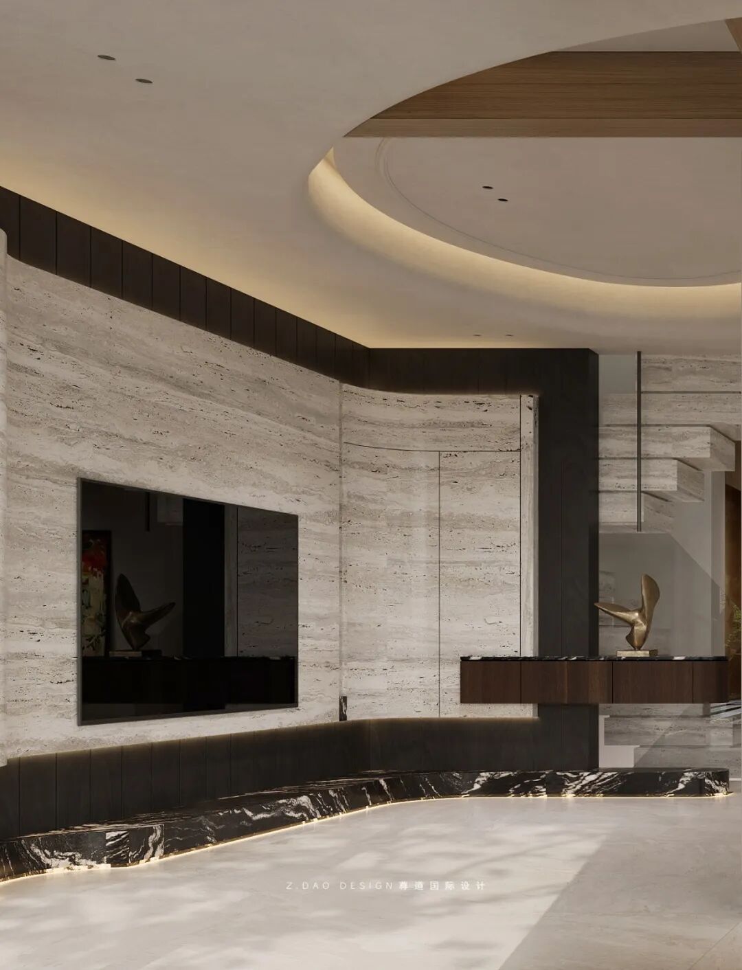 正对的玄关没有选用多么昂贵的材料,就是质感强的pu线条叠加,以及楼梯延伸的第二步台阶,在这里台阶有了层次感,他点缀了门厅的玄关,也让楼梯变成了一个艺术展示,进门的石头是寓意家宅平稳运势上升。一根长的定制灯管从顶面的弧形落下,点亮石头,这是一盏灯,留给晚归的家人。