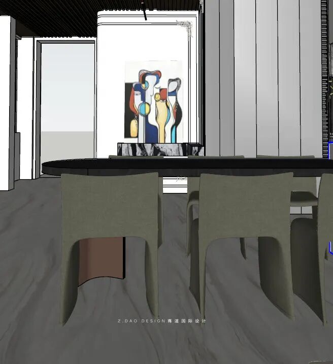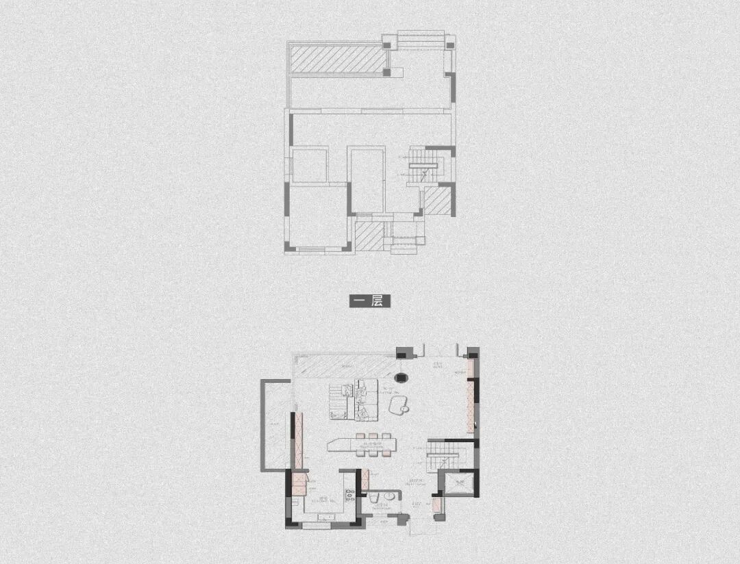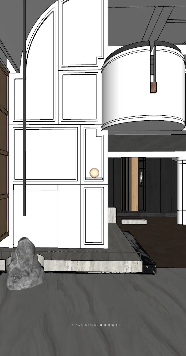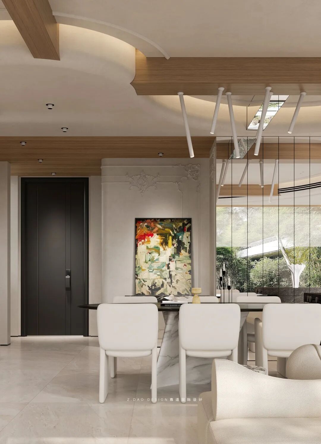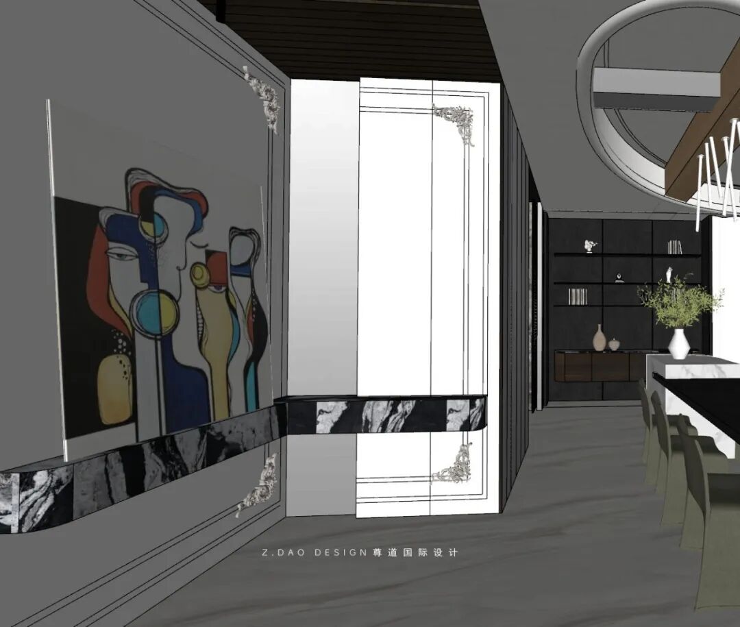 正对的玄关没有选用多么昂贵的材料,就是质感强的pu线条叠加,以及楼梯延伸的第二步台阶,在这里台阶有了层次感,他点缀了门厅的玄关,也让楼梯变成了一个艺术展示,进门的石头是寓意家宅平稳运势上升。一根长的定制灯管从顶面的弧形落下,点亮石头,这是一盏灯,留给晚归的家人。