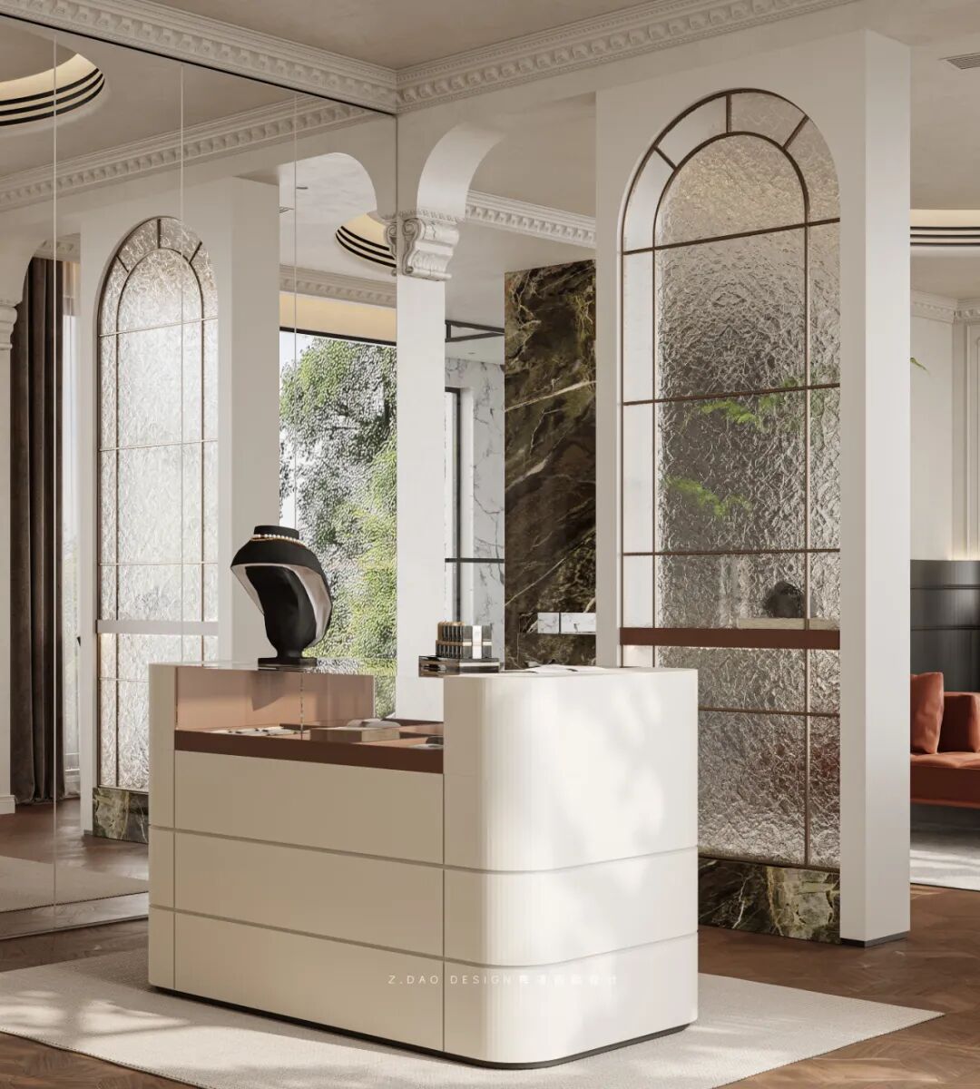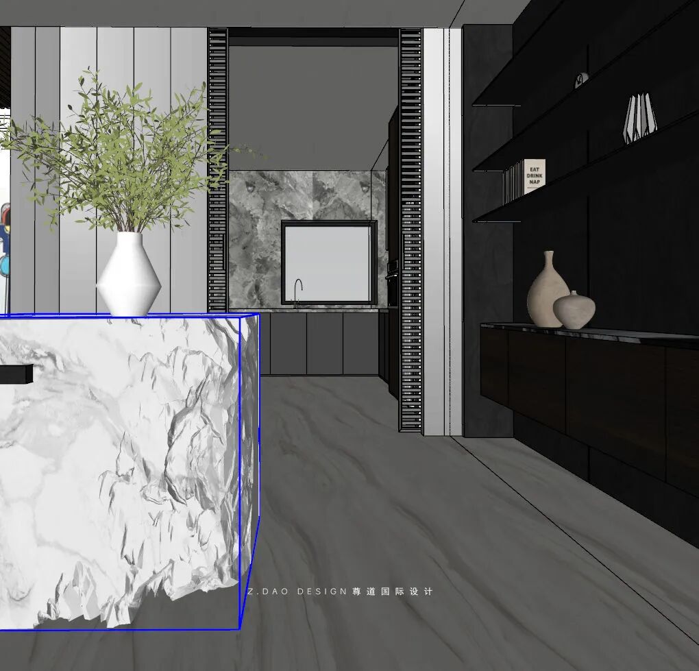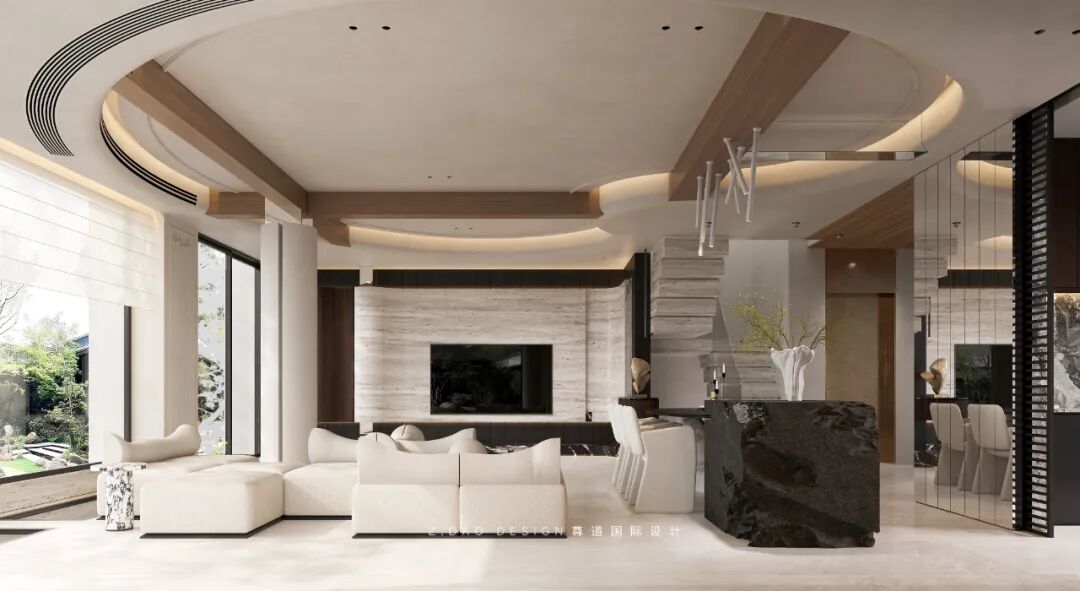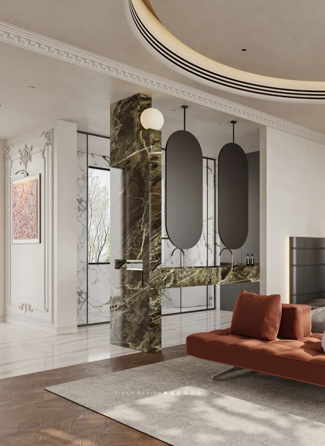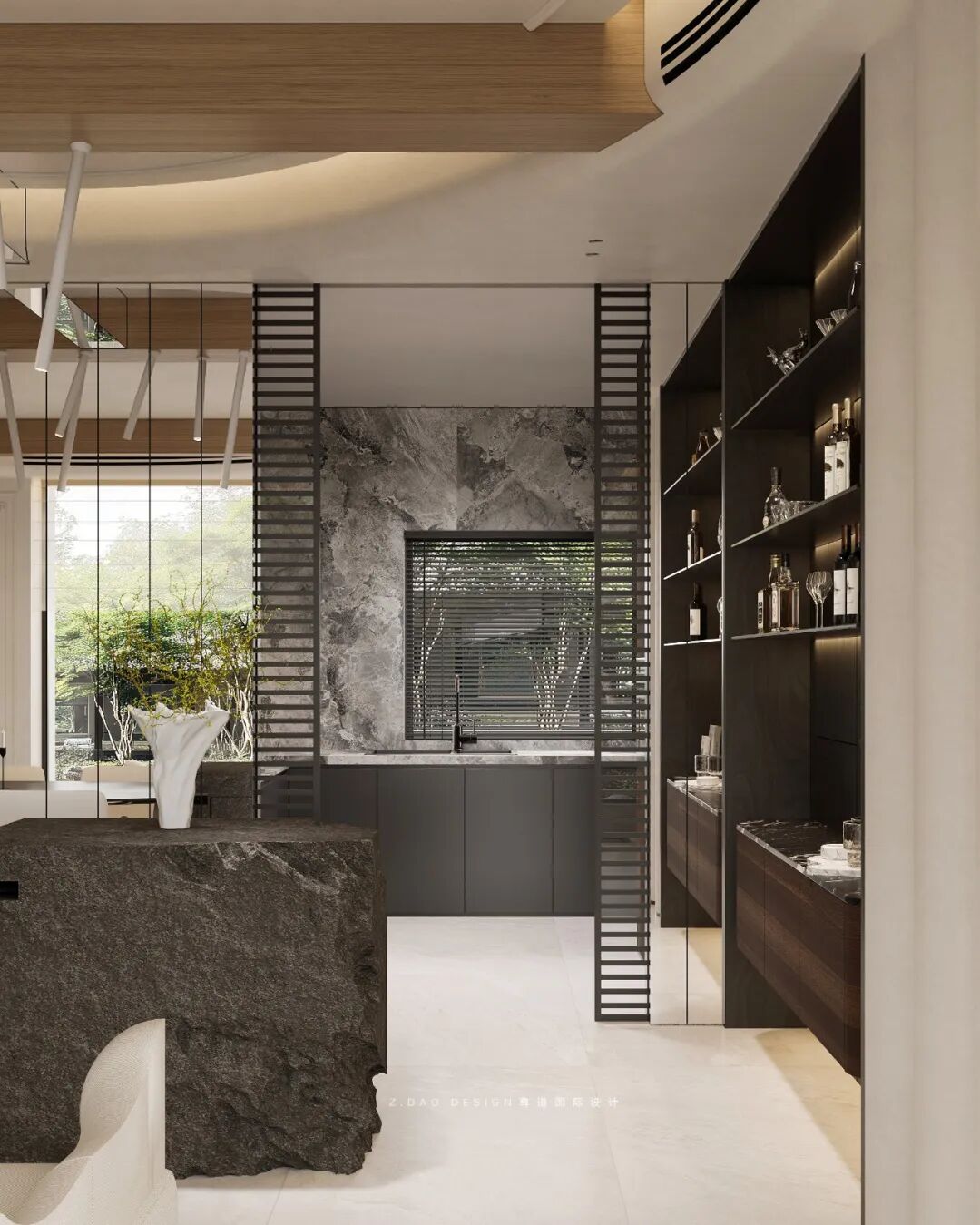 运用材料:木饰面、岩板、大理石、金属、亚克力、天然原石等。