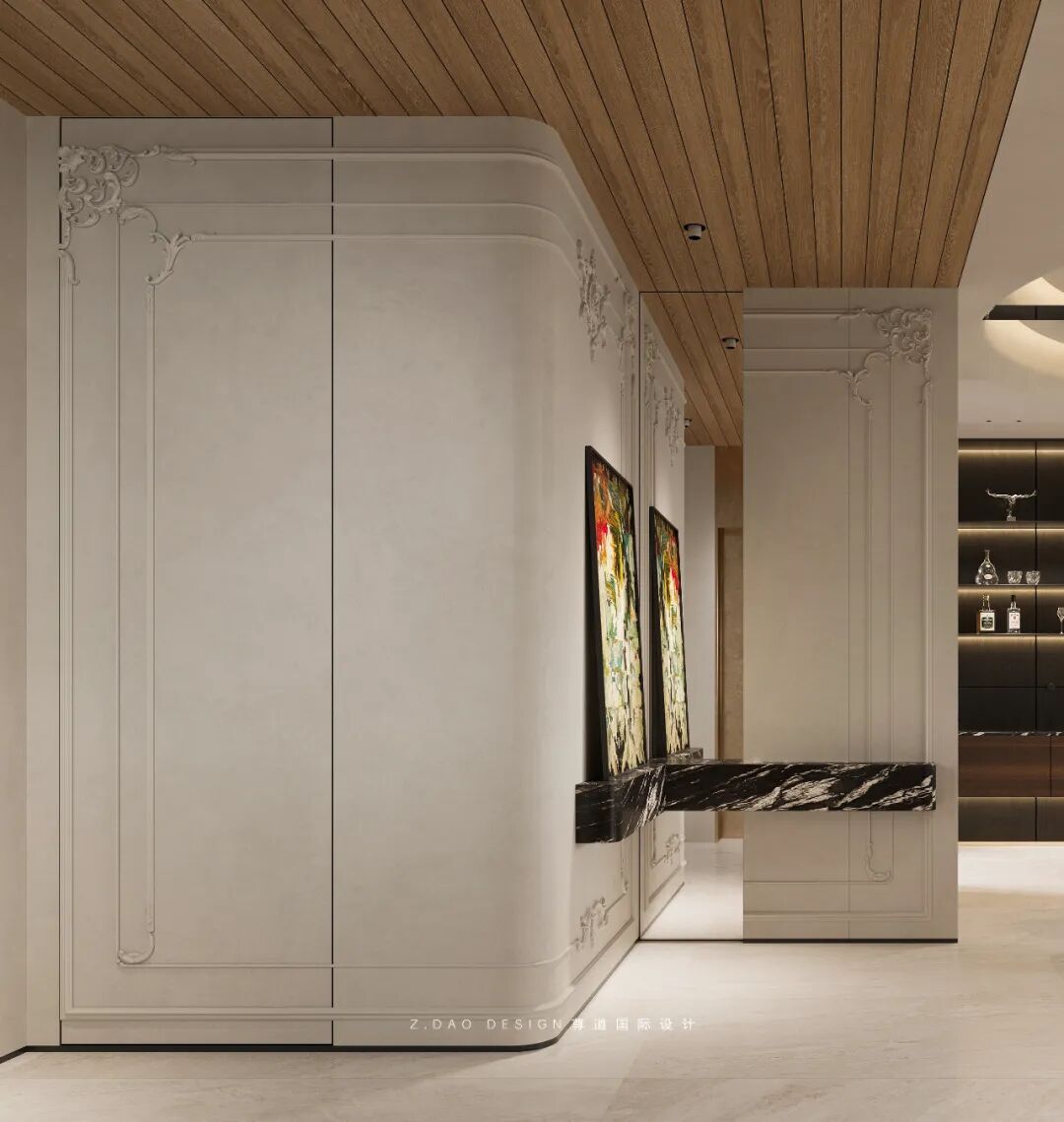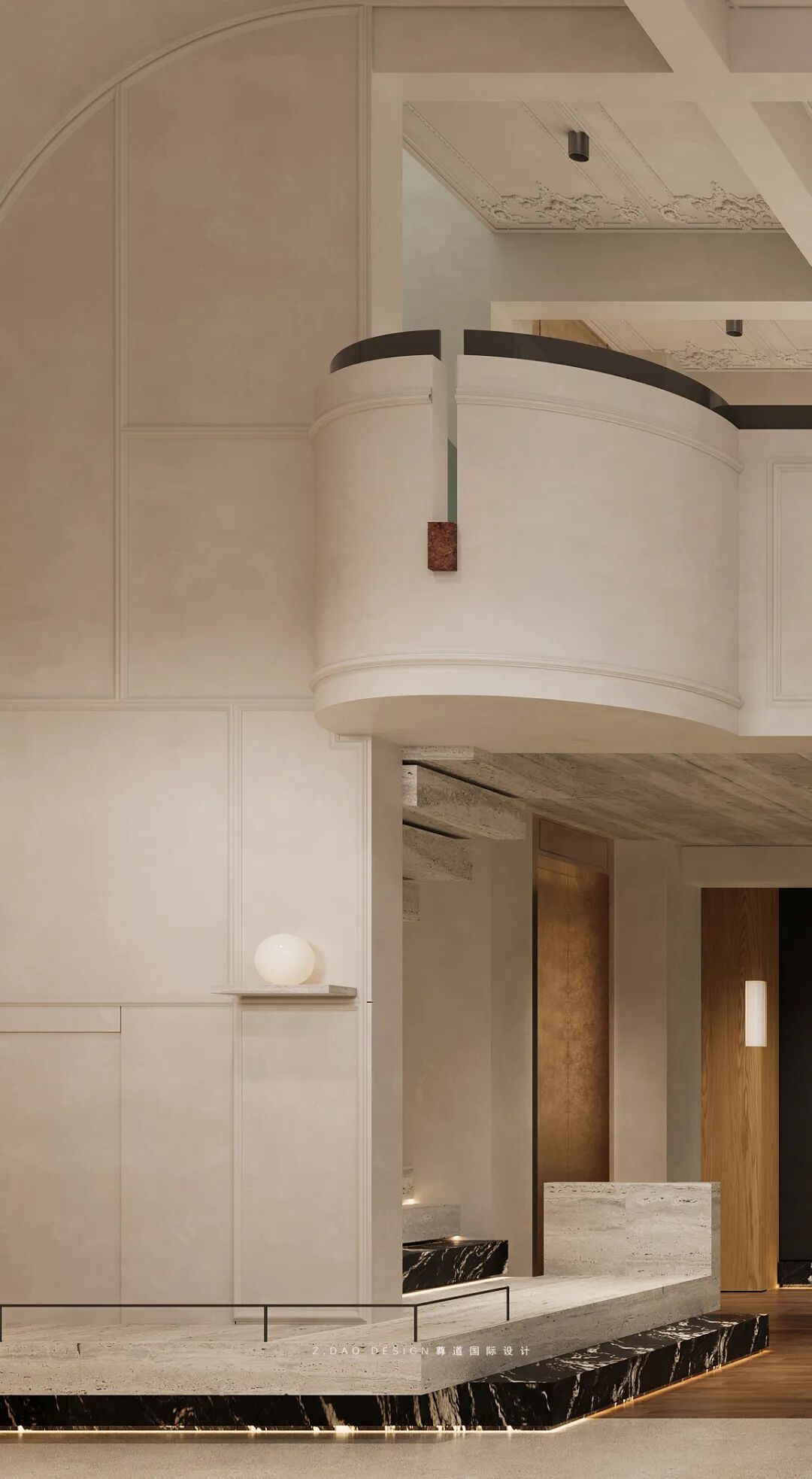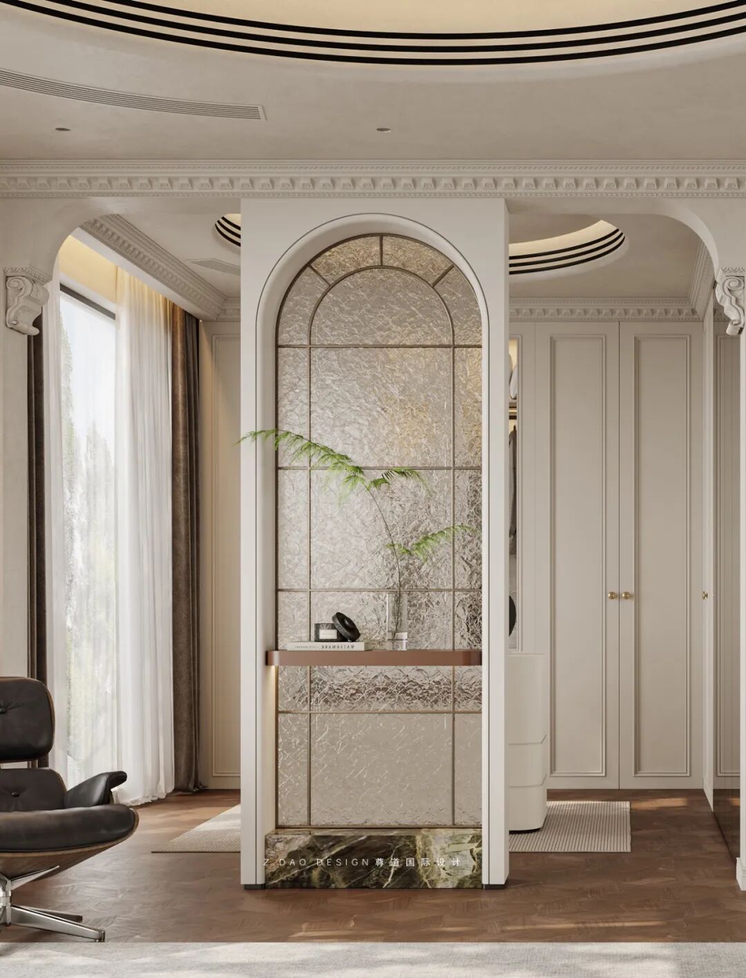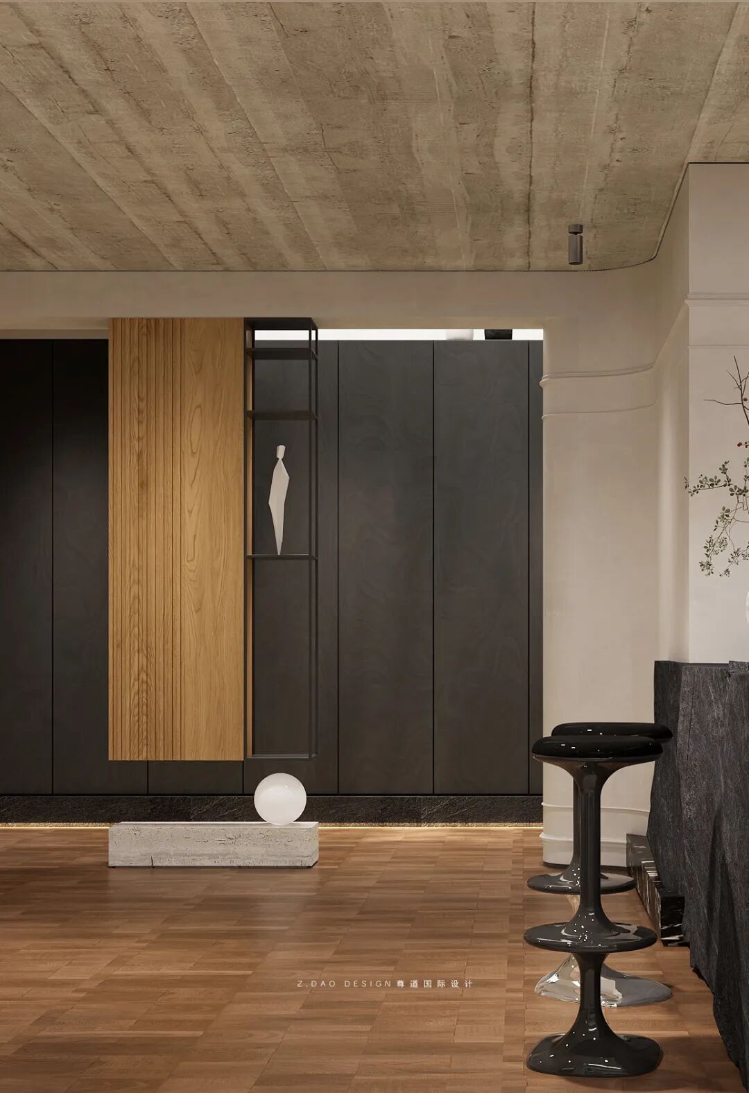 入户门厅的高级感是挑高给的,我们利用现场的结构设计出造型,包括顶面的弧形吊顶,也是根据结构来开展的一些设计手法,不追求过于奢华以及浪费的材质表现,着重于空间和结构。