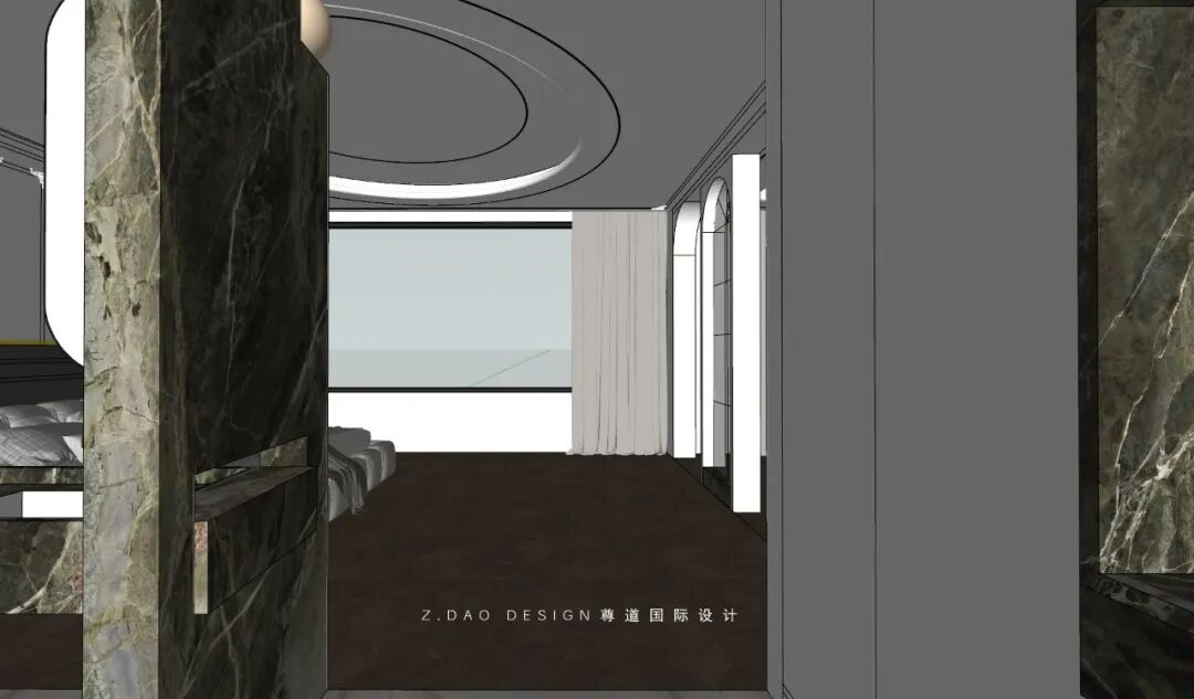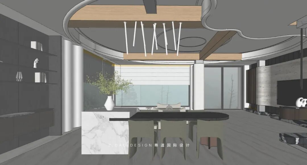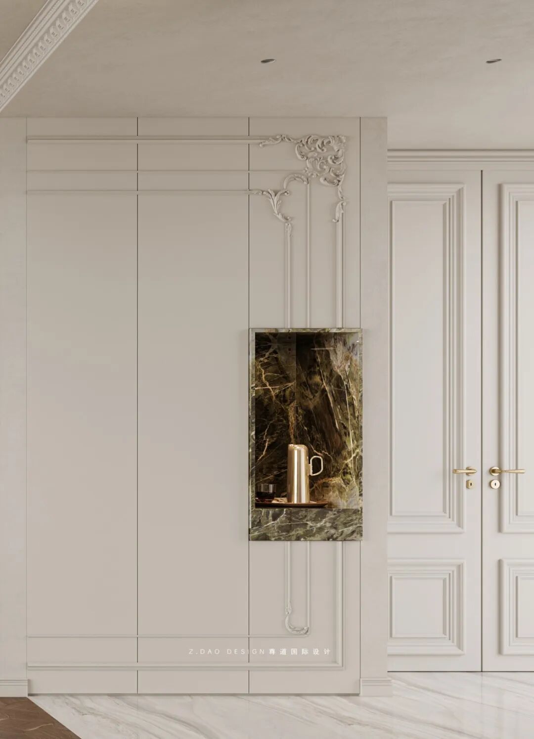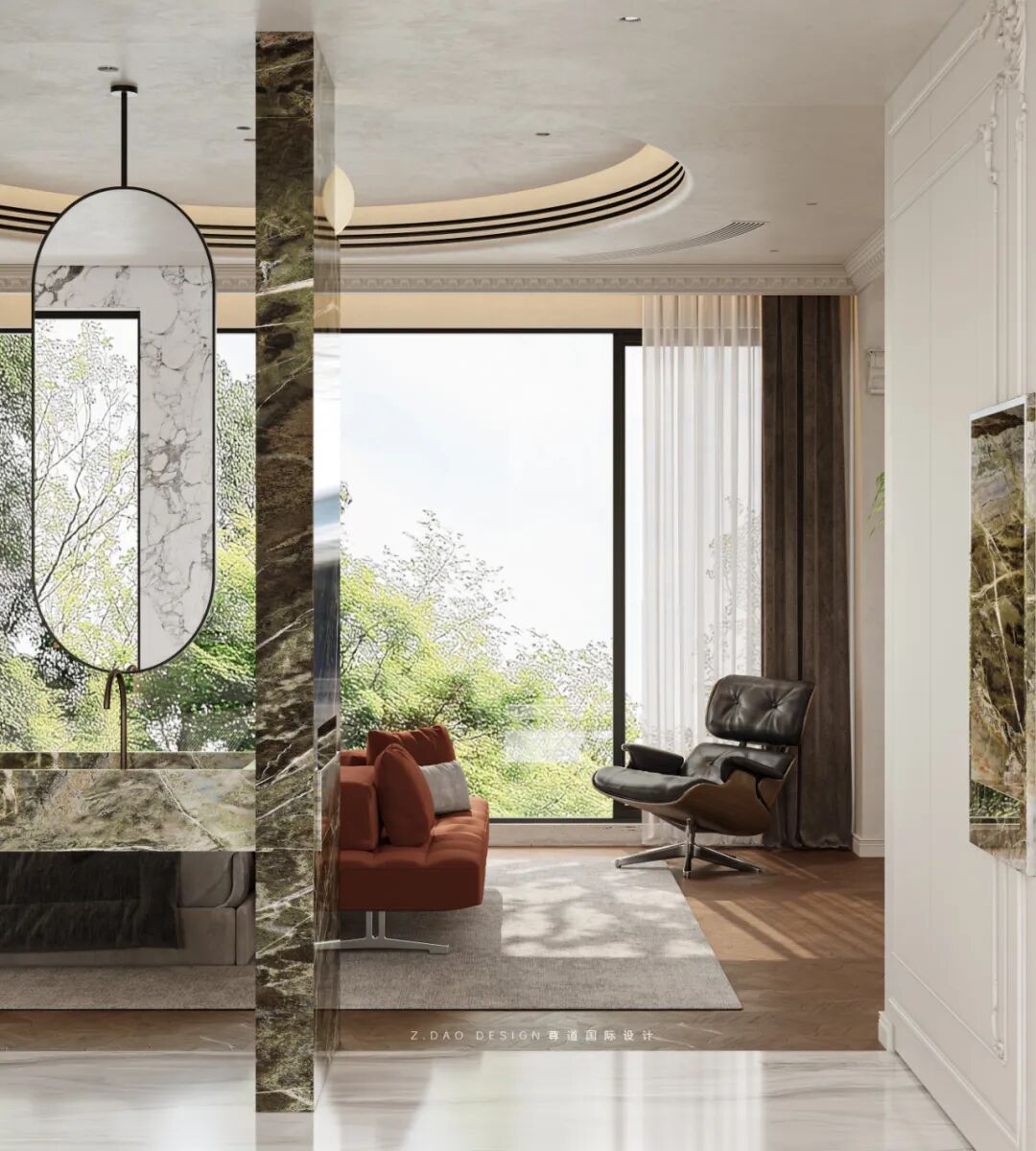 入户门厅的高级感是挑高给的,我们利用现场的结构设计出造型,包括顶面的弧形吊顶,也是根据结构来开展的一些设计手法,不追求过于奢华以及浪费的材质表现,着重于空间和结构。