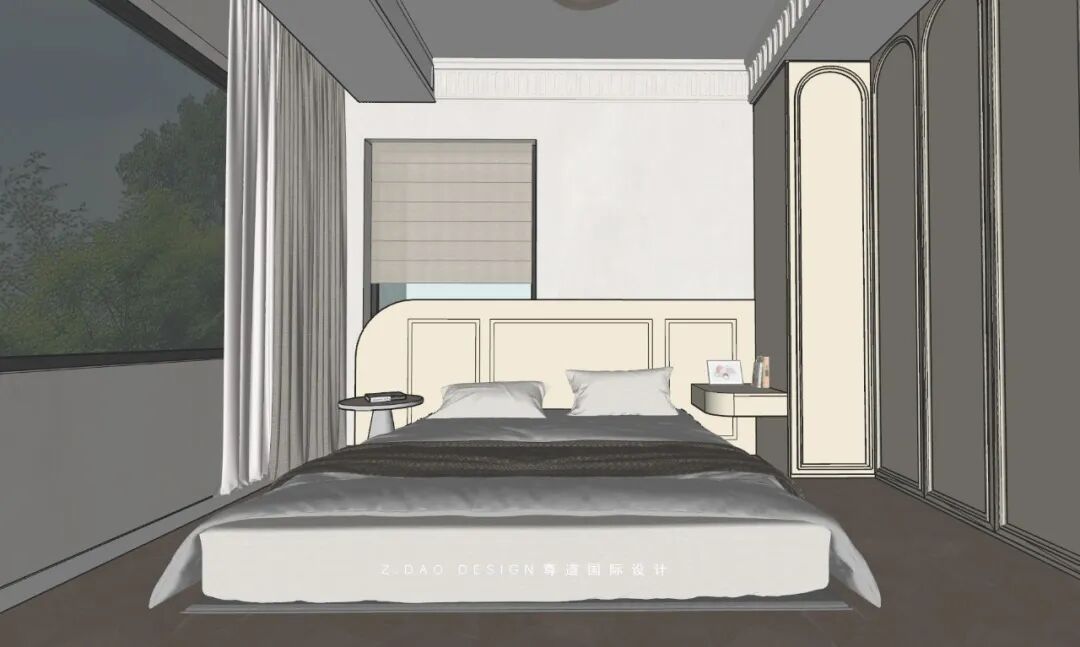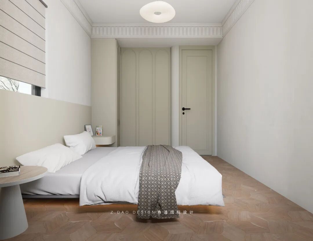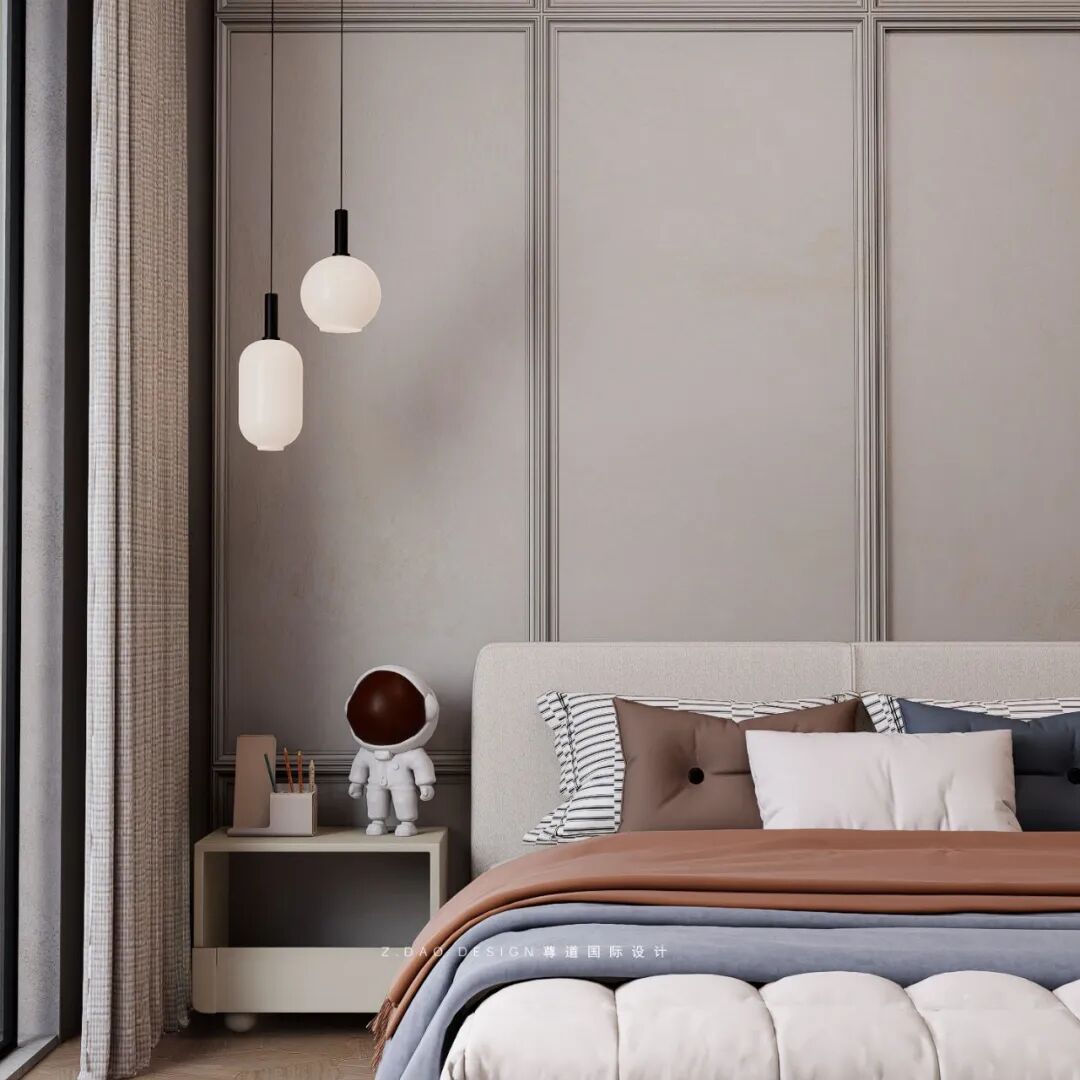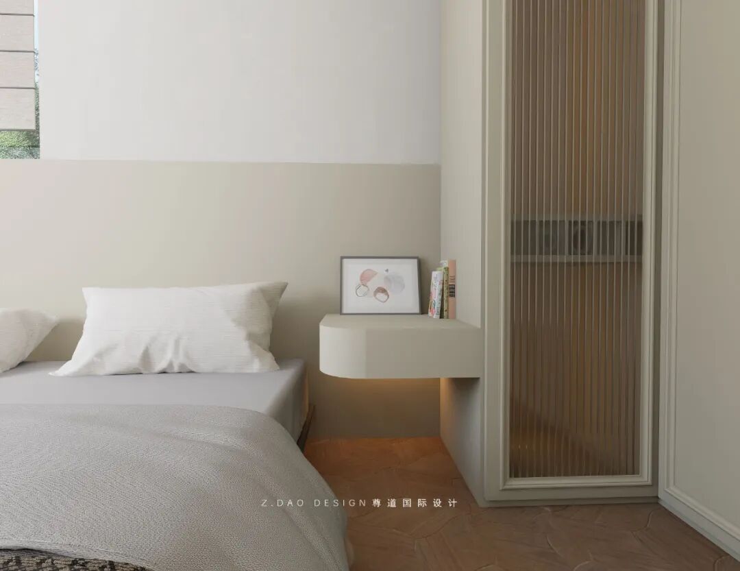 床头设计的护墙板也是具有包裹性的,让休息的人更有安全感,另外还可以遮盖东南角的窗户,这样窗户的采光不影响,床的空间也最大化。