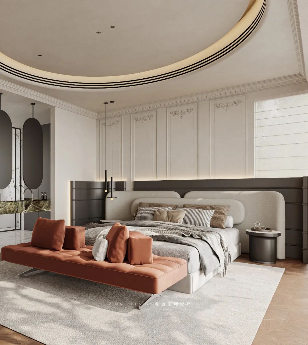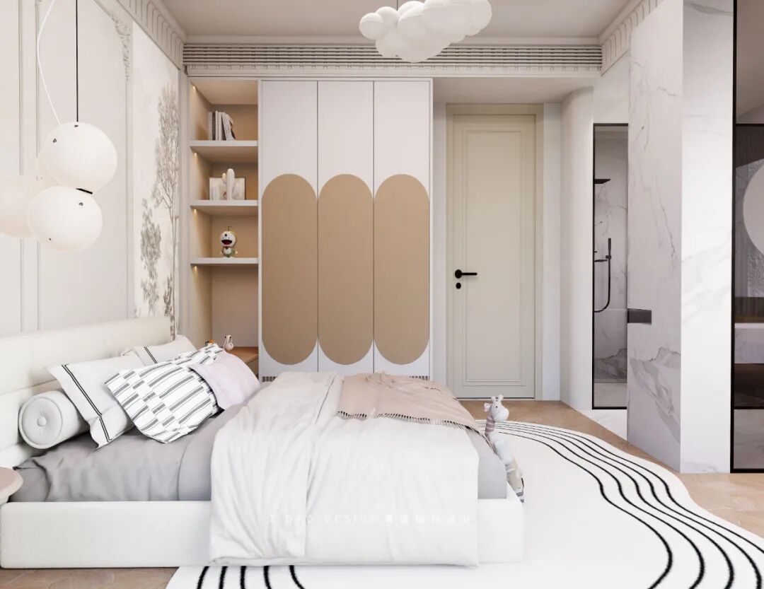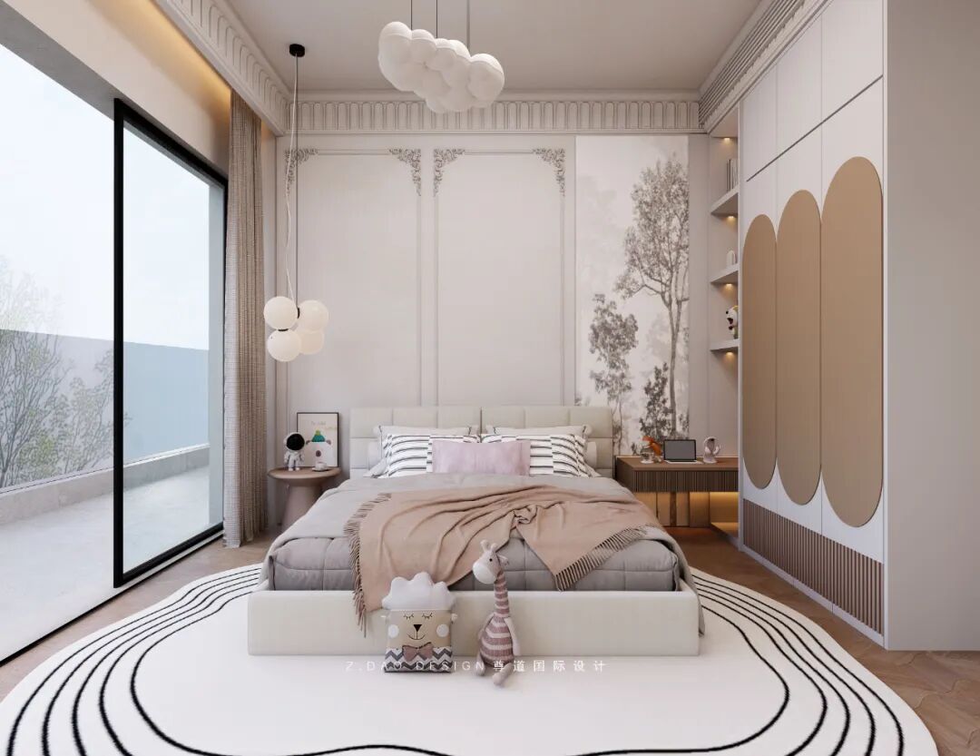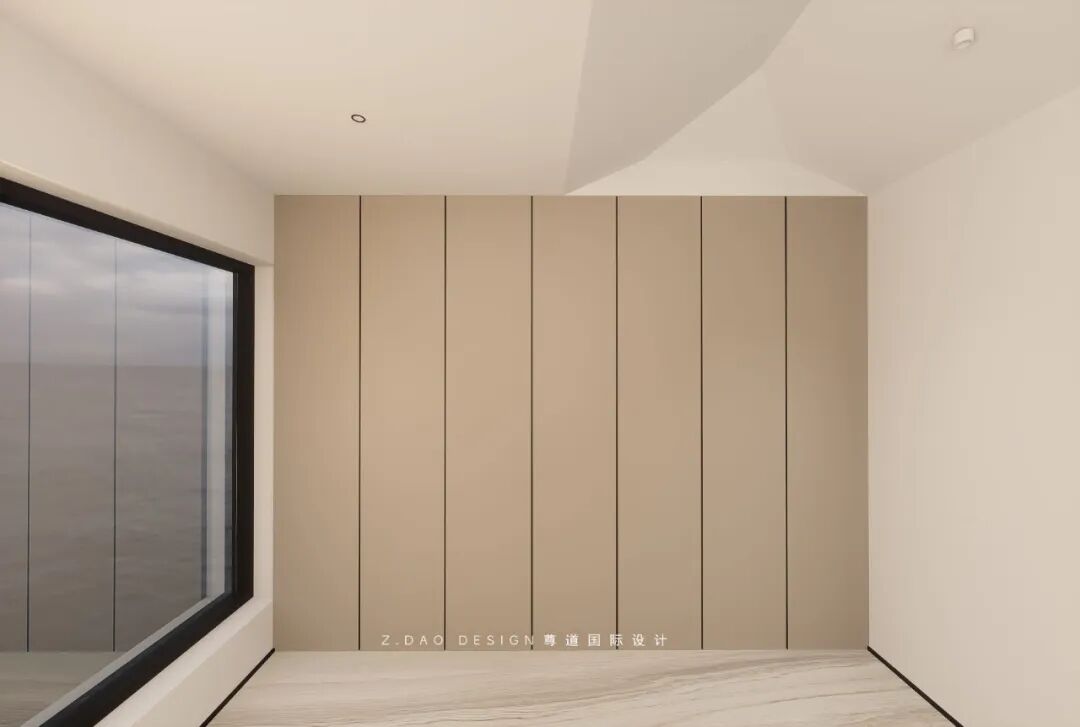 床头设计的护墙板也是具有包裹性的,让休息的人更有安全感,另外还可以遮盖东南角的窗户,这样窗户的采光不影响,床的空间也最大化。
