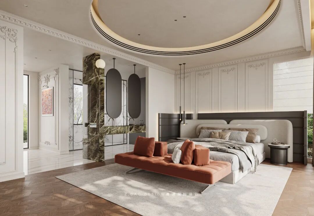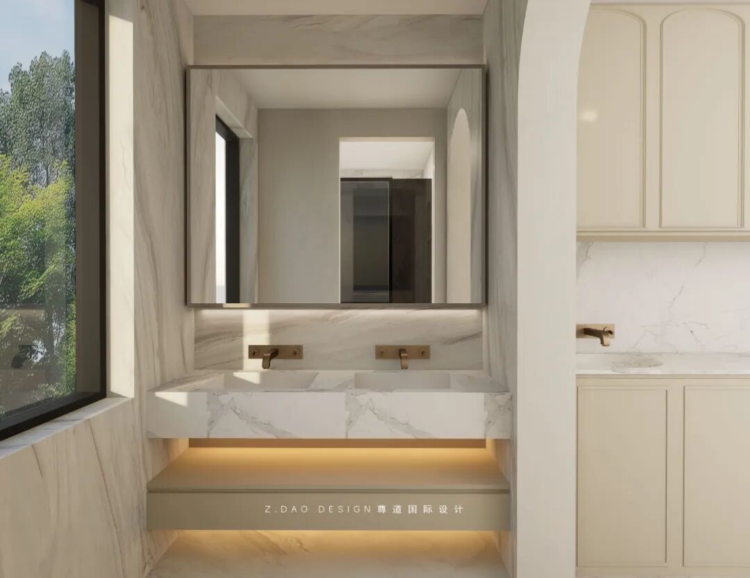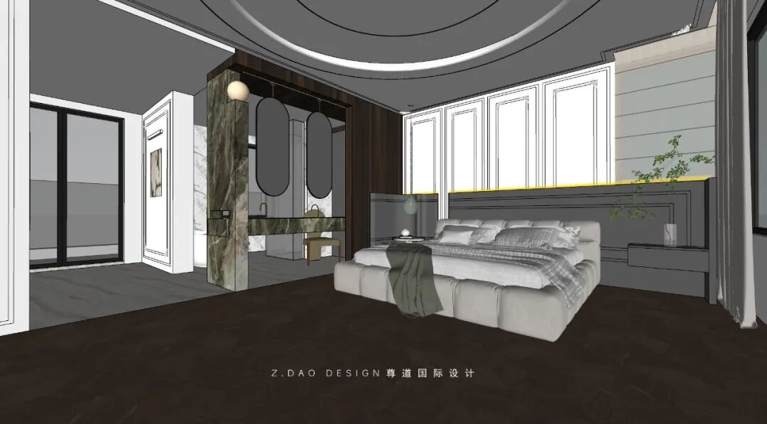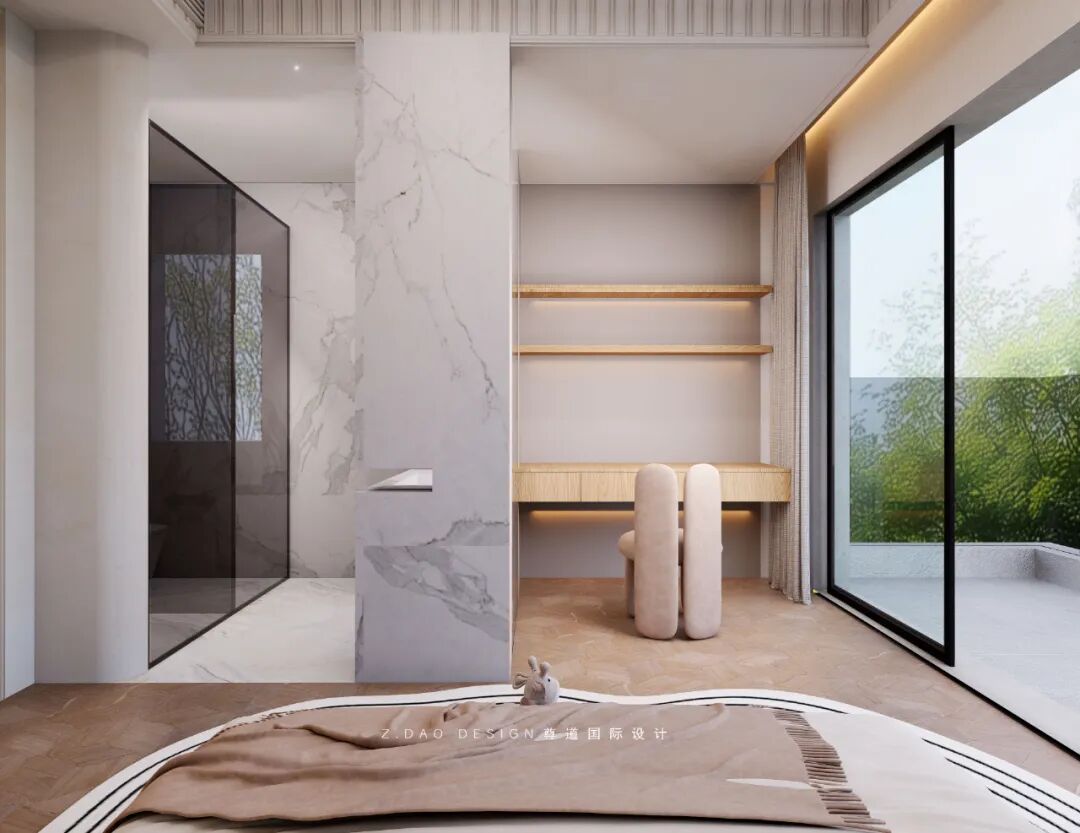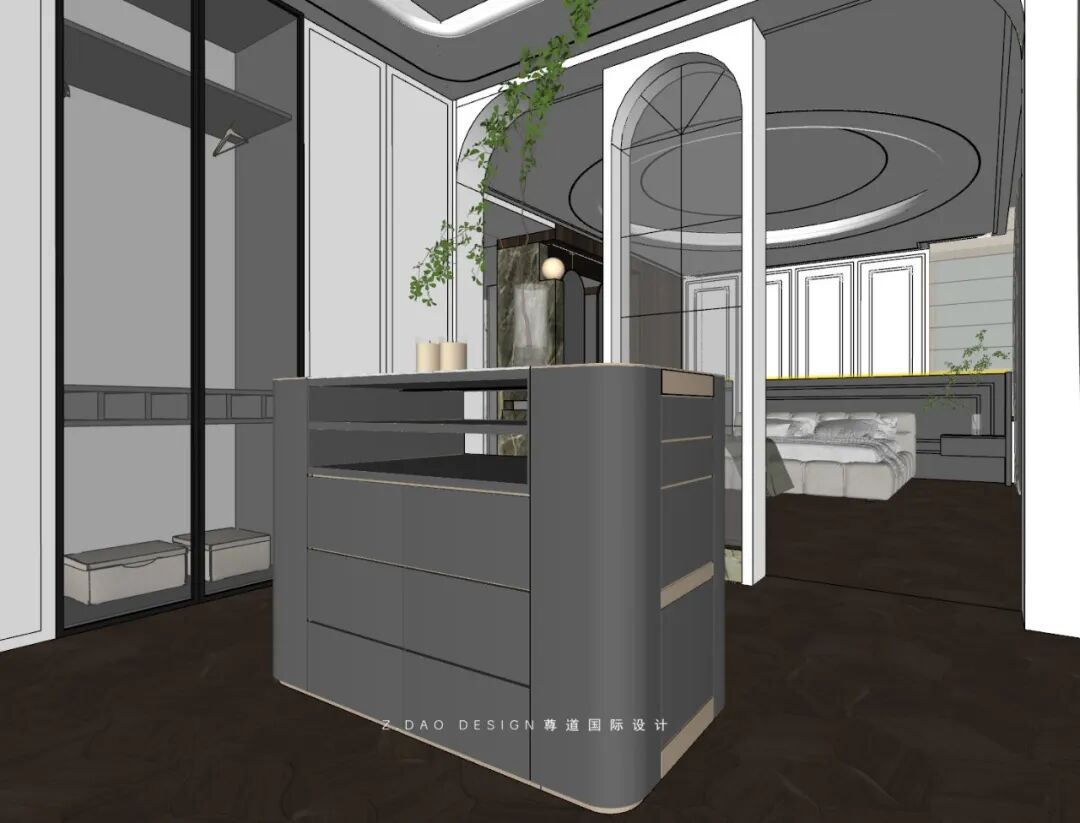 衣帽间有中岛,收纳摆放业主的首饰,衣柜的柜门我们设计了镜面,这样就不需要再考虑穿衣镜了,窗外的美景也是直接映在镜面上,完美的功能和仪式感的展示。