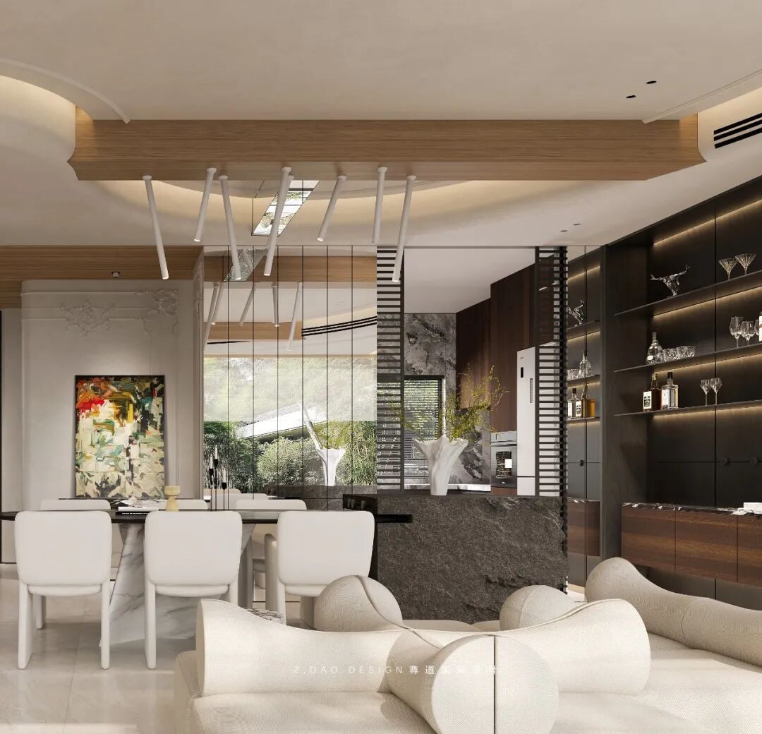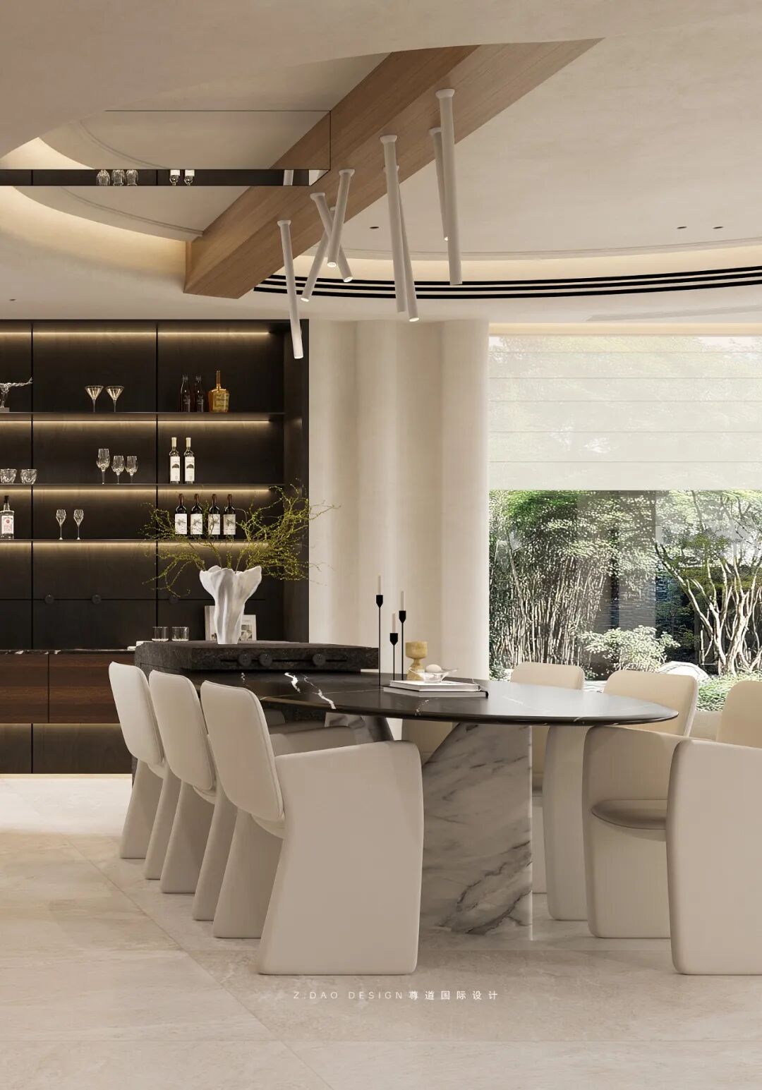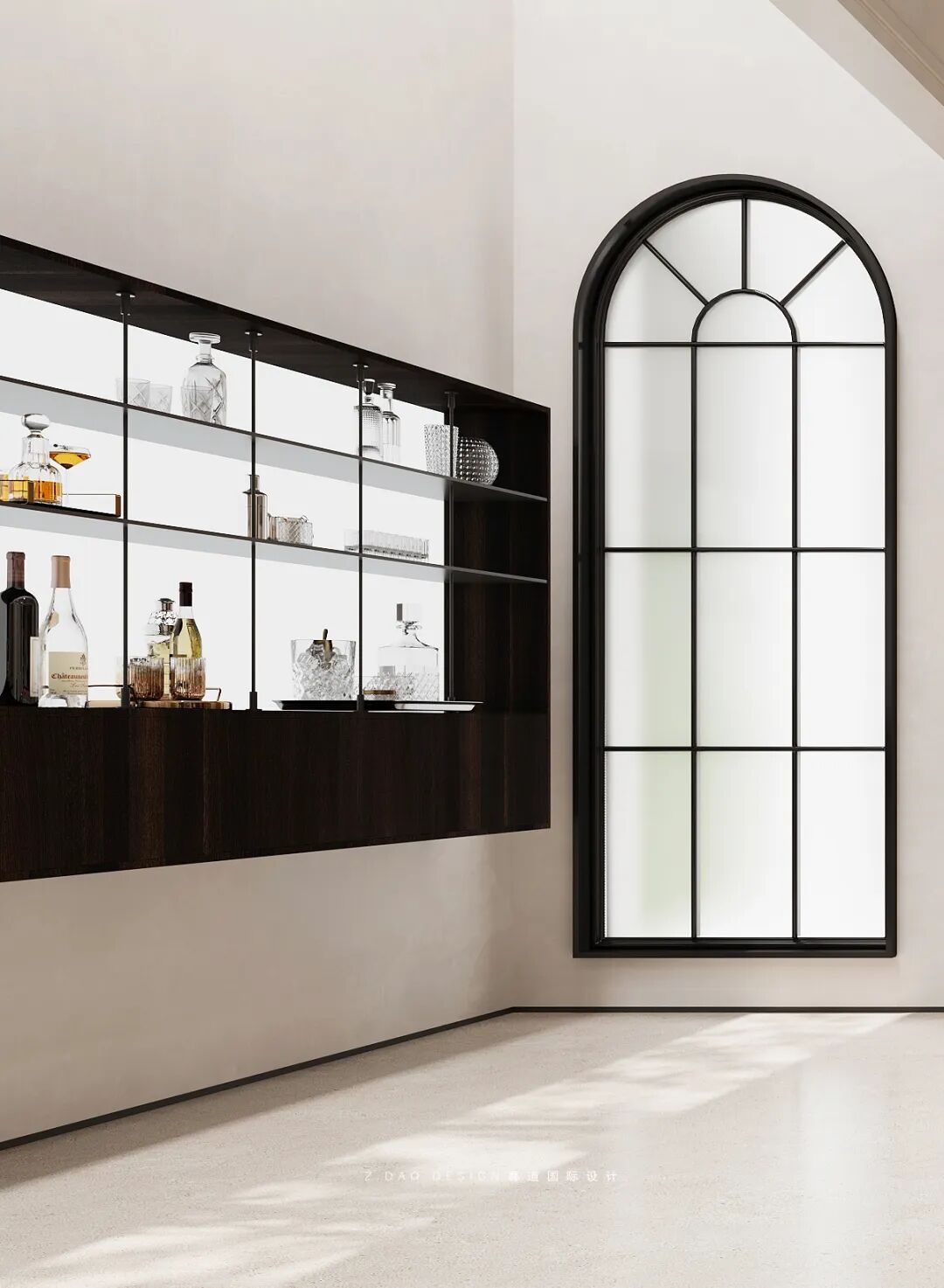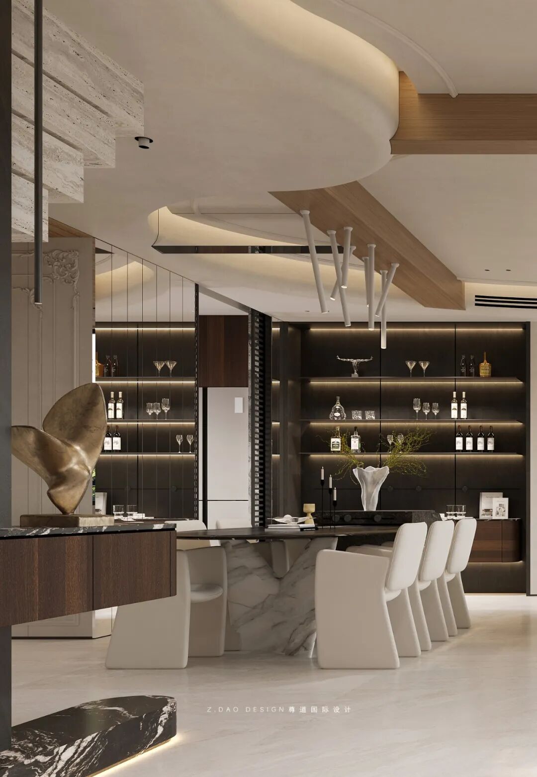 餐厅的灯具,我们也是在梁体上做安装,酒柜做了弧形的设计,开放格的酒柜让空间更加有呼吸感,结合灯光,满满的高级。