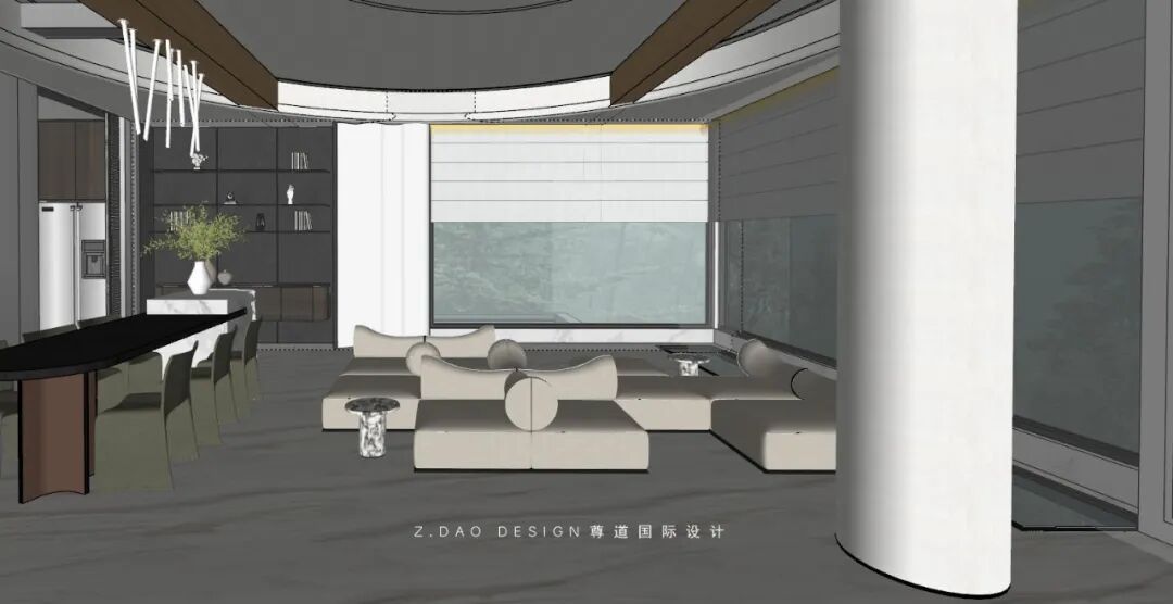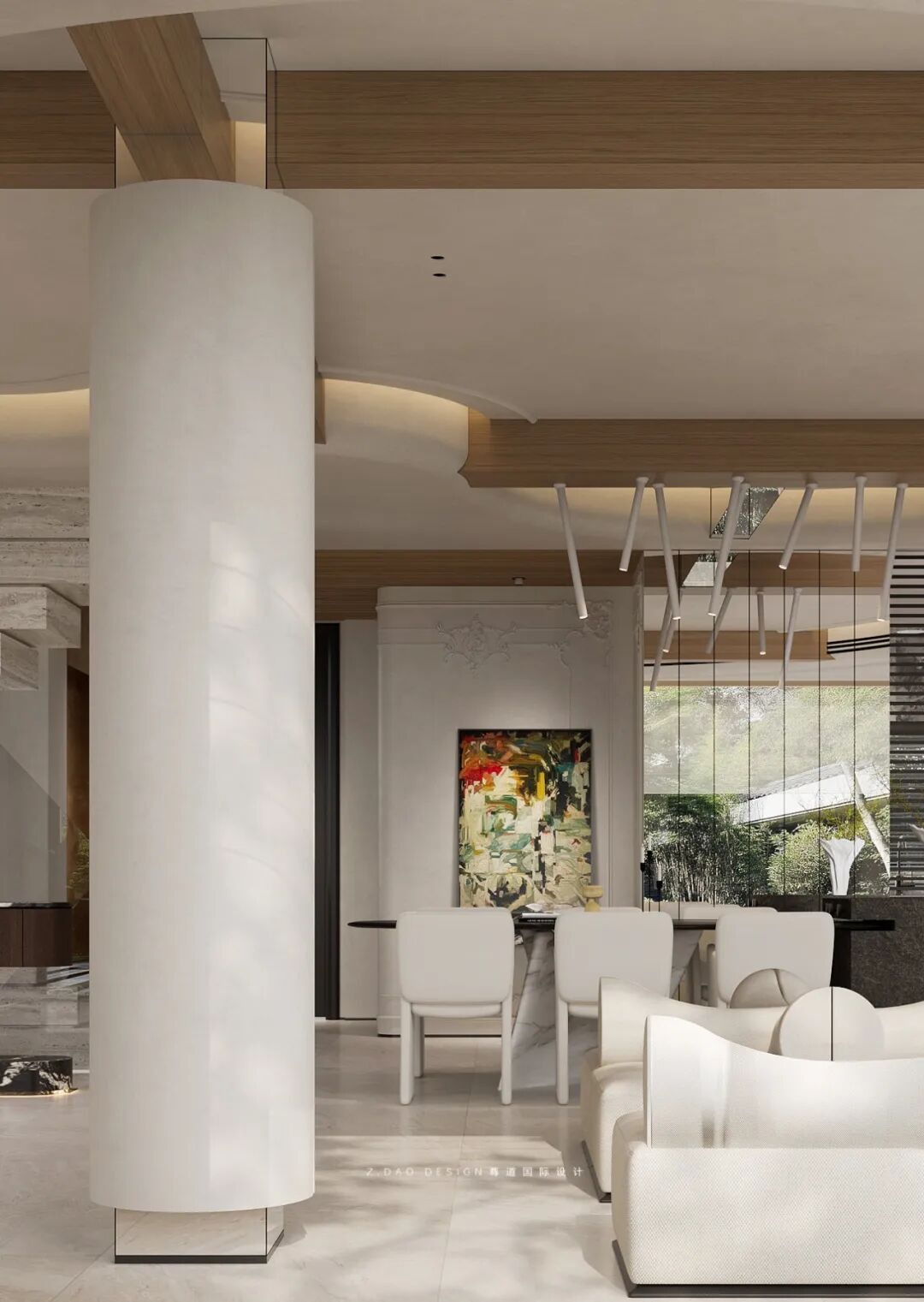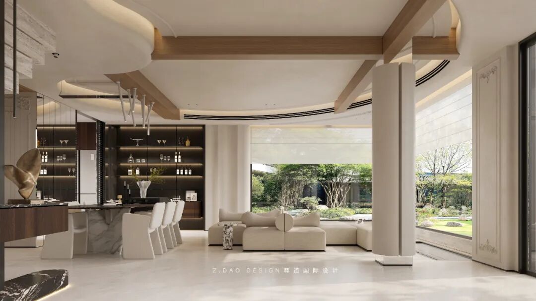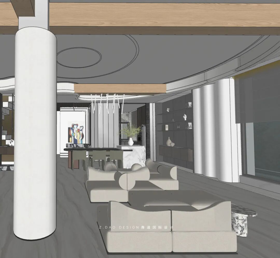 因为外扩的力度较大,导致结构梁体和柱子过多,我们利用弧形吊顶来修饰,结构梁利用木饰面来装饰。