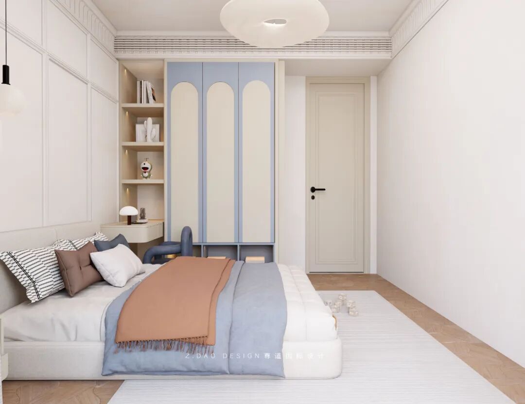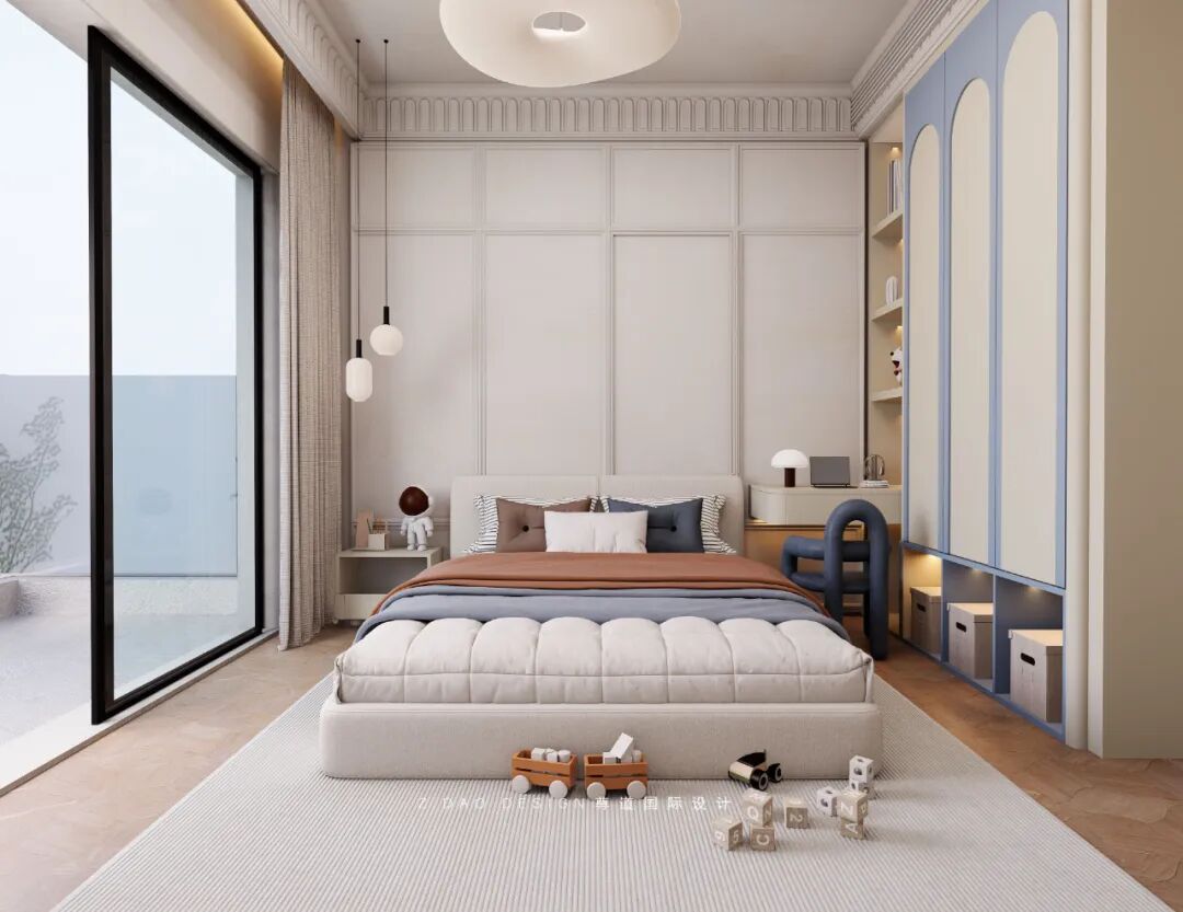 朝南的男孩房,色系上同样都是暖色调,加上一些蓝色的软装搭配,让空间更有个性化,书桌和衣柜的结合,也是更加的合理化利用这两个功能。
