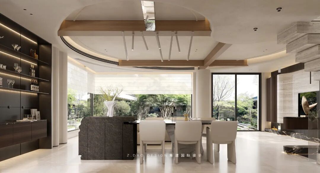 餐厅的岛台还是用的岩石,包括内部的收纳都是岩石的门板,我们想要让庭院的元素更多的在室内也体现出来,餐桌咱们设计的是可移动式的,方便人多的时候聚餐。