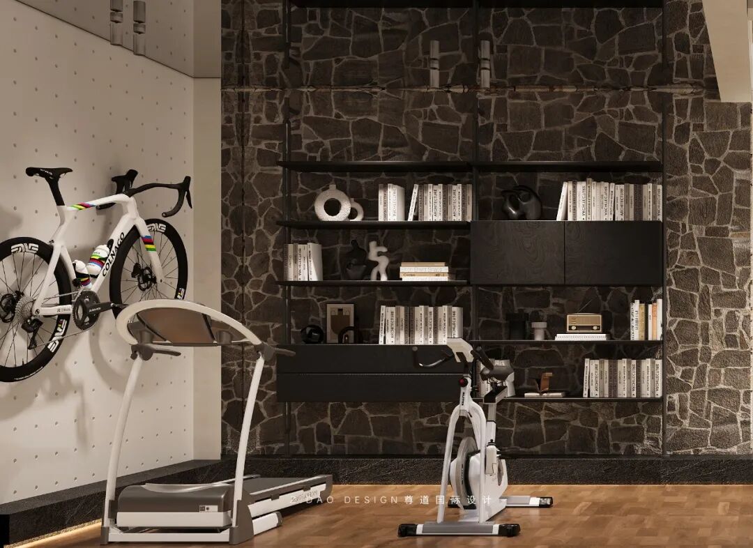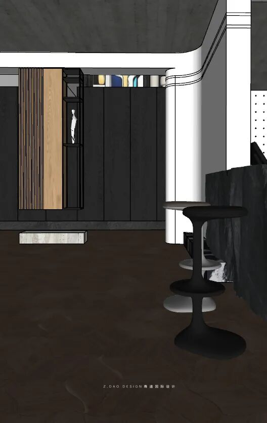 隔层的护栏有圆弧的观景台,在这里你可以俯瞰整体负二层的挑空部分,中间我们留了一处缝隙,镶嵌了业主喜欢的石头,这也是一个点睛之笔,护栏上的弧形造型是船帆的灵感来源,寓意一帆风顺,叠级漂浮的设计感扑面而来。