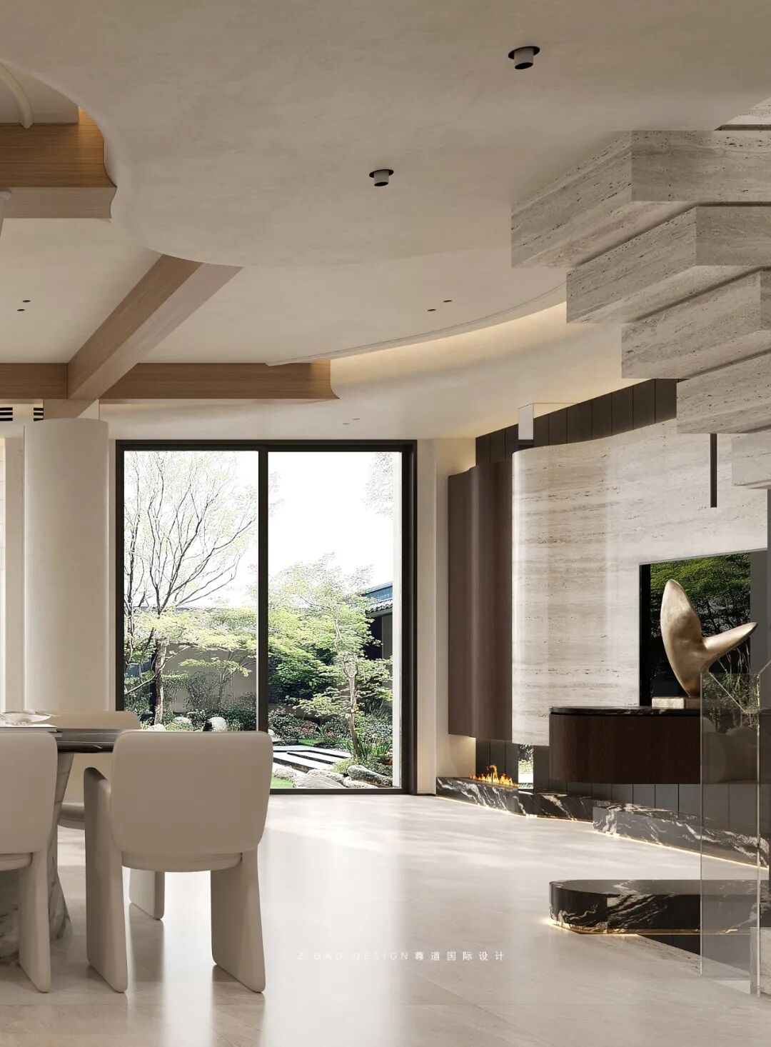 我们设计了弧形的电视背景墙,利用罗马洞石的材质,自然的风化肌理,在洞石的孔隙之间,是建筑最柔软的低语。