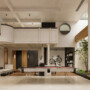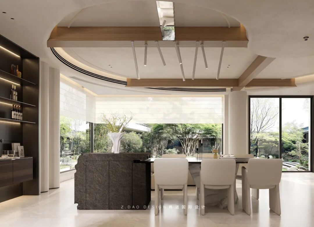 厨房的空间我们做了口袋门的设计,利用西科的格栅门制造隐秘感,餐厅的墙面,竖条的车边境,让坐在庭院北面的人也能看到院子的景观,更好的照顾到每一个人的感受。