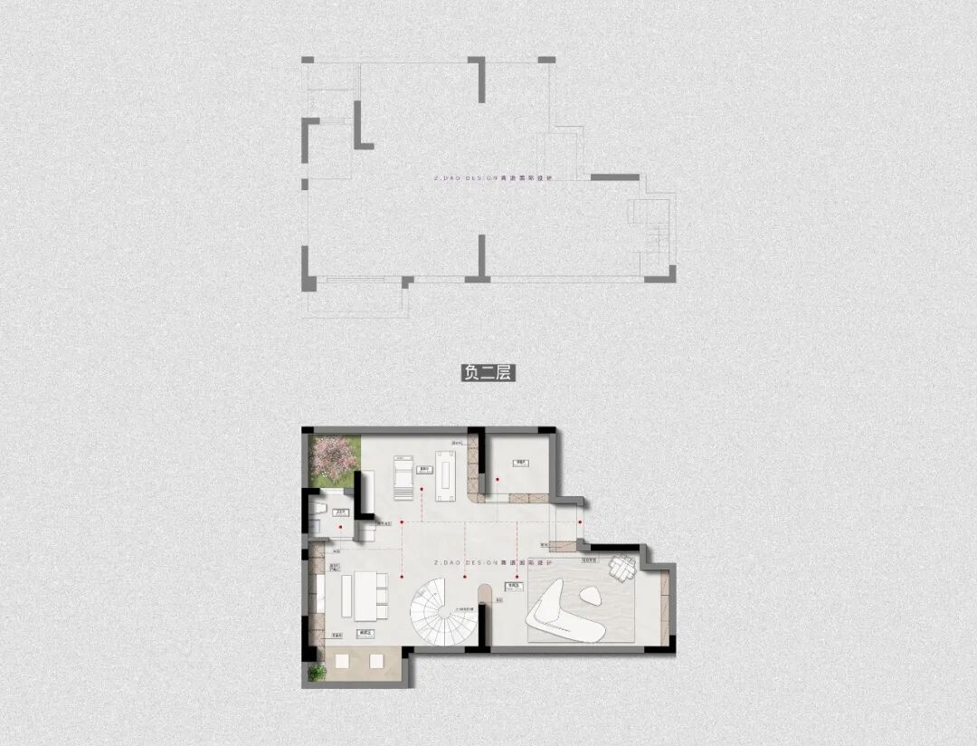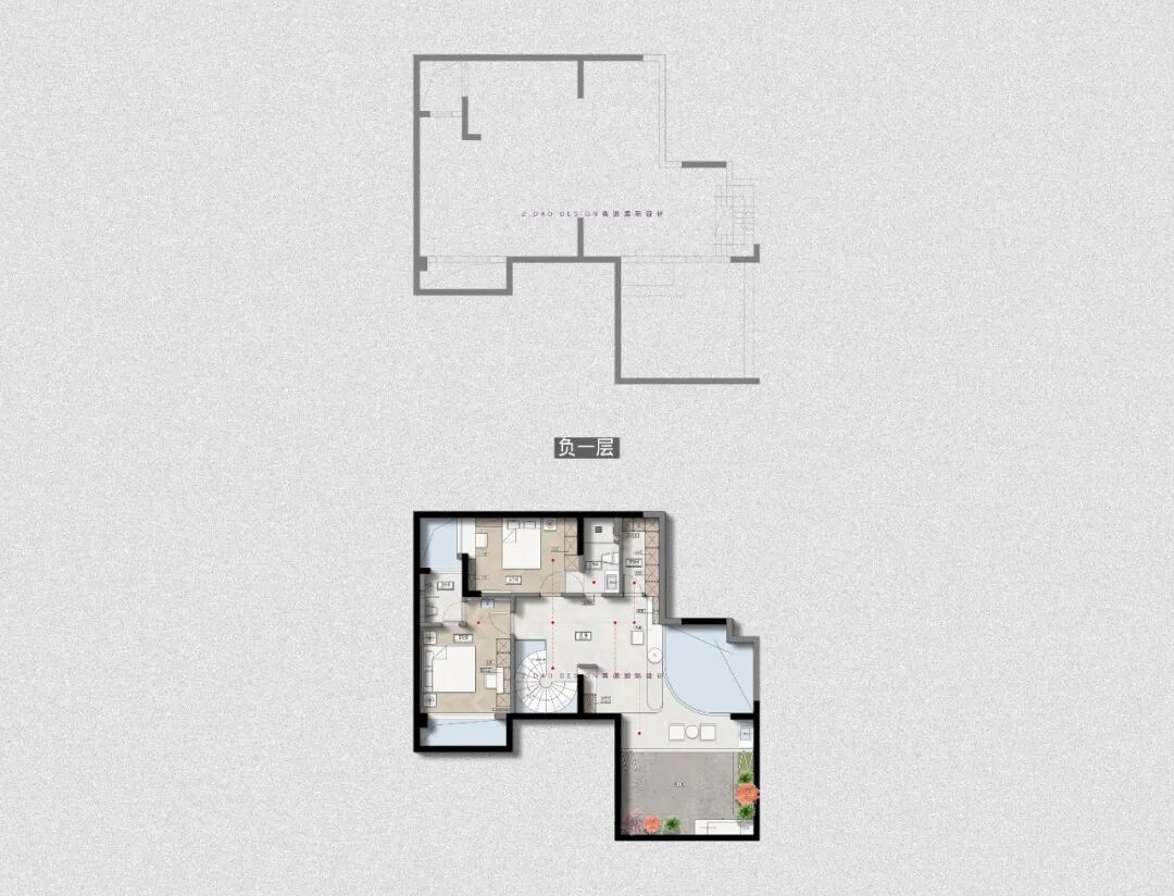 ➊光线不足,但带有一个户外庭院❷拆除原东南方向楼板层,将负一光线引入负二,解决负二光线不足的问题❸楼梯放置在阳光较弱的地方,将光线好的地方作为人的生活区域