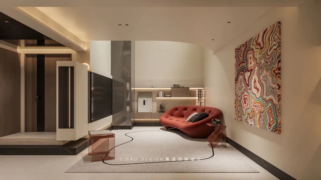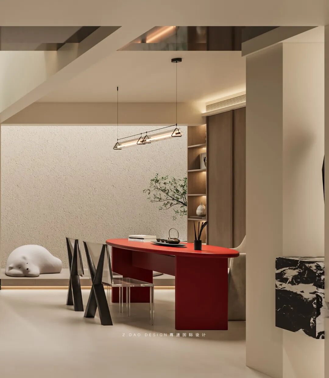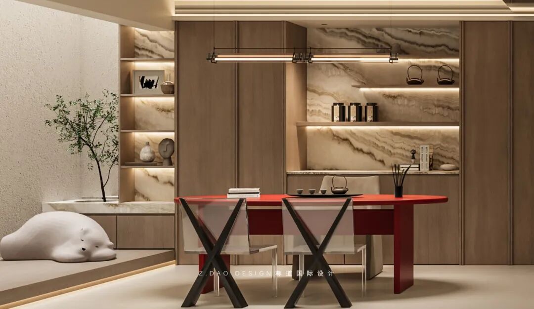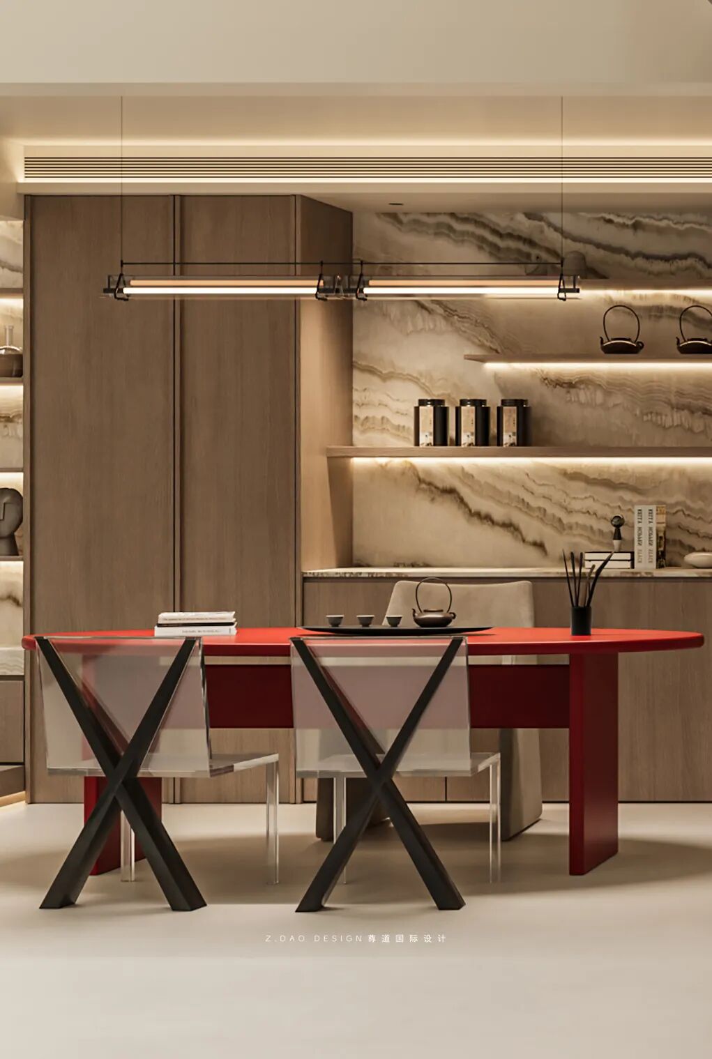 红色的茶桌与木质的柔和碰撞,这样的反差能让空间更有层次。