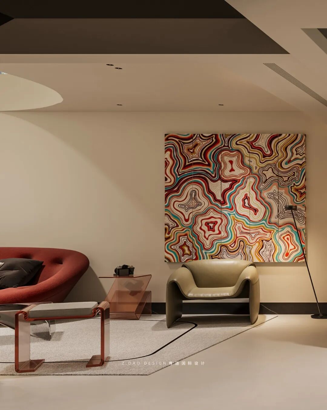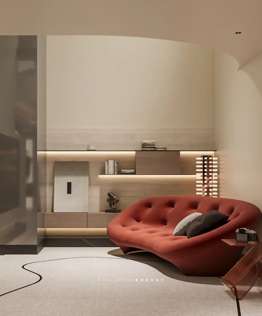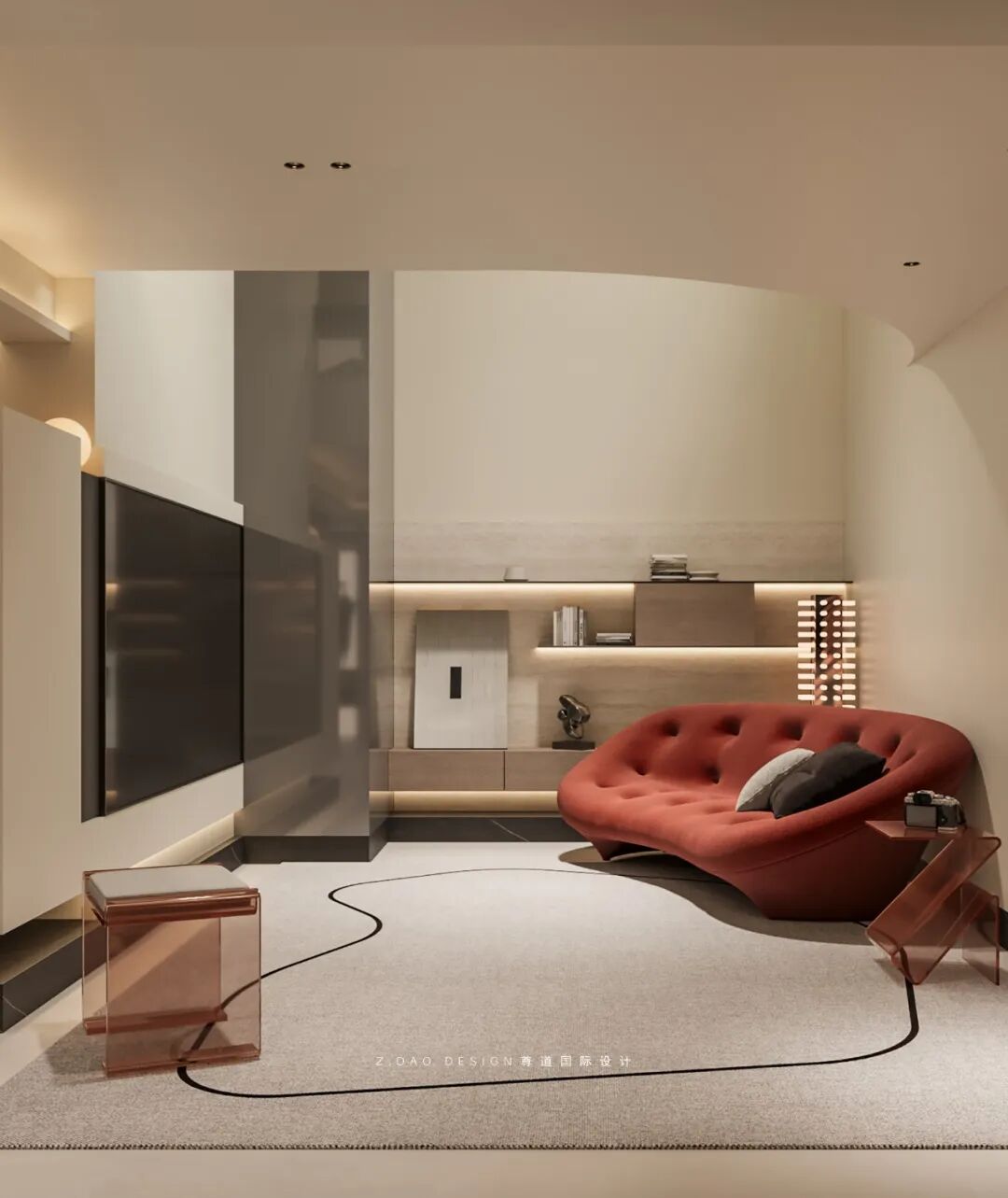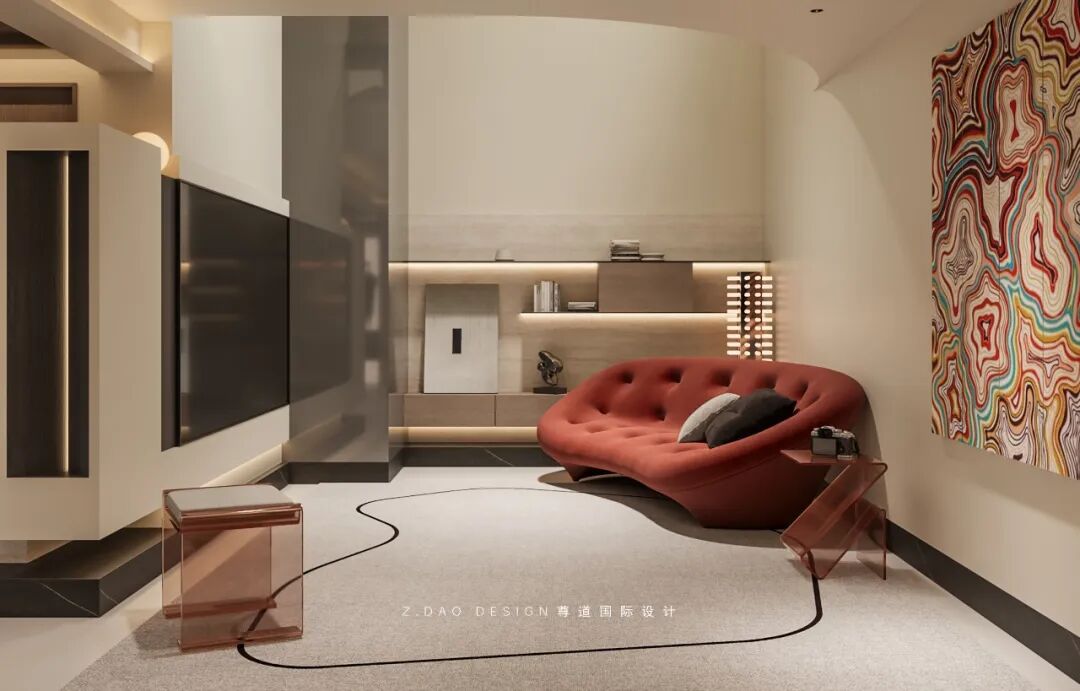 红色的茶桌与木质的柔和碰撞,这样的反差能让空间更有层次。