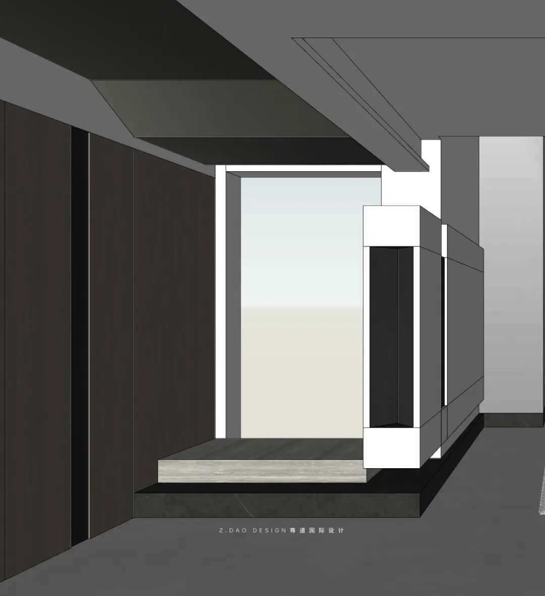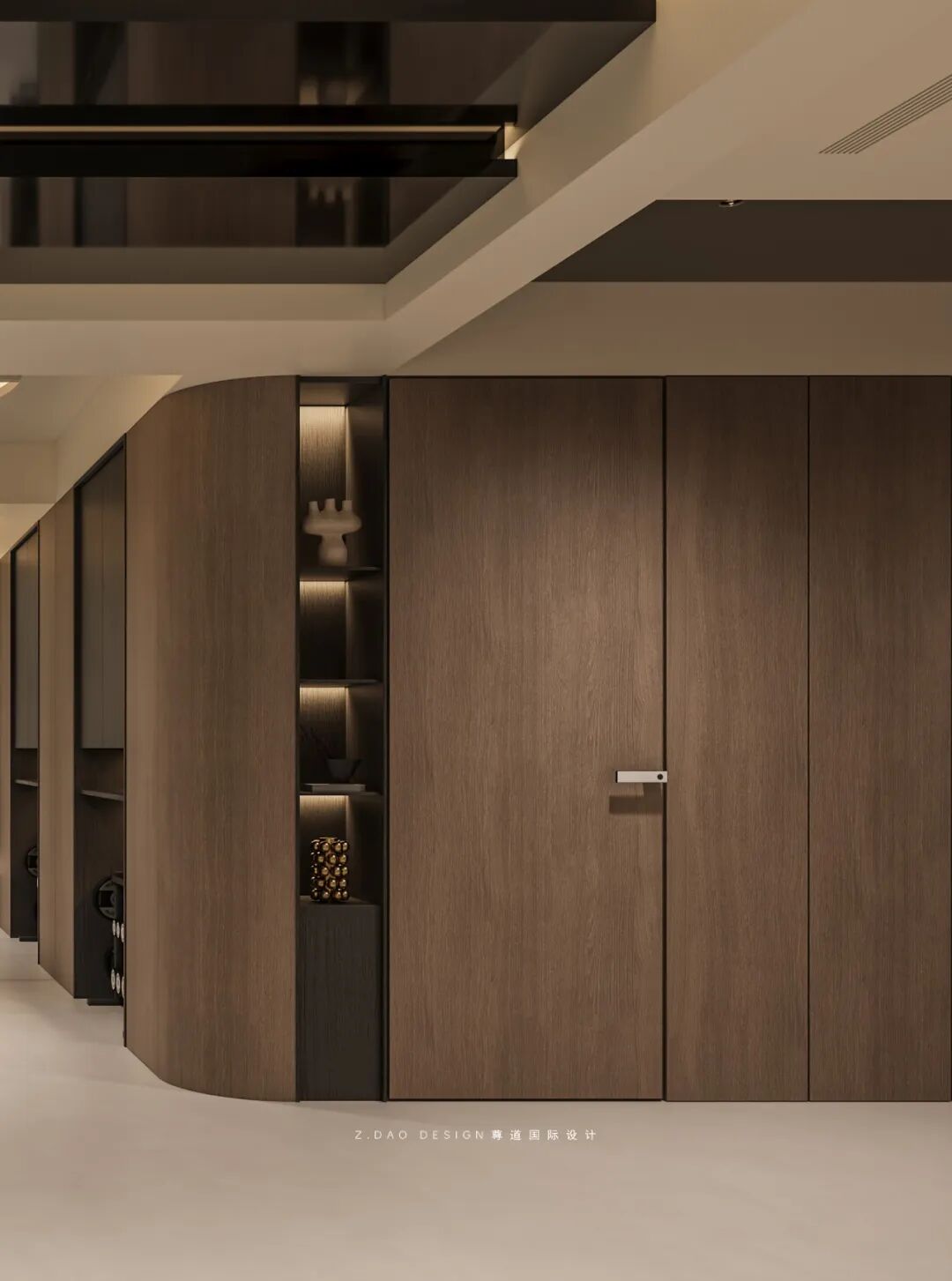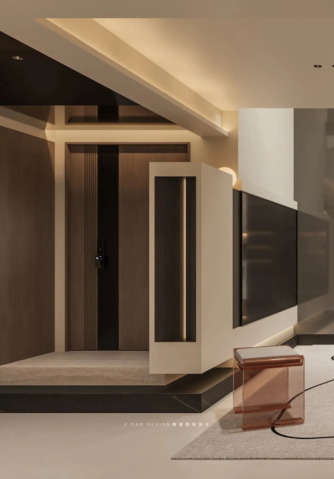 入户左右两侧分别用木饰面做了鞋柜与造型,兼具储物与整体美观性。