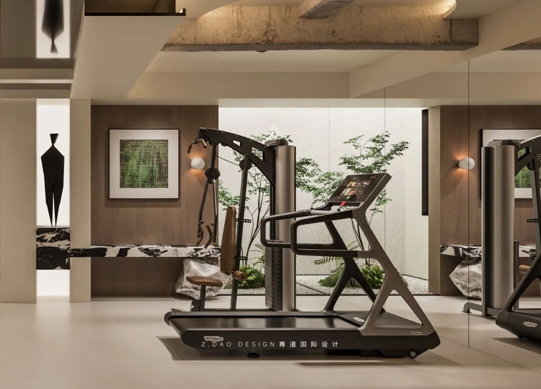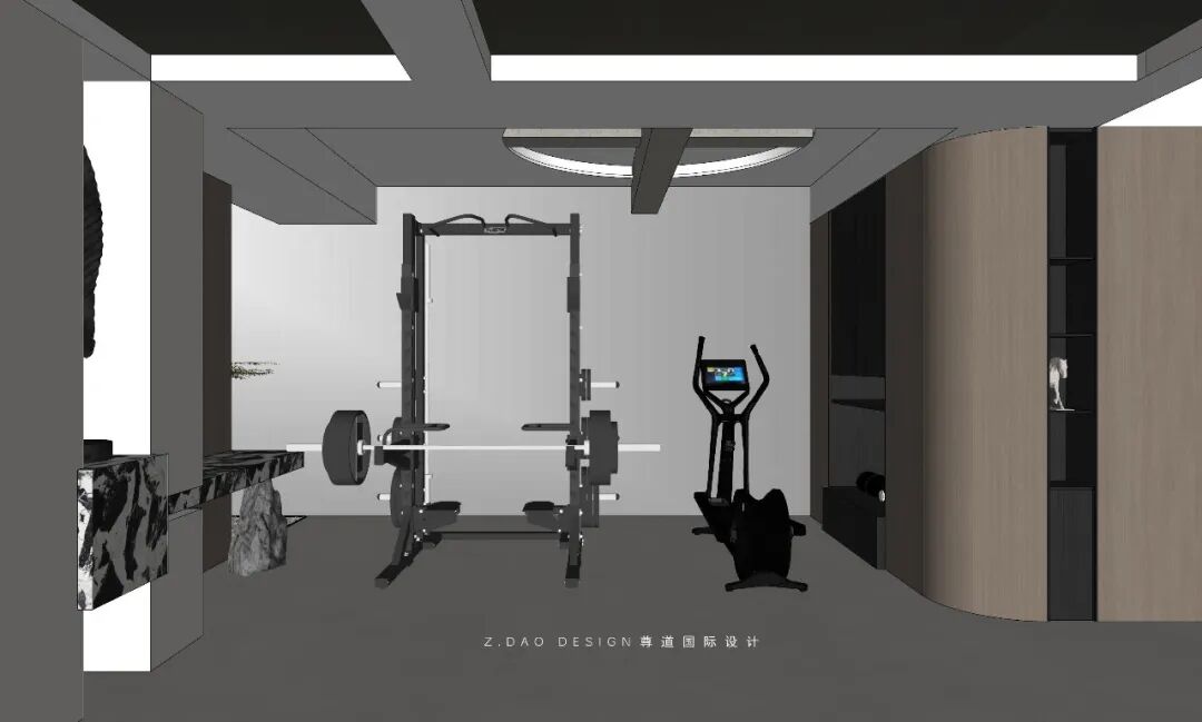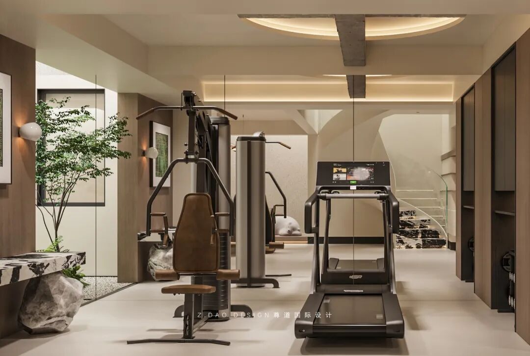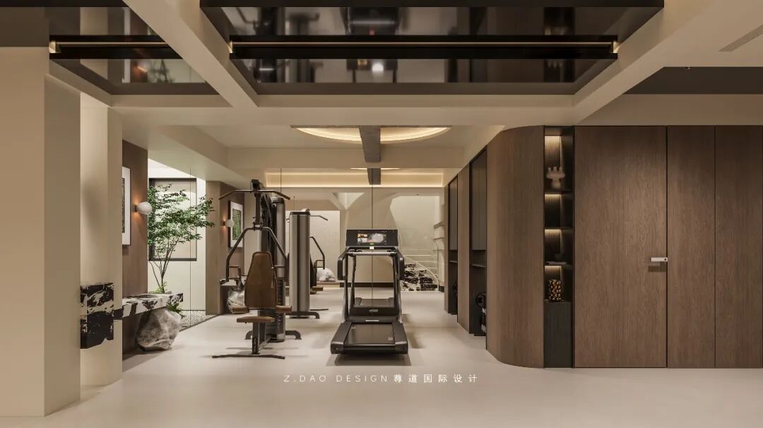 墙面安装整墙镜面,不但可以在健身过程中随时观察动作标准度,同时起到放大空间的作用。让空间能精准响应业主的生理需求、情感诉求与美学感受。