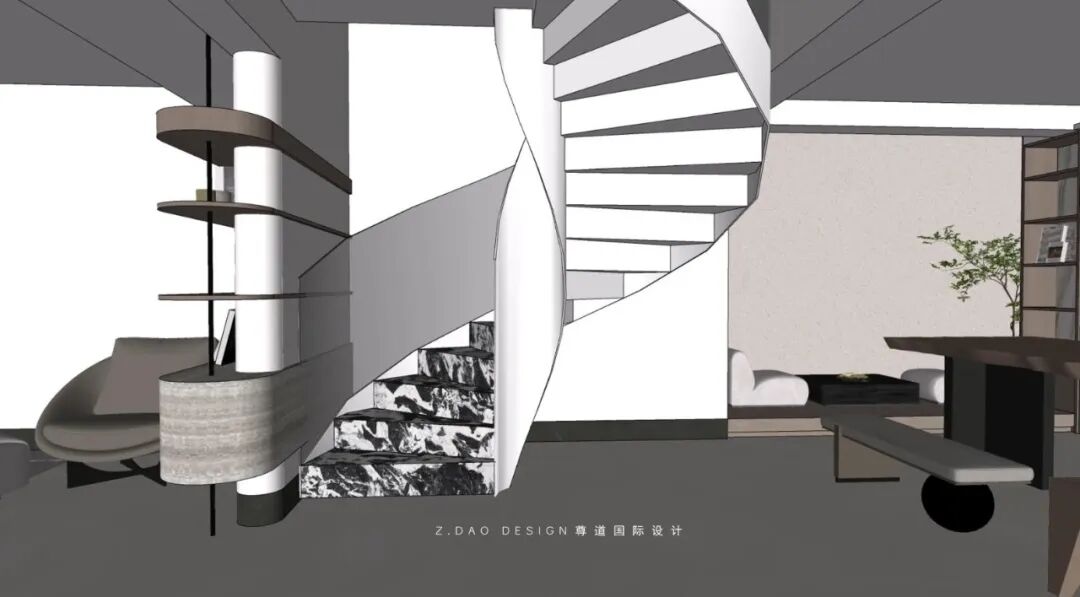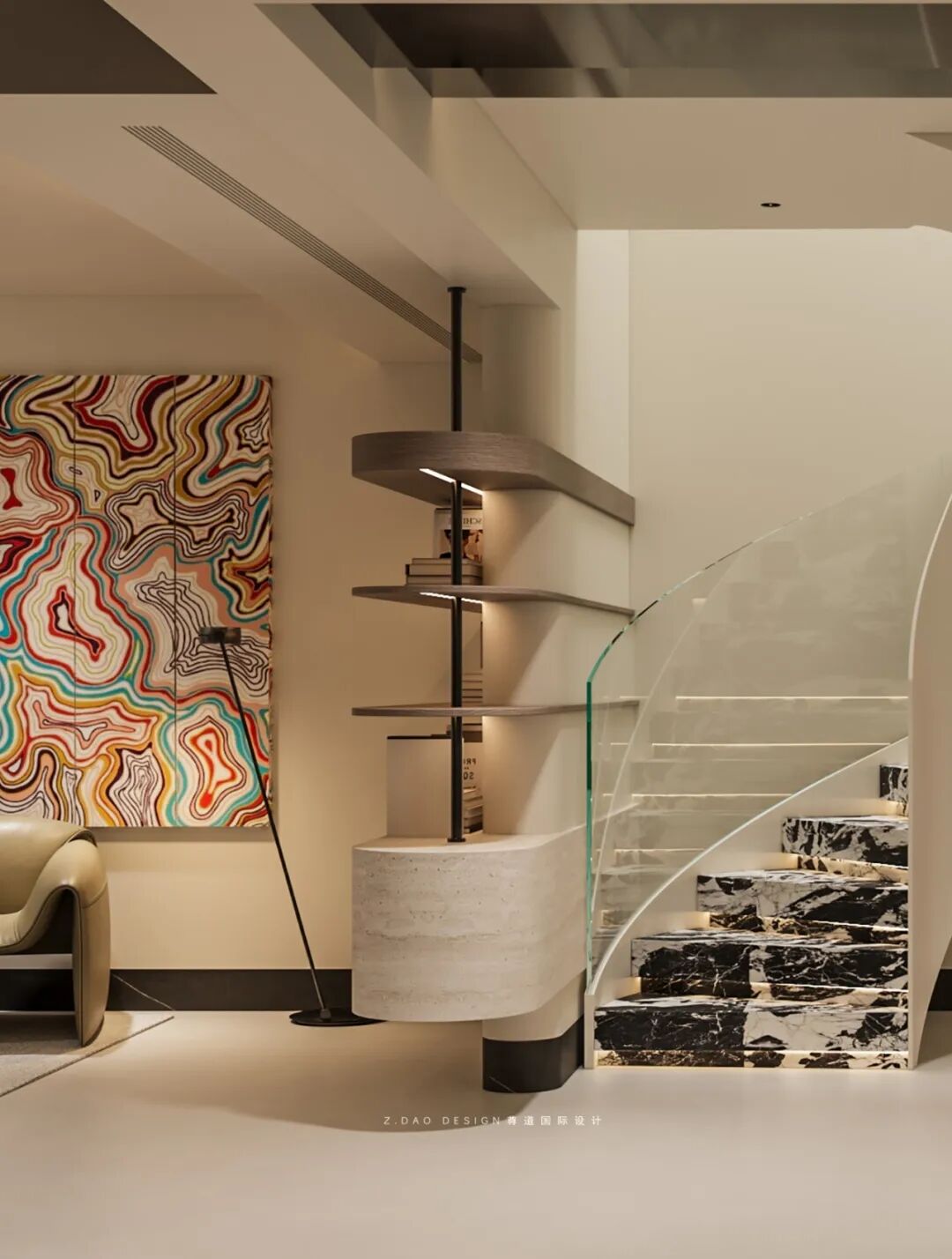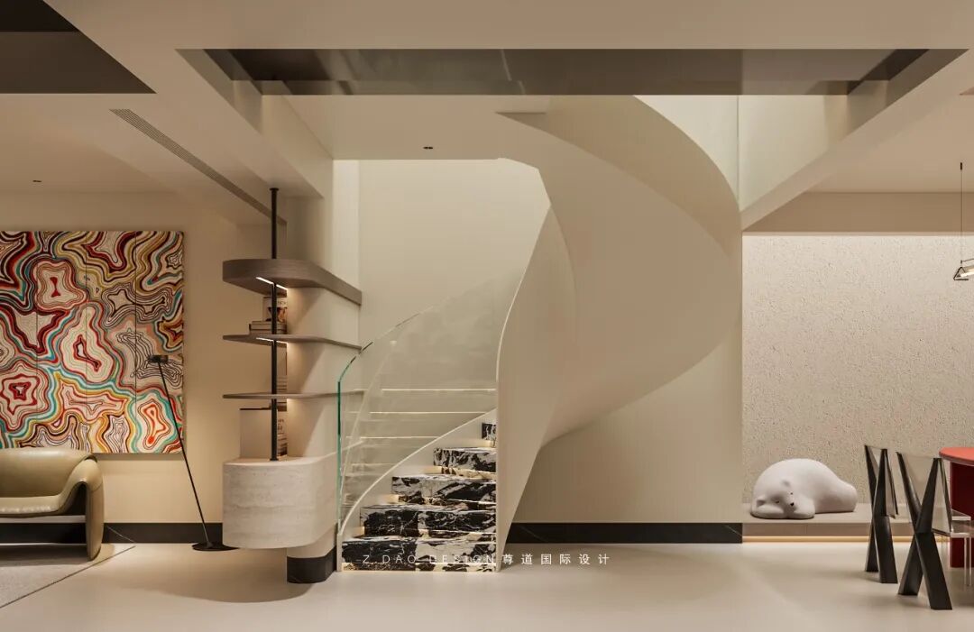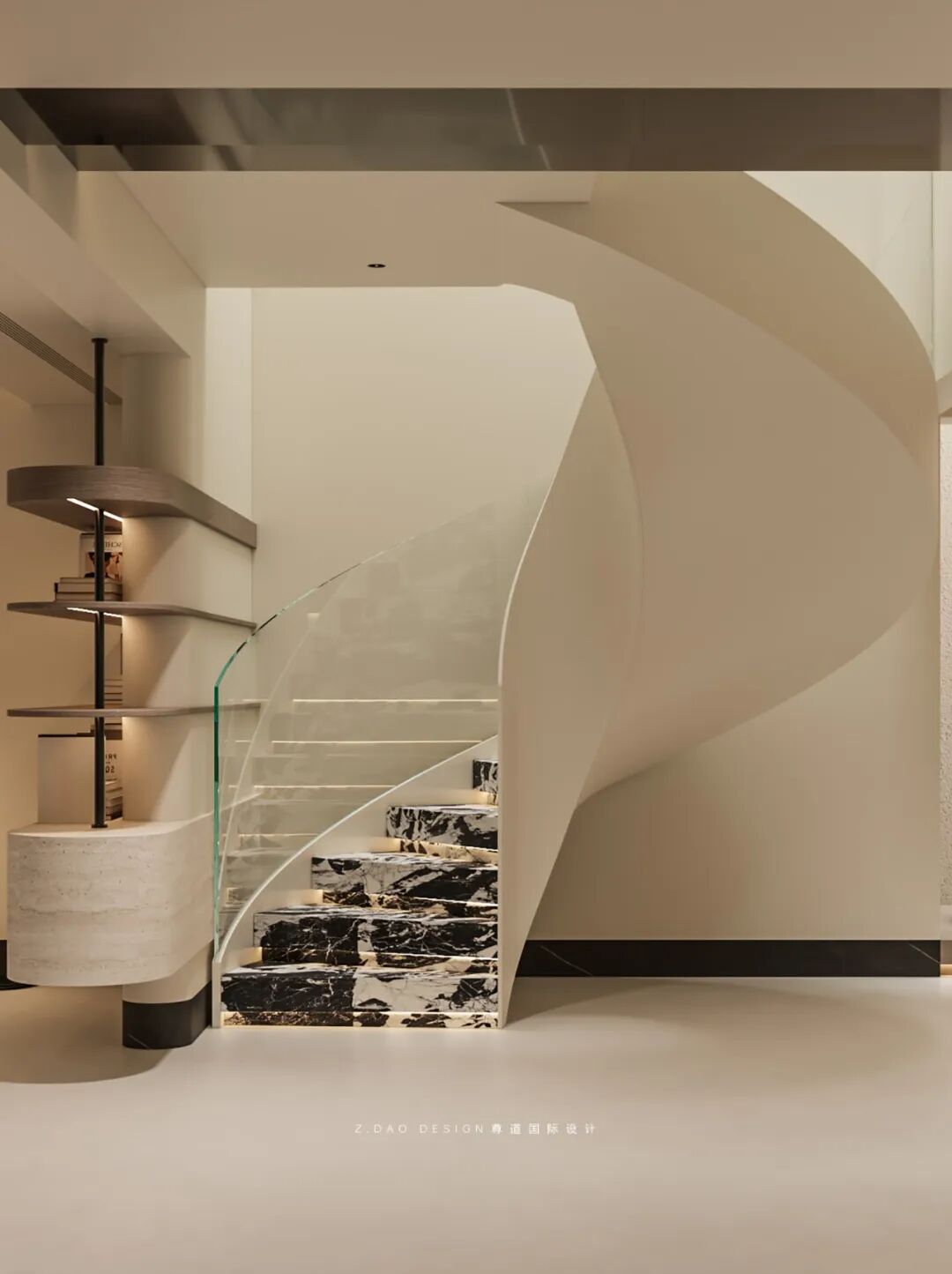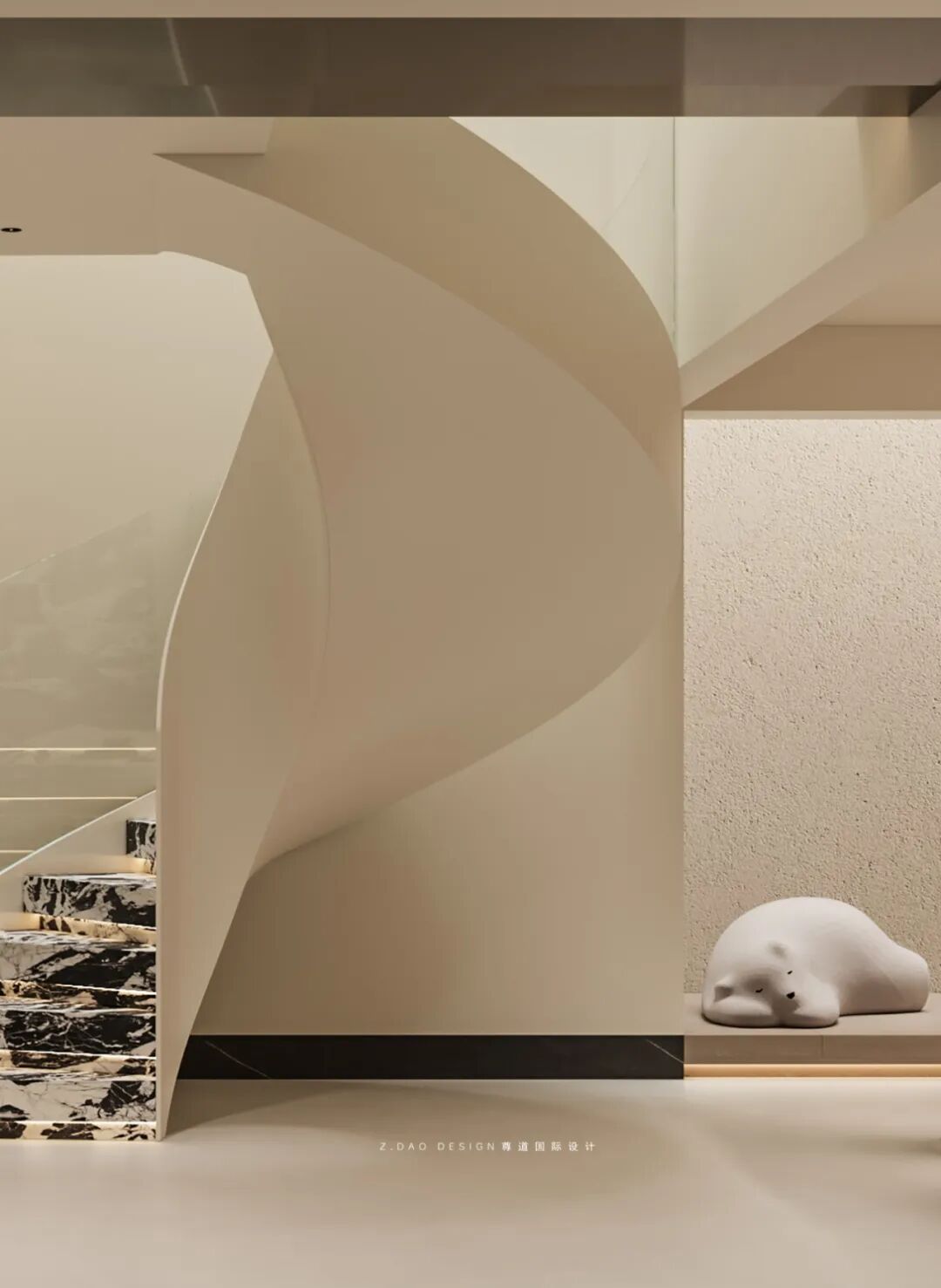 楼梯作为亮点被重点打造,将负二、负一、一楼以旋转楼梯作为链接,楼梯本身在空间中如同精巧的艺术装置,为空间增添灵动意境的同时,也让空间更有层次感。