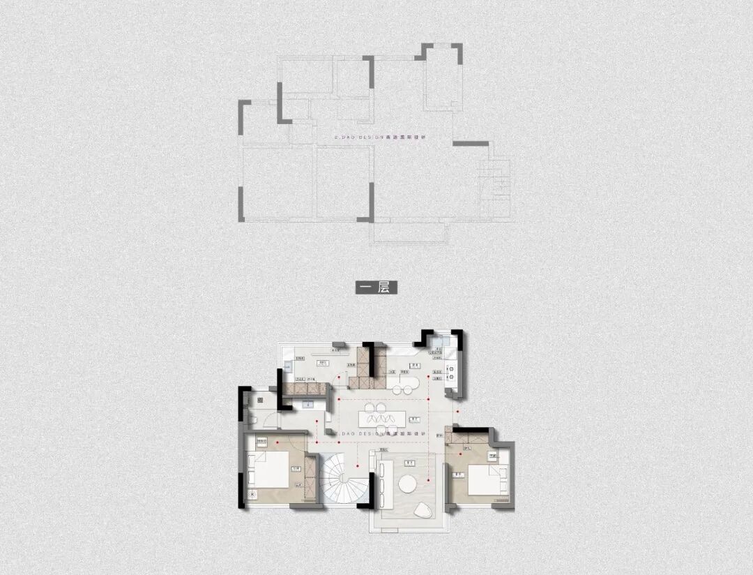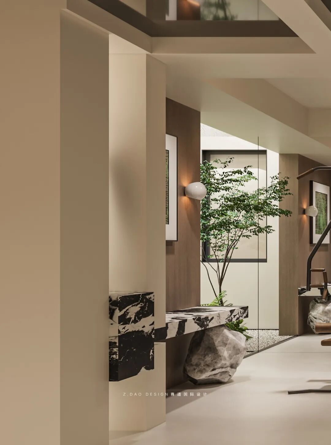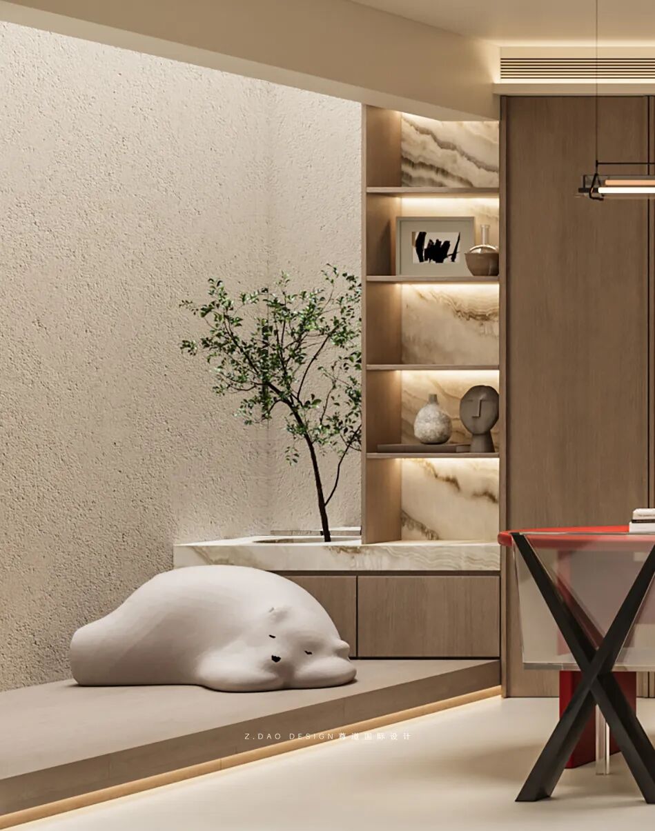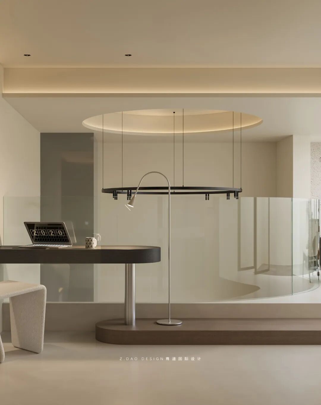 楼梯作为亮点被重点打造,将负二、负一、一楼以旋转楼梯作为链接,楼梯本身在空间中如同精巧的艺术装置,为空间增添灵动意境的同时,也让空间更有层次感。