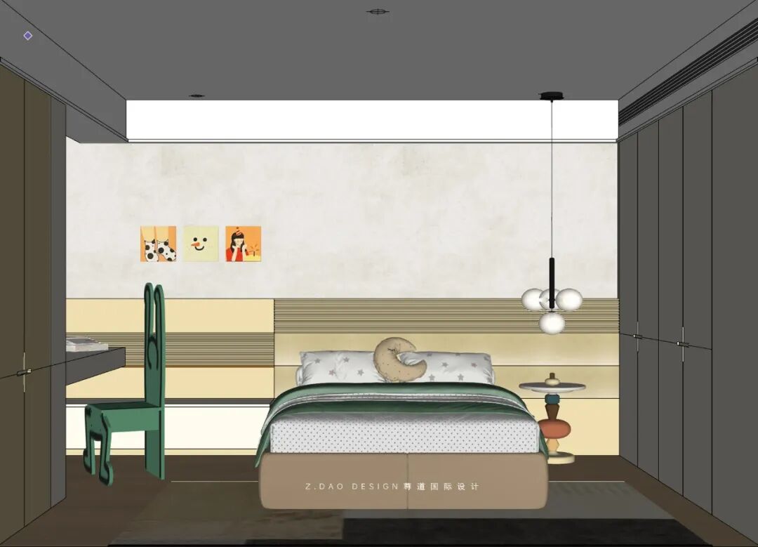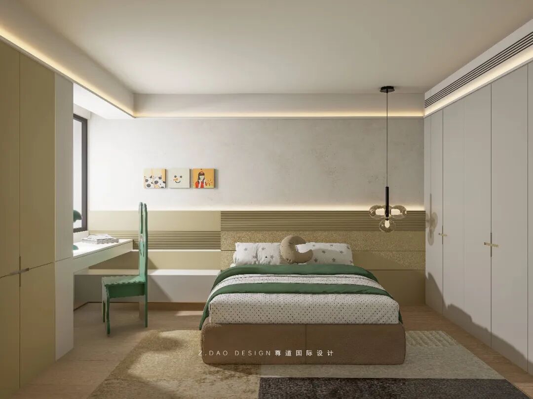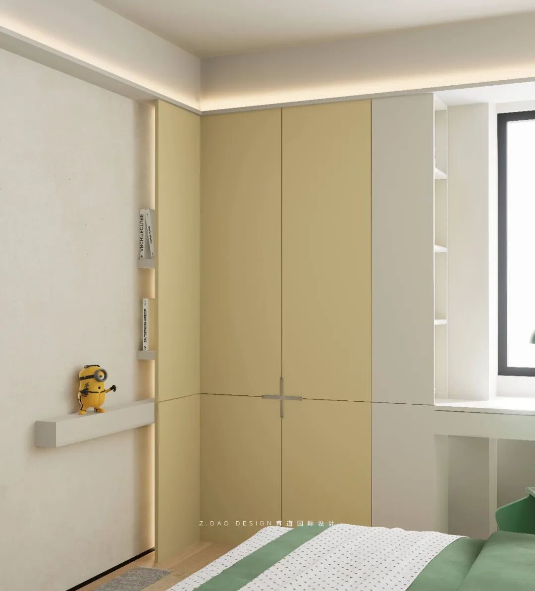 简约的黄色半墙硬包,搭配绿色的家具点缀,使这个空间清新温暖。没有安排复杂的造型和棱角,也没有做过于“童话”设计,看似简单又十分和谐,是一种包容性、可塑性都很强的卧室空间。