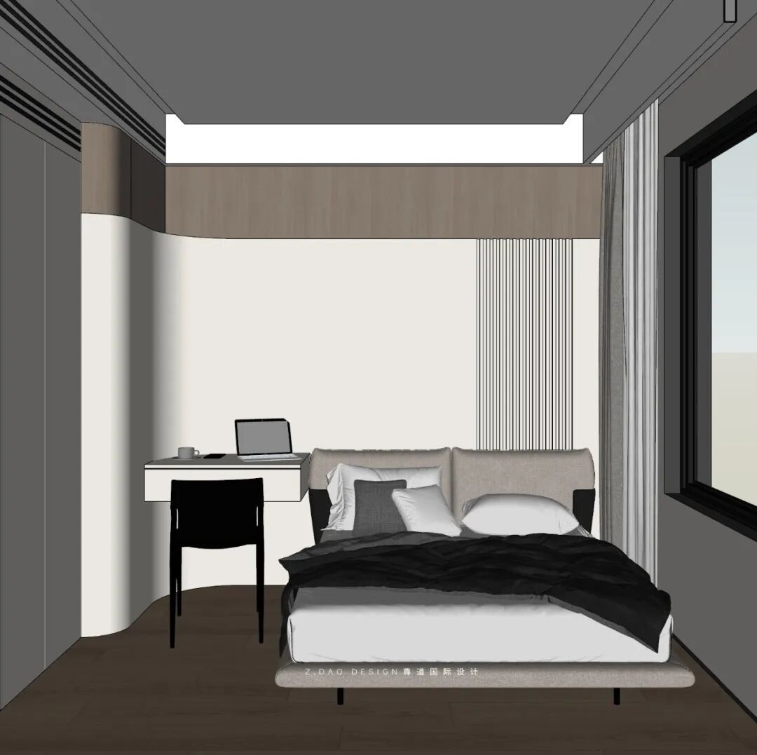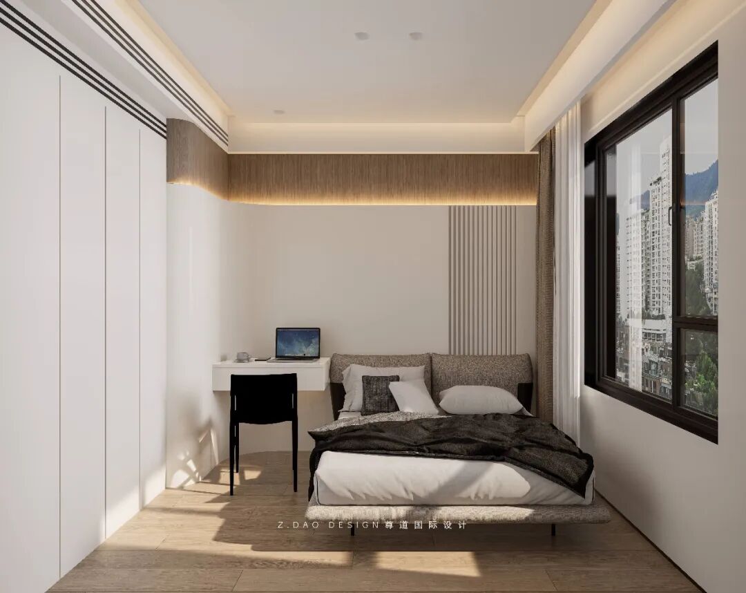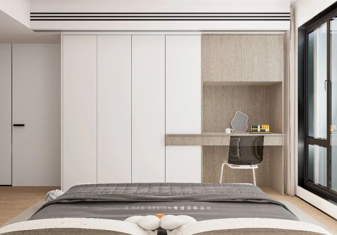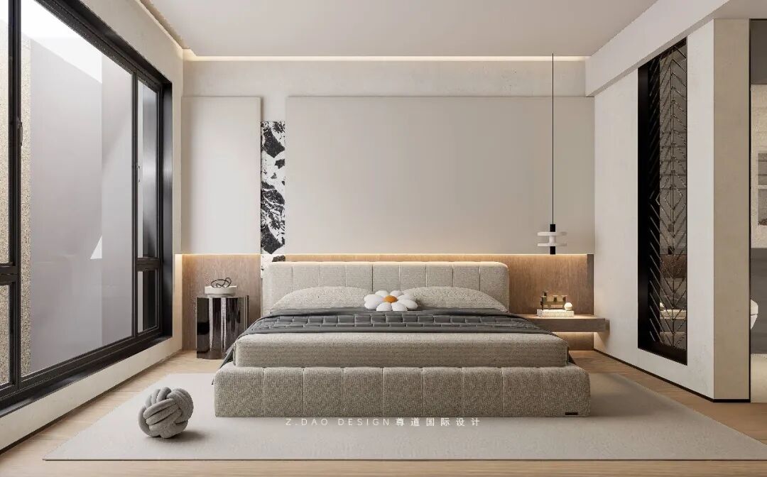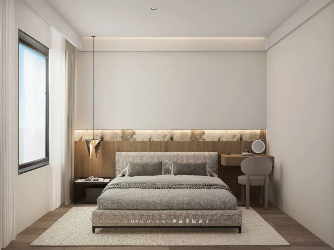 主卧继续以温润的基调延申空间的整体性。嵌入式的床头柜和灯带完美契合,柔和的灯光散落在室内,打造一处宁静的梦乡。