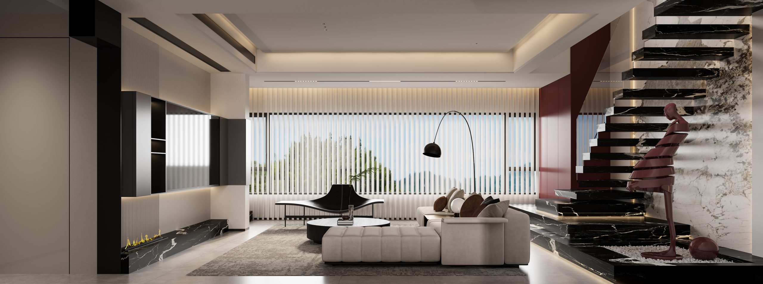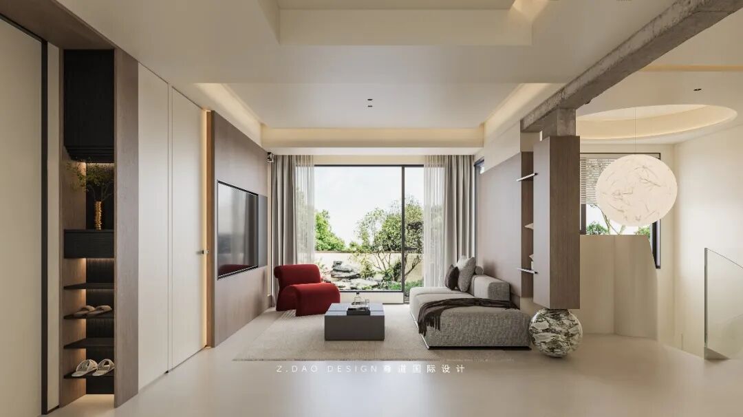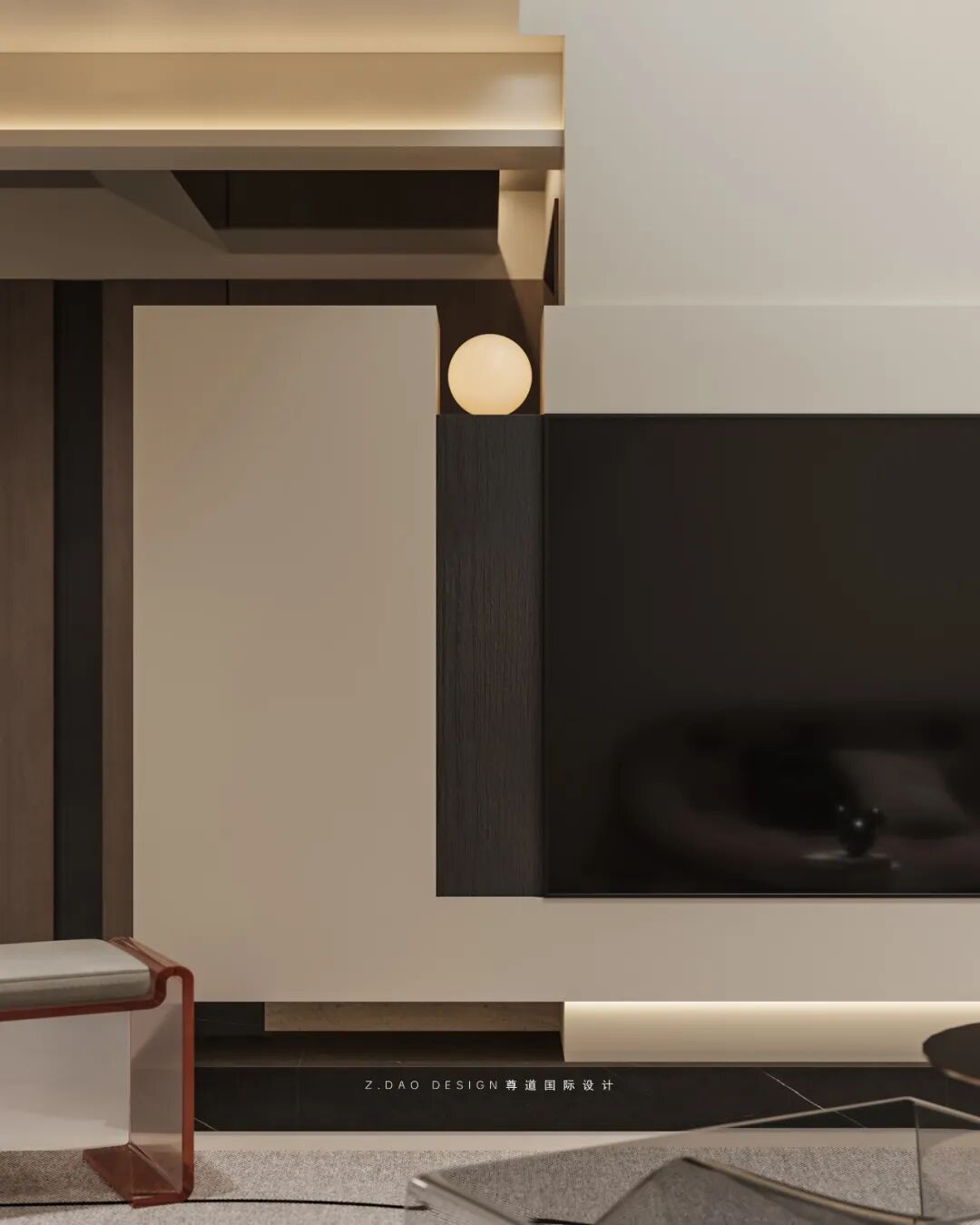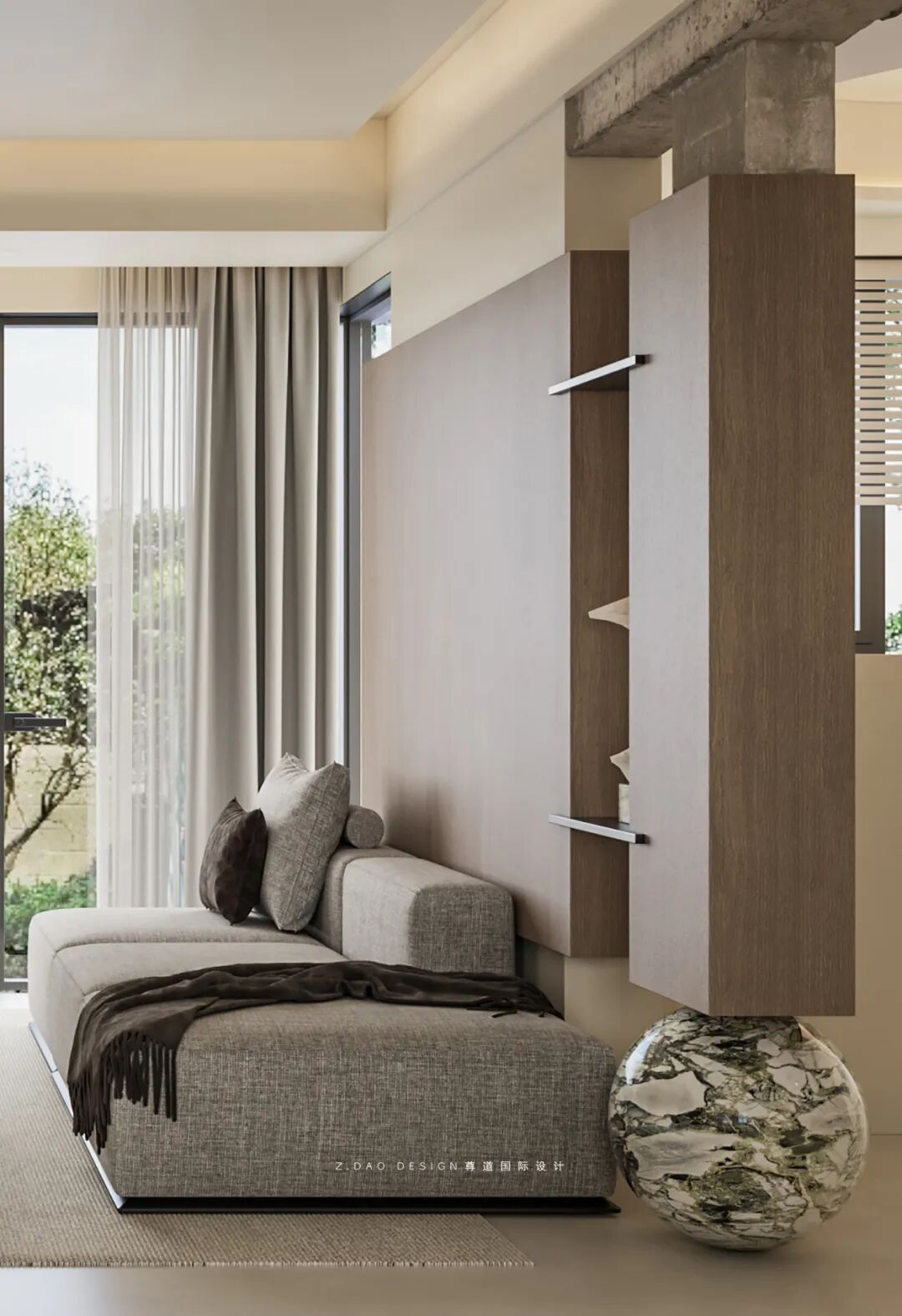 沙发墙悬空穿插造型,搭配球形,既让空间更显轻盈,又与楼梯间相互贯通,哑光感材质水泥灰梁柱体,天然的木质温和地流淌,少则单调,多则冗赘,一切都是恰到好处的营造。