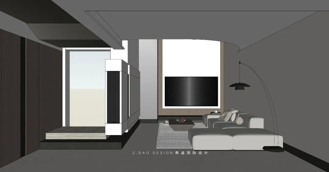 把阳台纳入客厅之后,整个空间变得更加通透、实用。电视背景墙用木色与黑色体块交织组合,搭配灯带形成丰富多维度的层次感,柔和的光线洒在家具以及人的身上,营造出温暖明快的氛围。