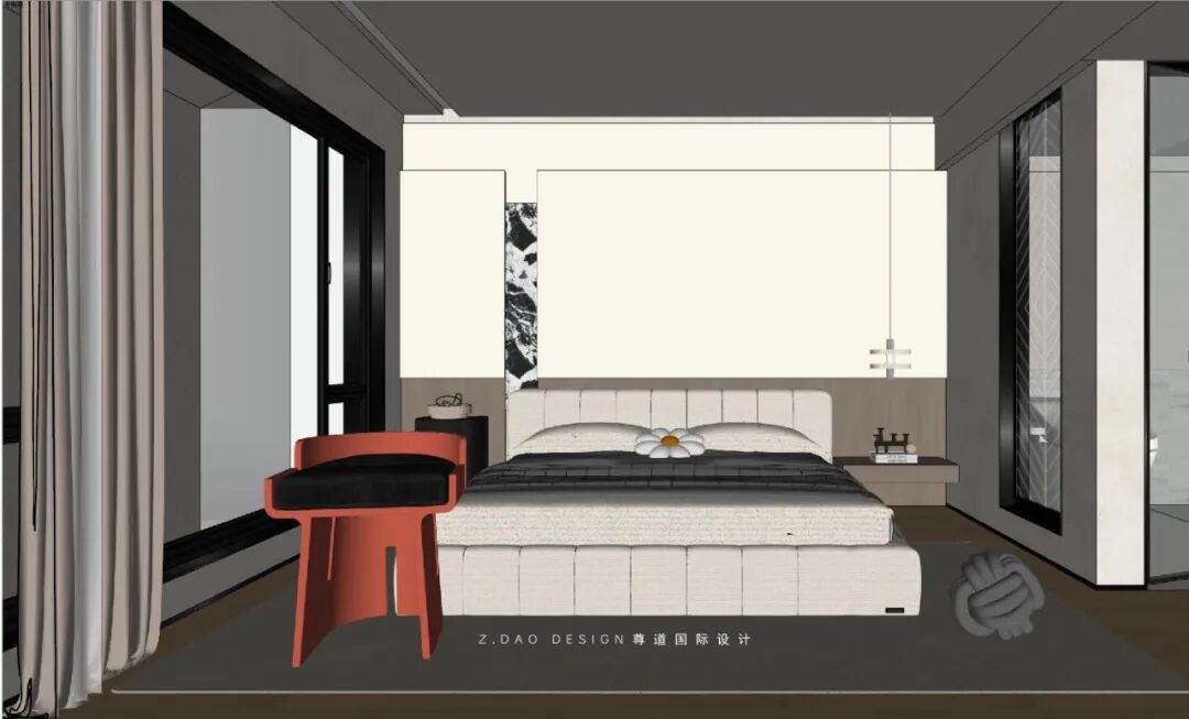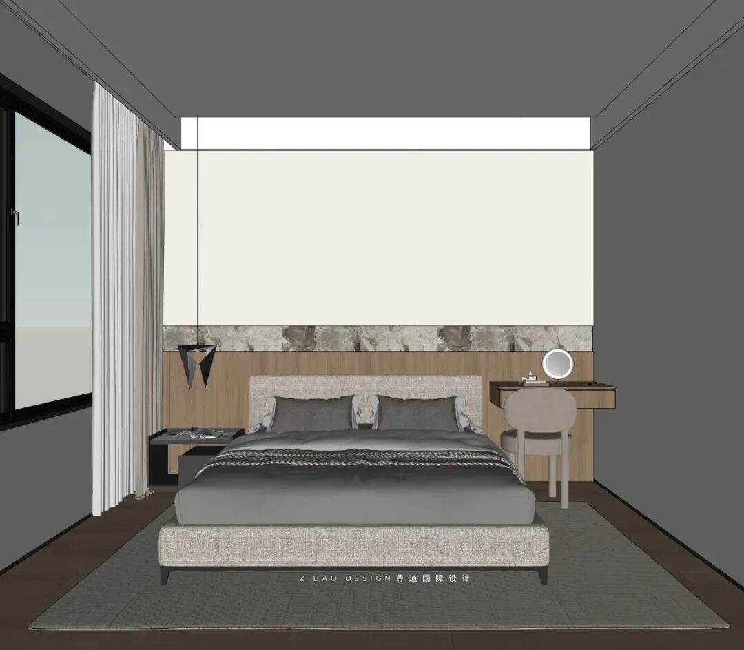 老人房卧室我们希望通过静谧的环境、柔和的感官包裹、为老人创造一个可以’软着陆’的空间。