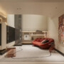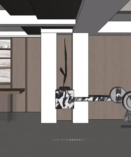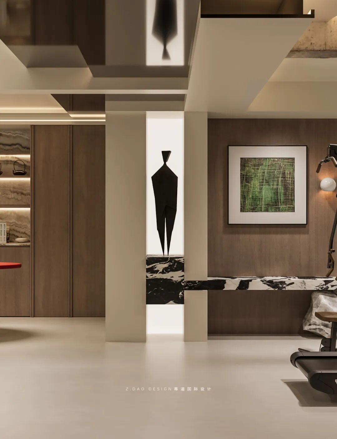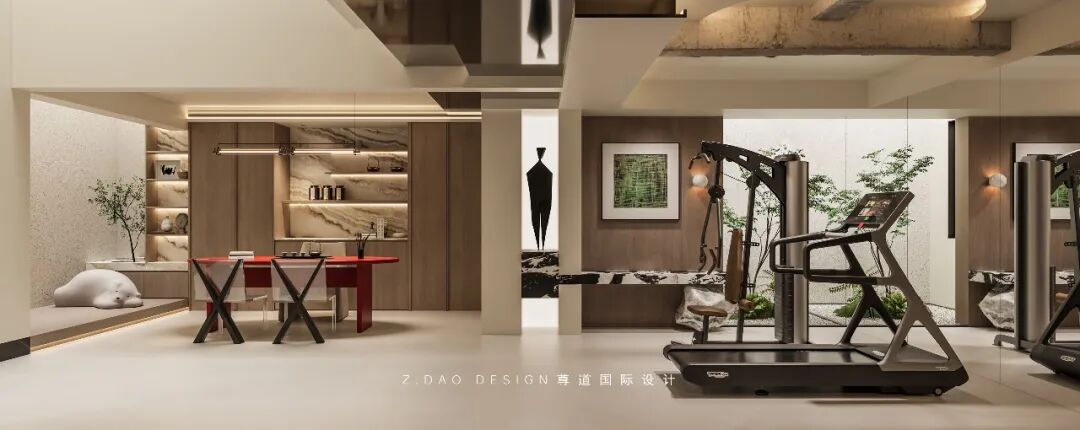 健身区与水吧区相连,引入了另一侧的天井采光,男主在水吧区喝茶,女主在健身区健身,孩子在休闲区玩耍,在开放的空间里,每一位家庭成员都能找到自洽的角落。